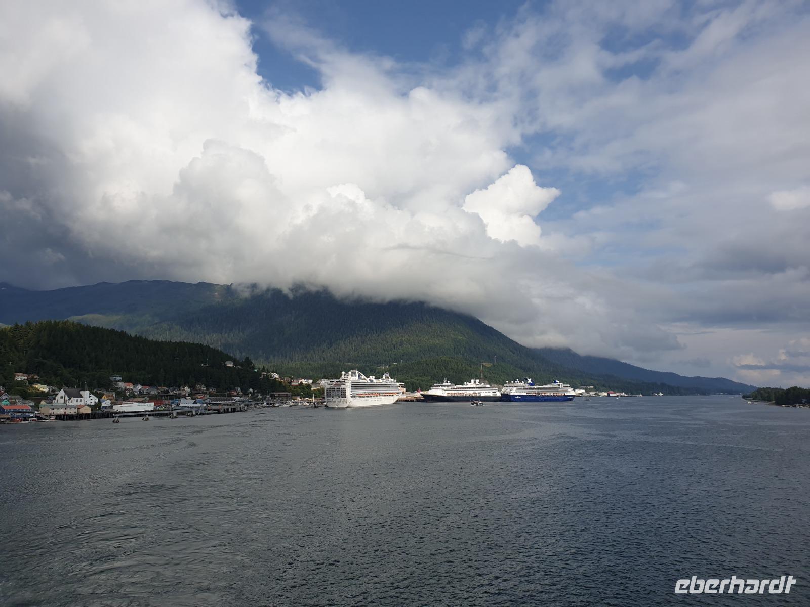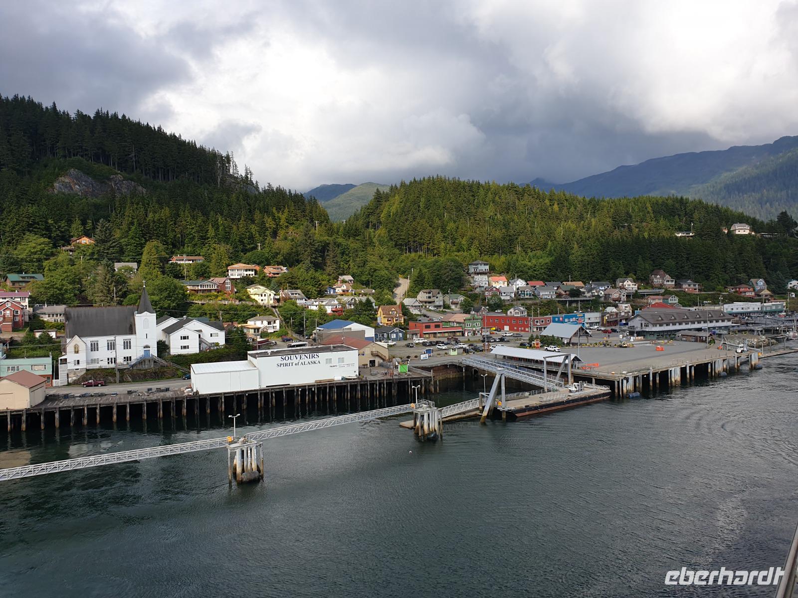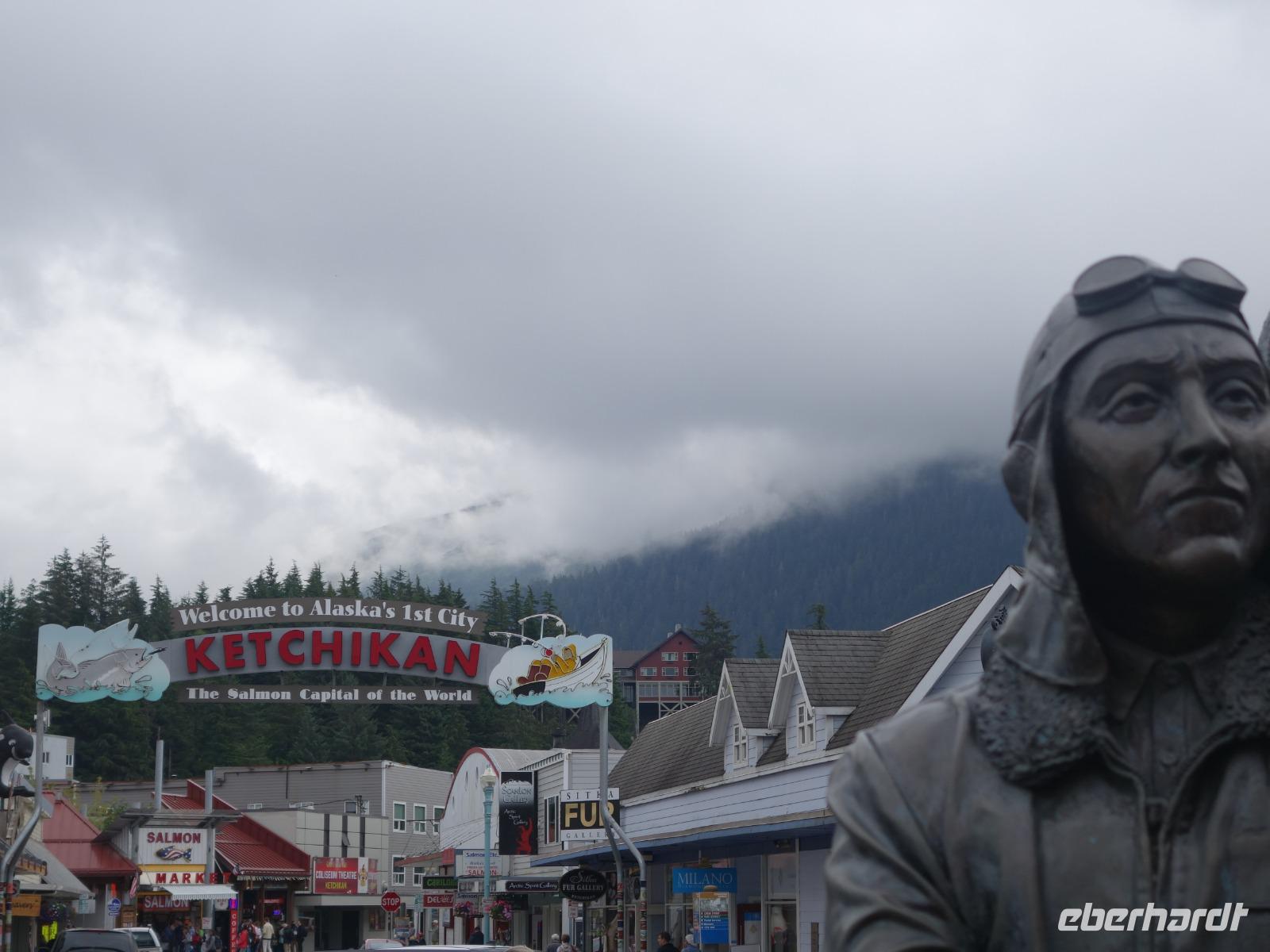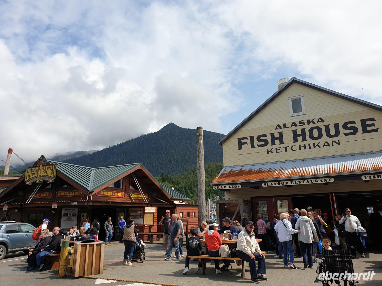 Ketchikan ist die südlichste Stadt in Alaska mit ca. 13.000 Einwohnern und lebt eben auch hauptsächlich vom Fischfang. Von hier gehen jährlich Millionen von Lachs in die ganze Welt, welche man auch in der Stadt an allen Ecken kaufen und probieren kann. Die erste Lachsverarbeitungsfabrik entstand 1886 bis dann 1898 das erste Gold gefunden wurde und mehr Leute auf der Suche nach dem goldenen Reichtum nach Ketchikan kamen.