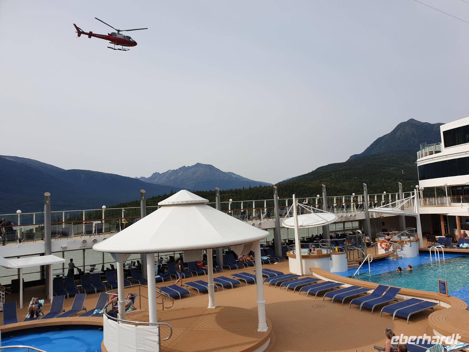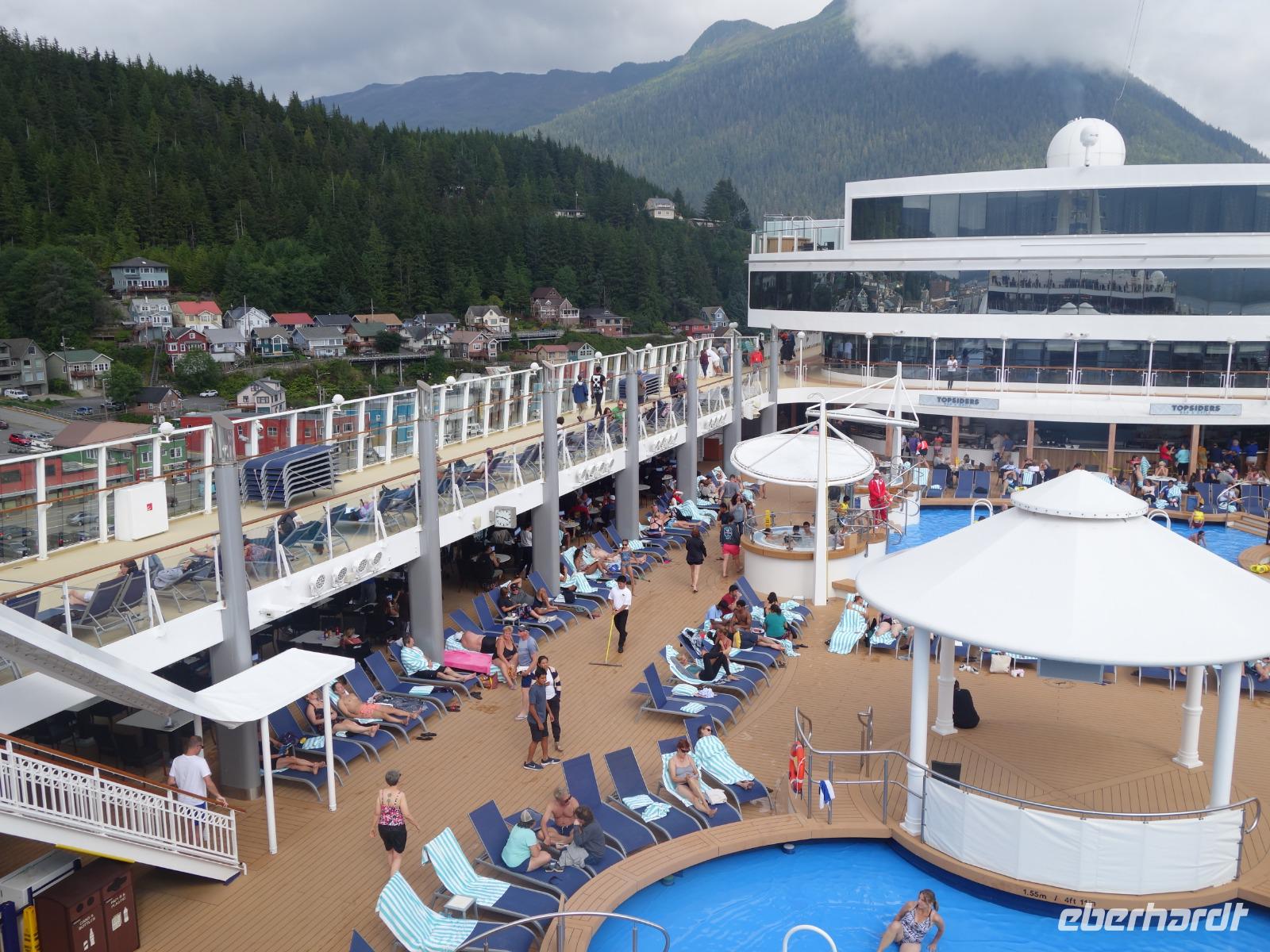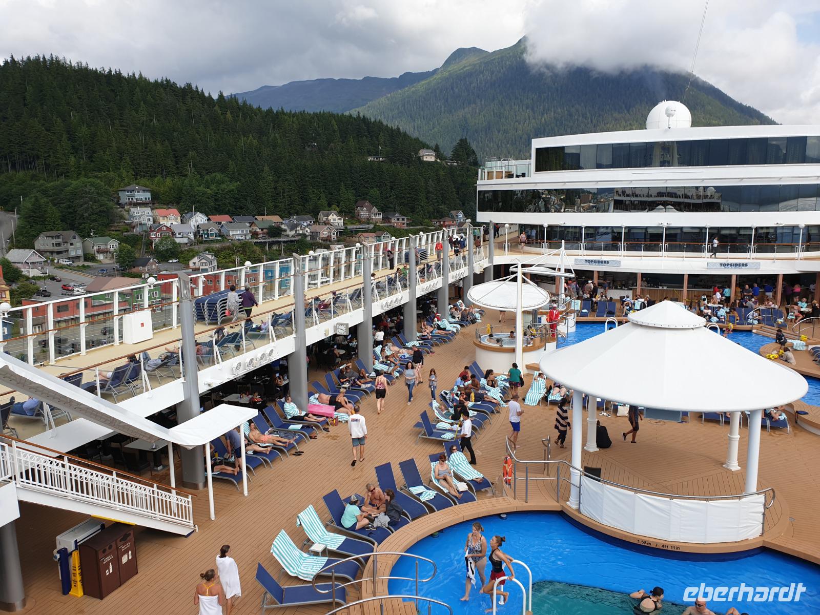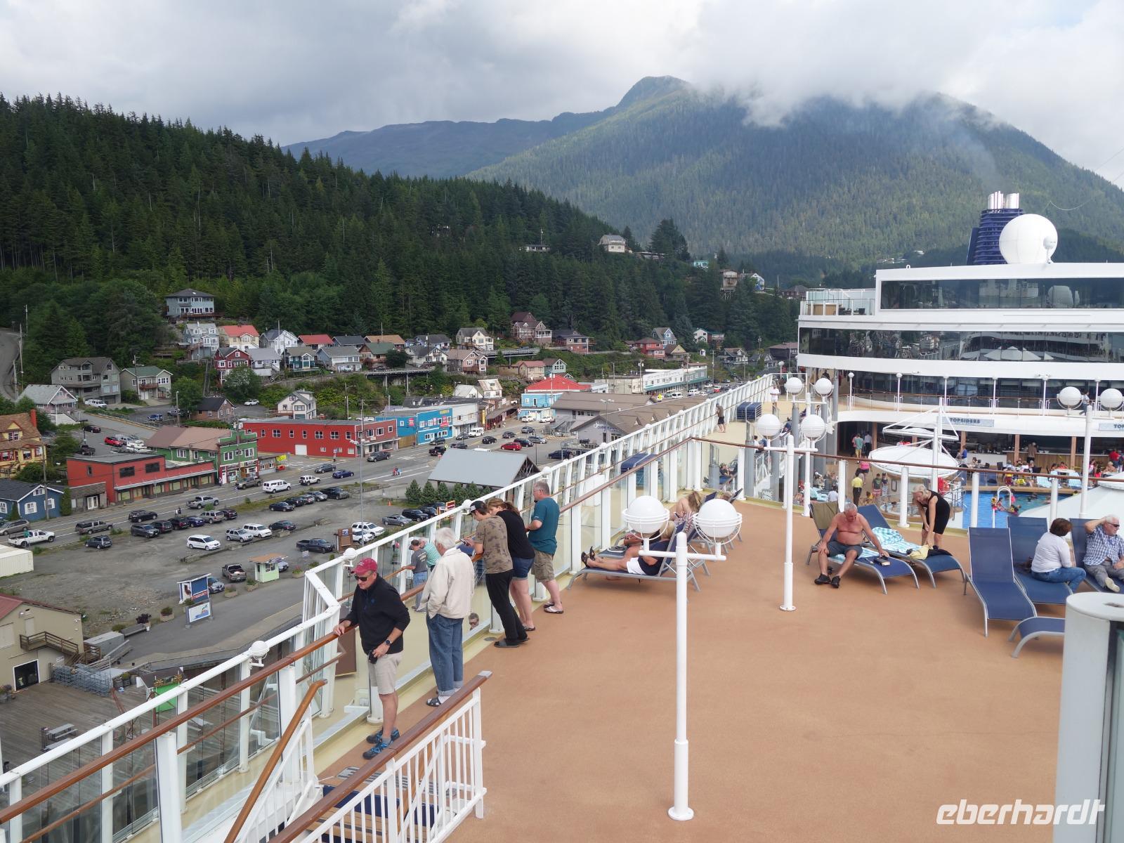 Wir haben Glück mit unserem Aufenthalt in Ketchikan! Es ist eine Stadt mit 240 Regen Tagen im Jahr, aber heute lässt sich sogar die Sonne blicken. Es wird direkt gleich warm und wir können dies entweder an Land oder auf unserem Sonnendeck genießen. Also Zeit zum Entspannen und Genießen.