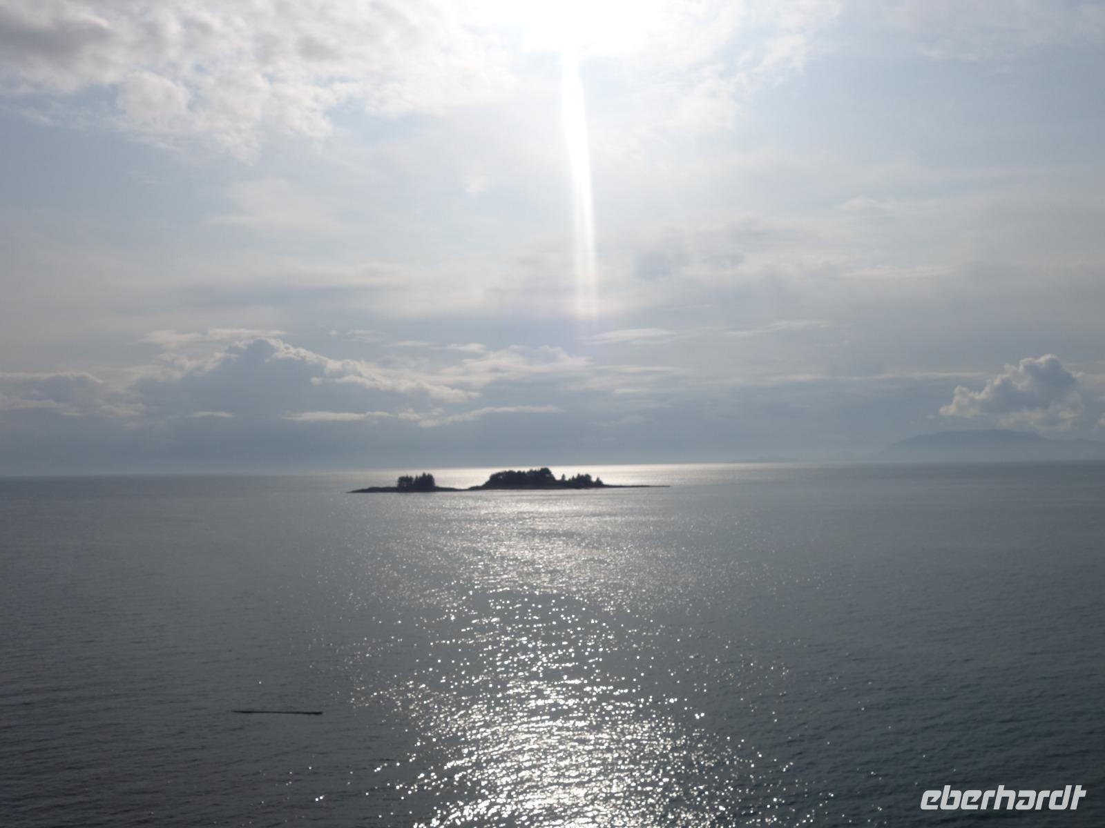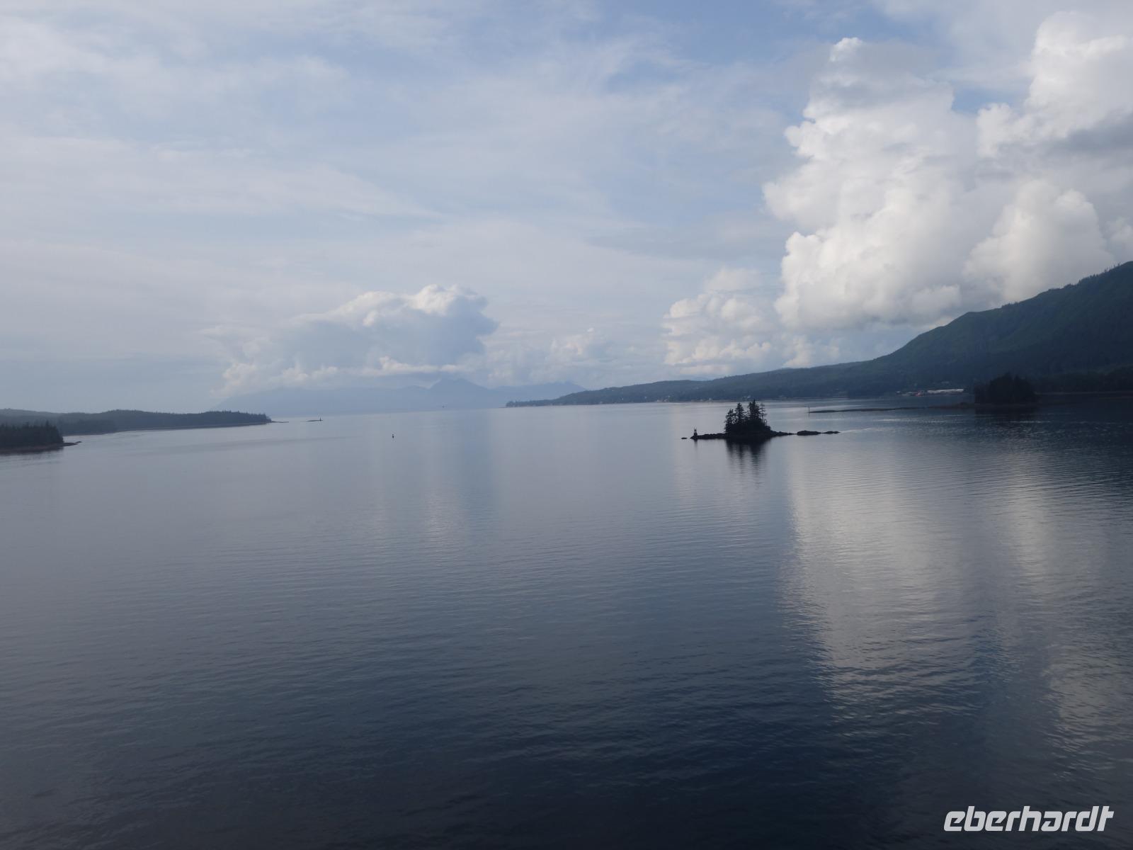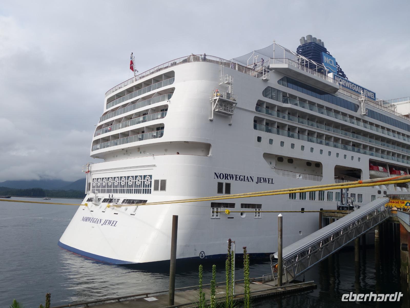 Unser erster Tag auf See. Zur Orientierungshilfe auf dem Schiff machen wir erst einmal eine kleine Führung mit Monika, unserer deutschsprachigen Ansprechpartnerin auf dem Schiff. Die „Norwegian Jewel" wurde 2005 in Deutschland bei der Meyer Werft in Papenburg nicht weit von Hamburg fertiggestellt. Der Bau dauerte 2 Jahre und die Schiffsdame kostete 420 Millionen US Dollar (heute ca. 475 Mill. €). Auf dem Schiff ist Platz für ca. 2.300 Passagiere und ca. 1.200 Crew Mitglieder aus 60 verschiedenen Ländern. Heute haben wir genug Zeit, um das Schiff voll und ganz zu erkunden und zu genießen bevor es dann an den nächsten Tagen auf Landgang geht. Zu sehen gibt es außerdem immer etwas, da wir ganz nah an der Küste entlangfahren und auf unserem Weg nach Ketchikan zahlreiche Passagen durchqueren wie bspw. die Seymour Enge (engste Stelle: 750m).