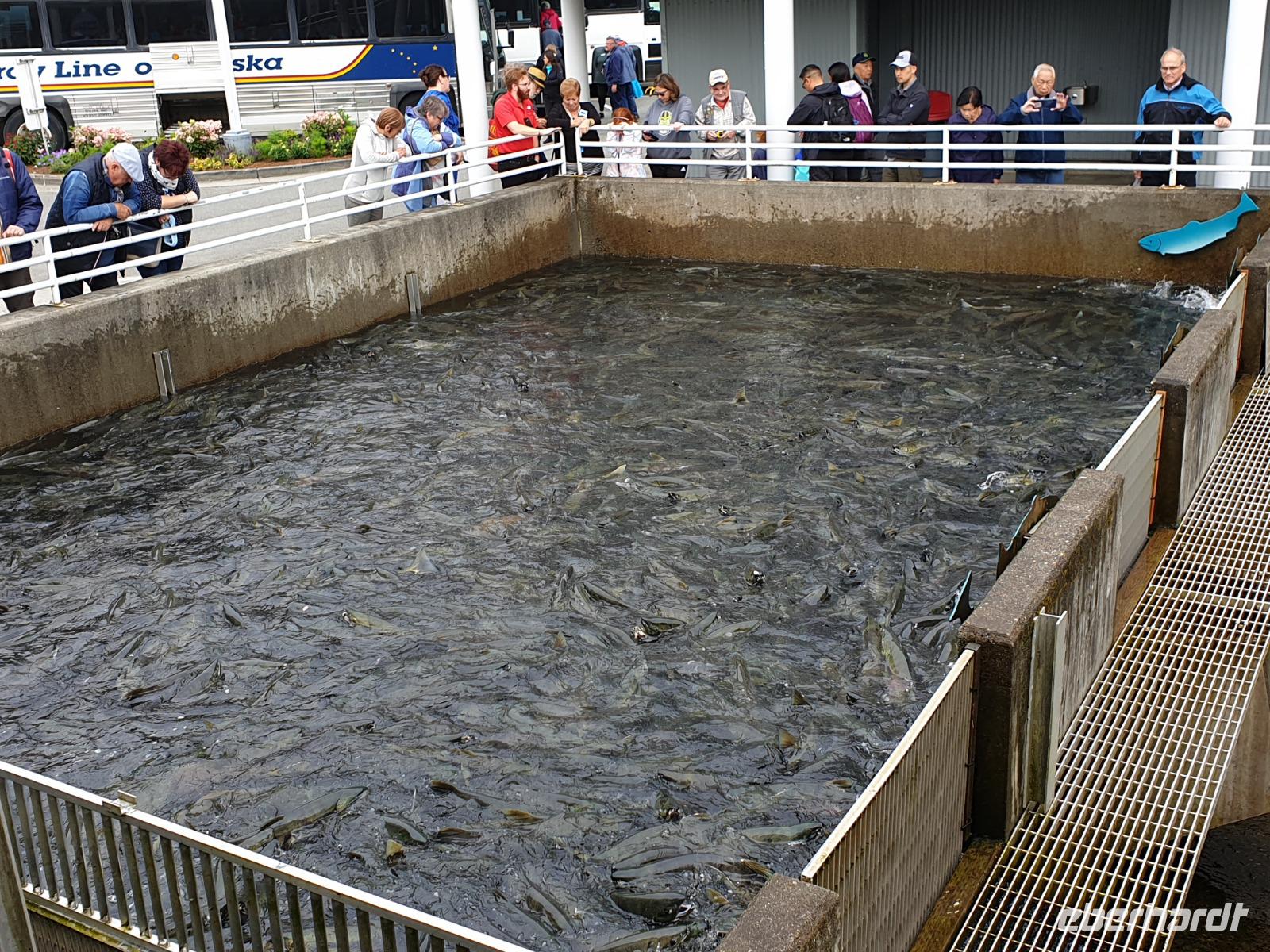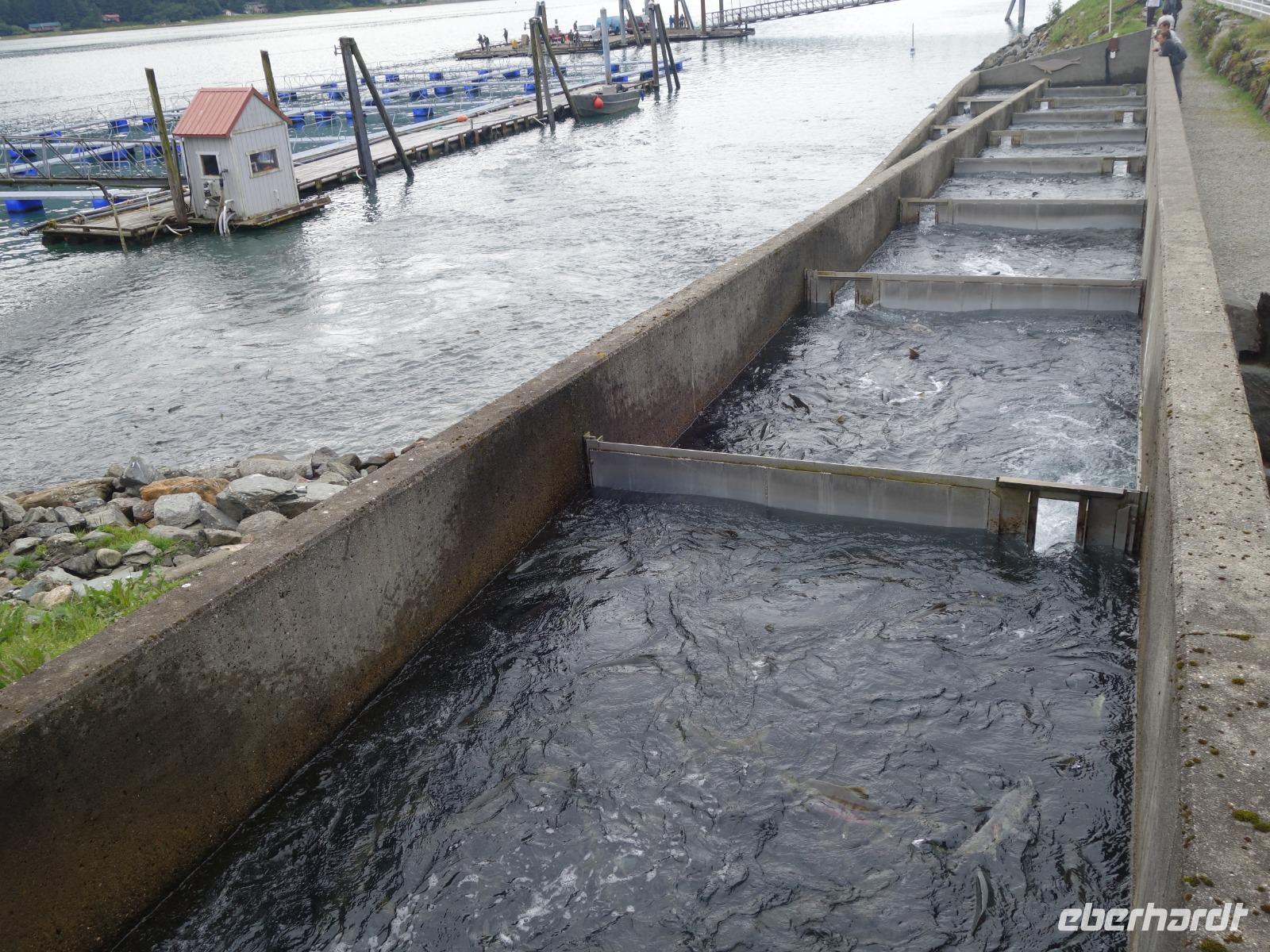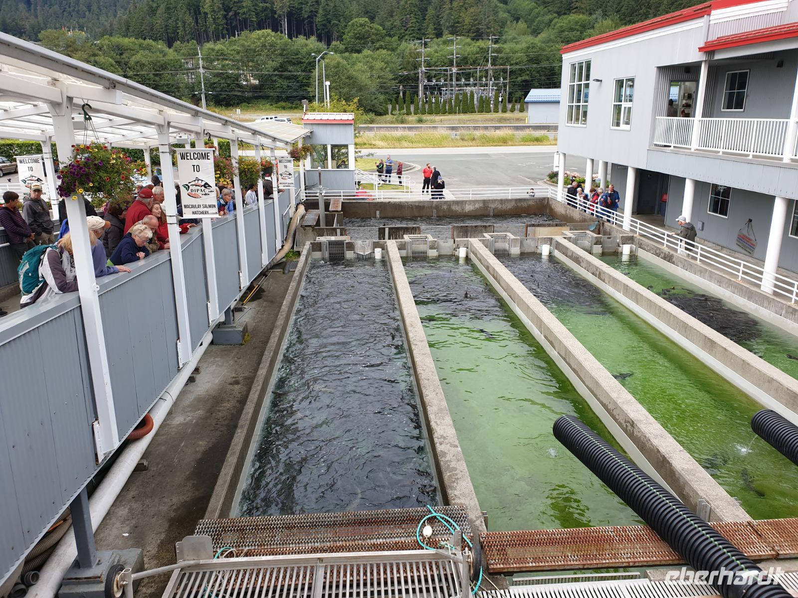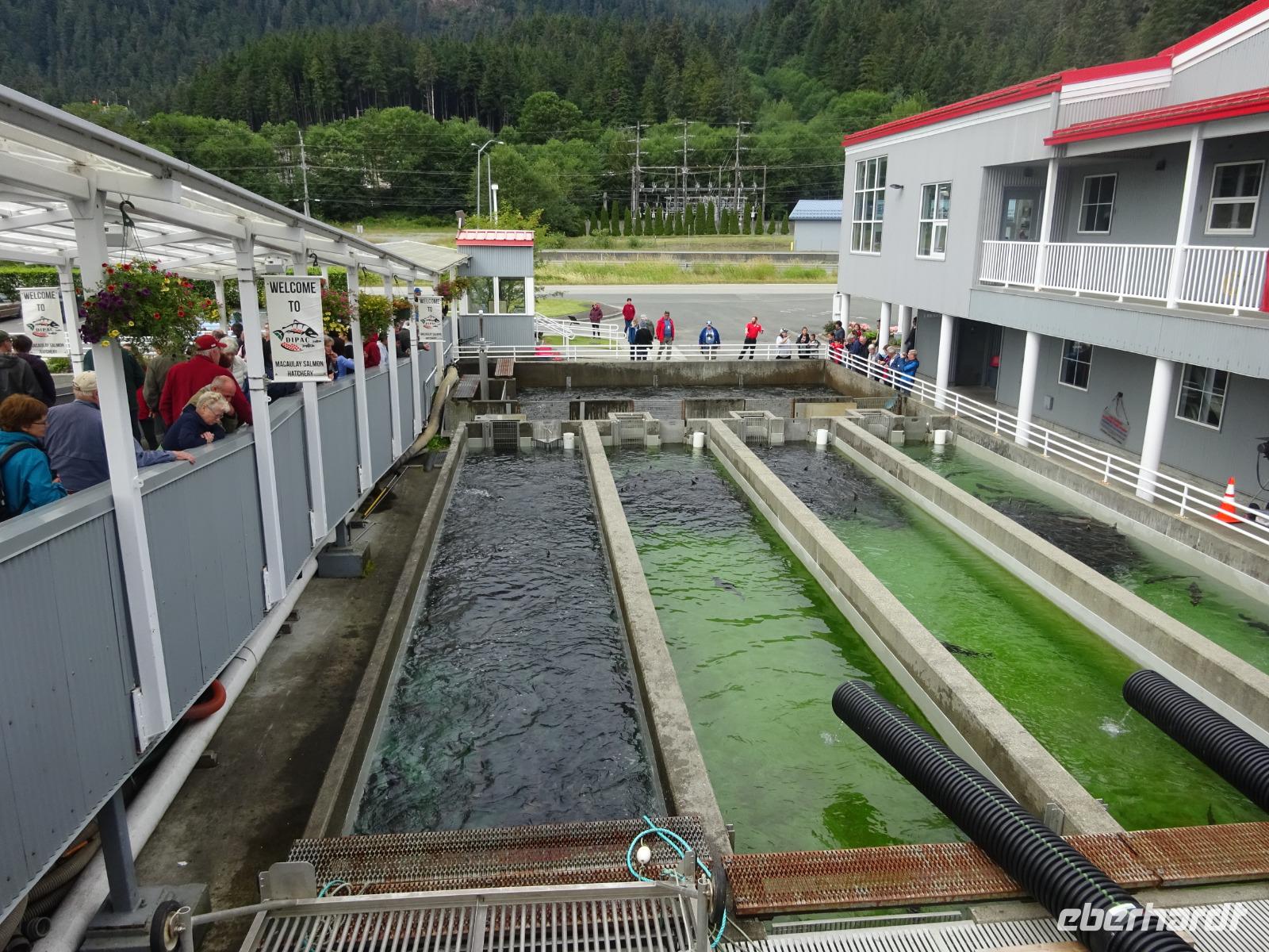 Weiter geht es in den Macaulay Lachszuchtbetrieb. Der Zuchtbetrieb hat vier Lachszuchten in der Umgebung von Junea und züchtet fünf verschiedene Lachsarten, die in Alaska heimisch sind. Wir sehen verschiedene Becken und Rampen, in denen sich die Wildlachse in verschiedenen Stadien ihres Lebens befinden. Die Lachse werden hier nicht wie auf einer herkömmlichen Fischfarm gehalten, sondern in das Meer zurück entlassen. Erst wenn die Lachse nach Jahren zum Laichen in ihr Heimatgewässer wiederkehren, werden sie von der Farm betäubt und ihrer Eier und Samen entnommen. Der Zyklus der Aufzucht beginnt von vorne.