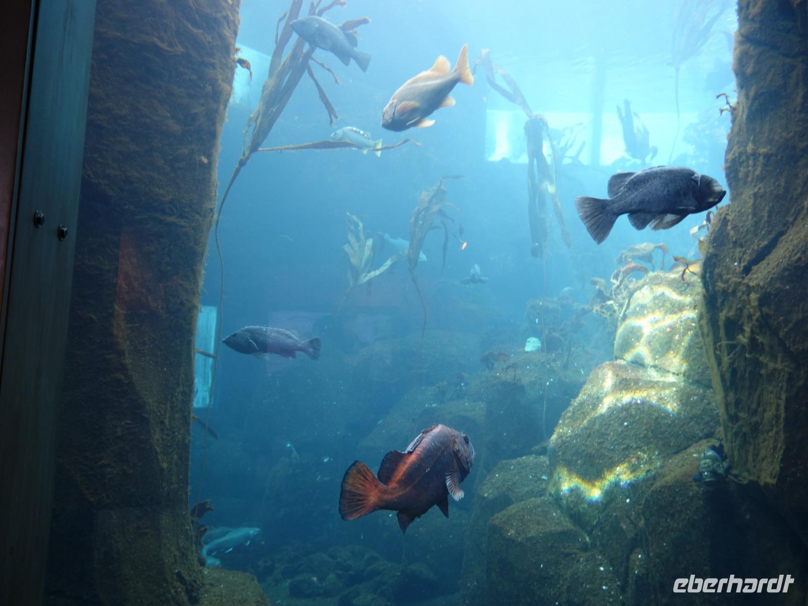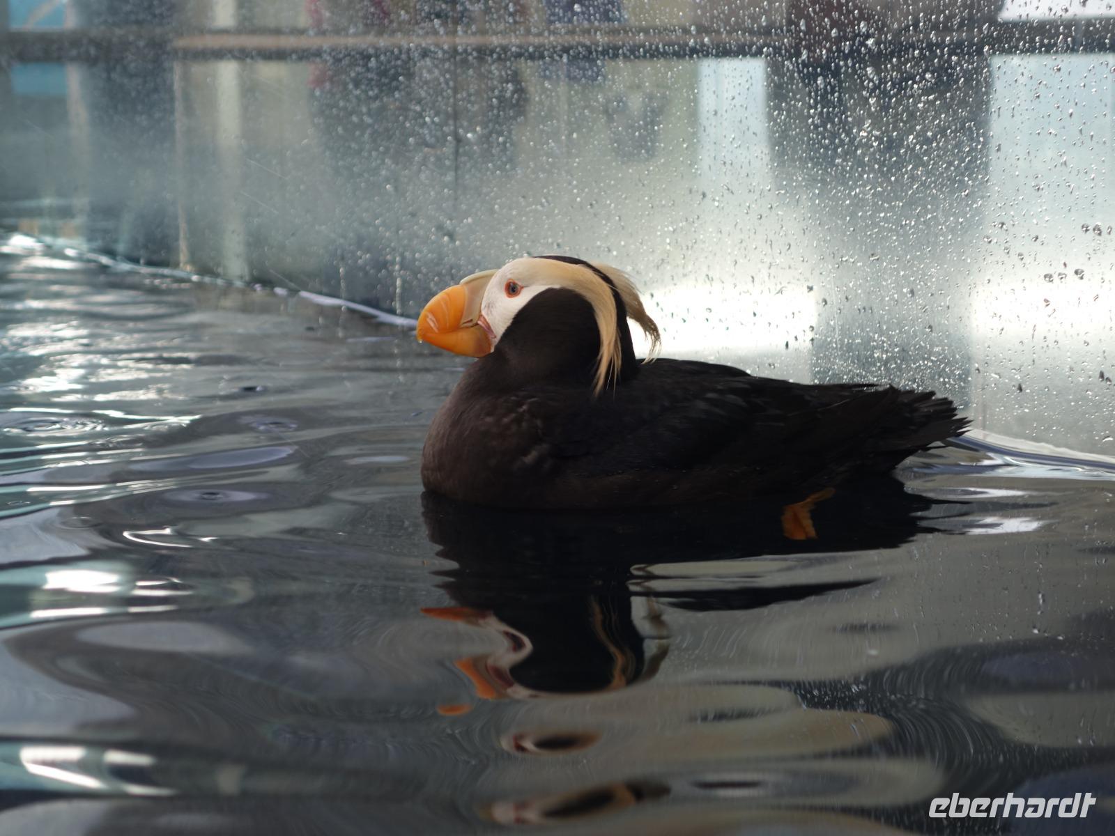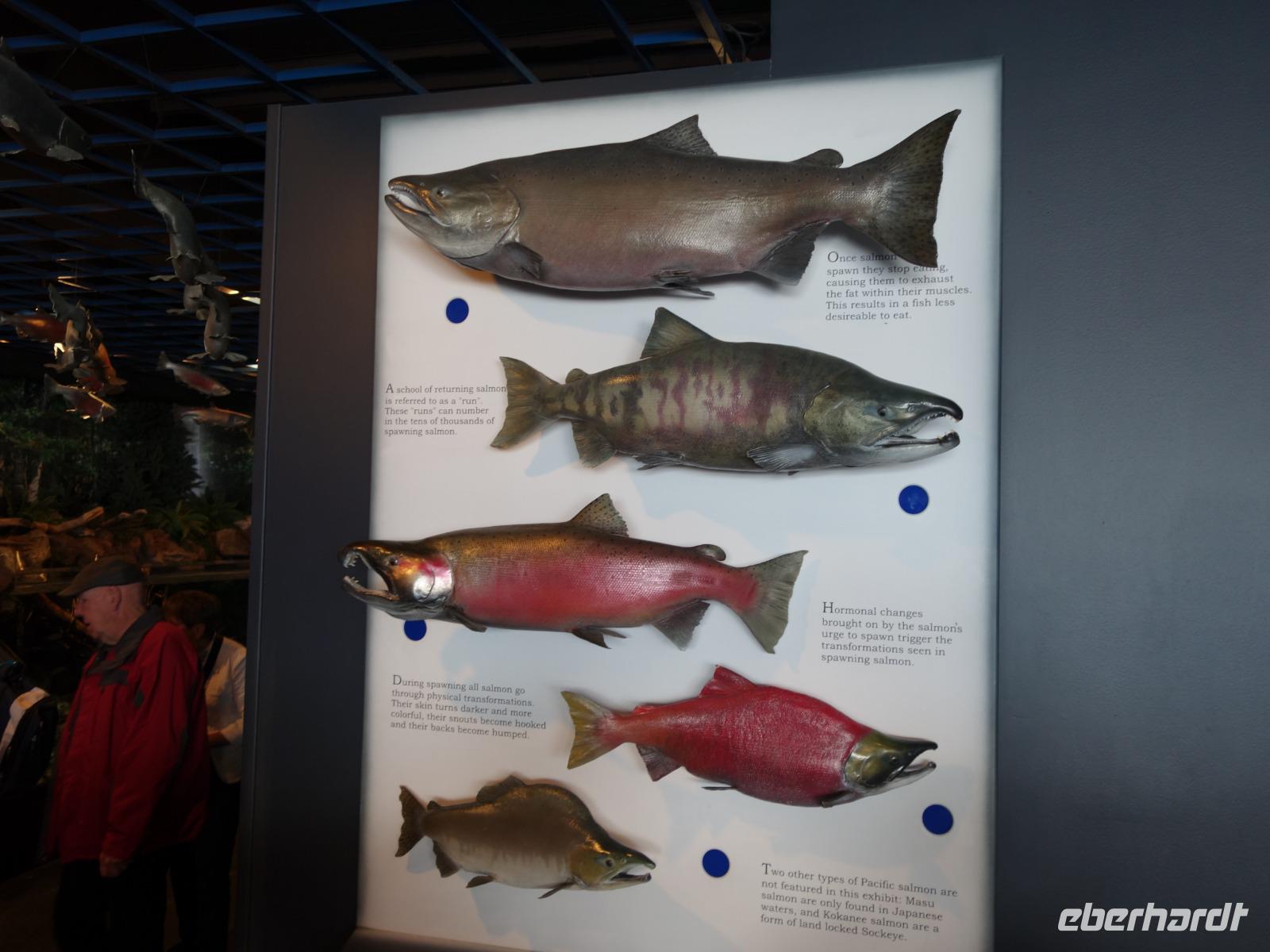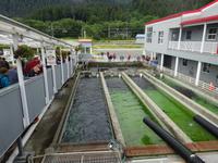 Weiter geht es in den Macaulay Lachszuchtbetrieb. Der Zuchtbetrieb hat vier Lachszuchten in der Umgebung von Junea und züchtet fünf verschiedene Lachsarten, die in Alaska heimisch sind. Wir sehen verschiedene Becken und Rampen, in denen sich die Wildlachse in verschiedenen Stadien ihres Lebens befinden. Die Lachse werden hier nicht wie auf einer herkömmlichen Fischfarm gehalten, sondern in das Meer zurück entlassen. Erst wenn die Lachse nach Jahren zum Laichen in ihr Heimatgewässer wiederkehren, werden sie von der Farm betäubt und ihrer Eier und Samen entnommen. Der Zyklus der Aufzucht beginnt von vorne.