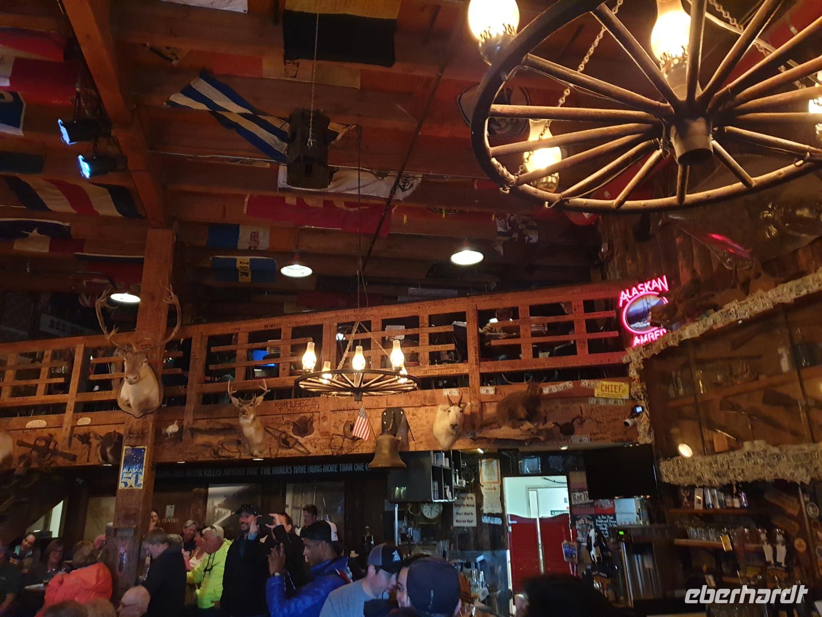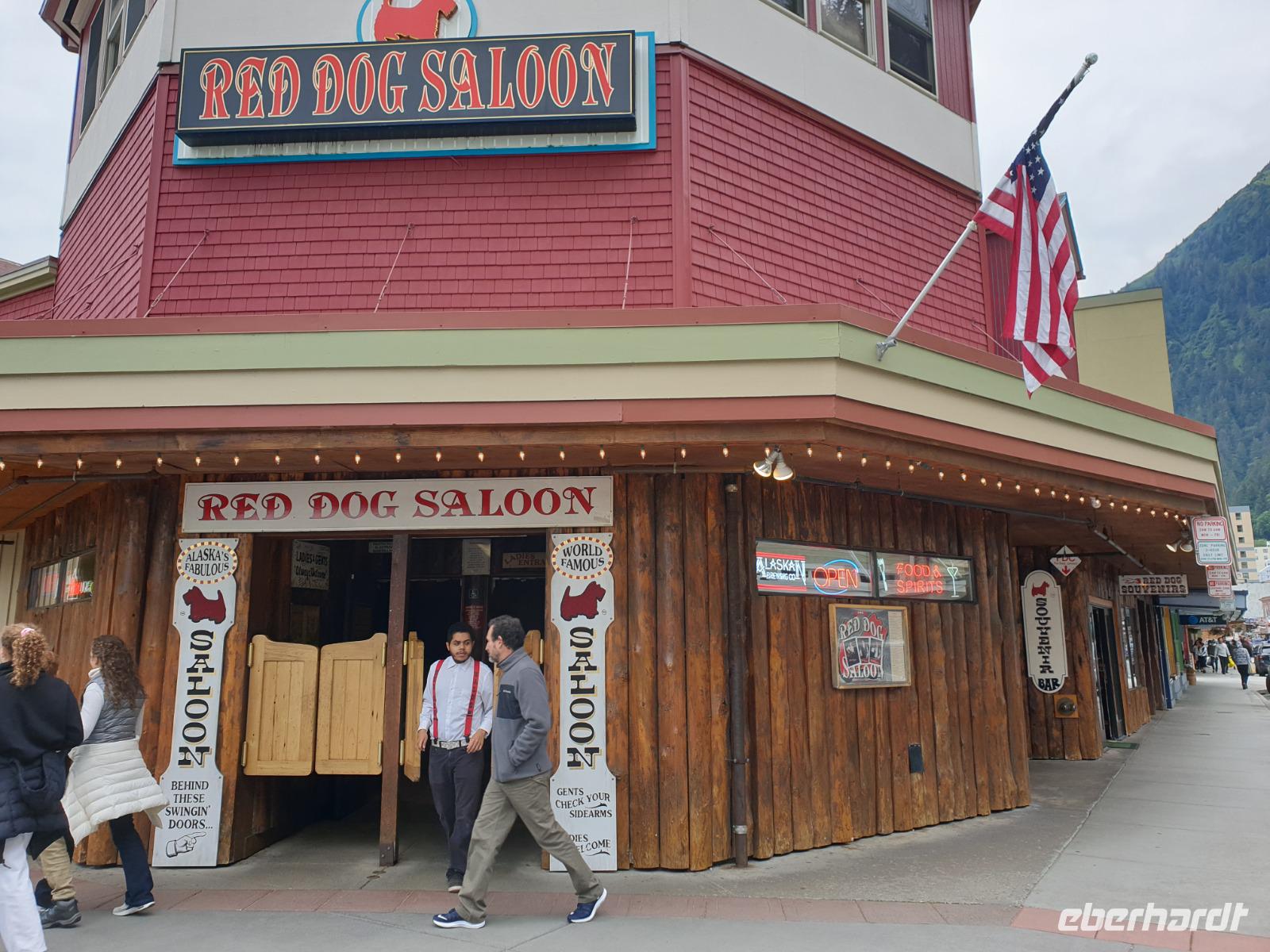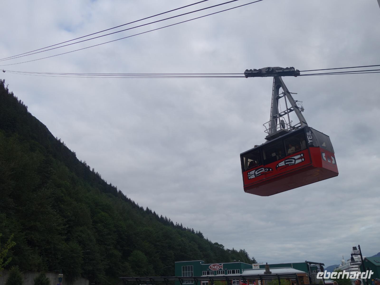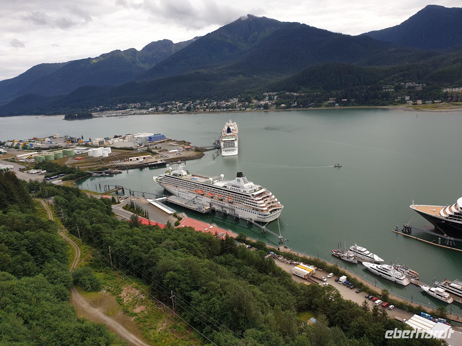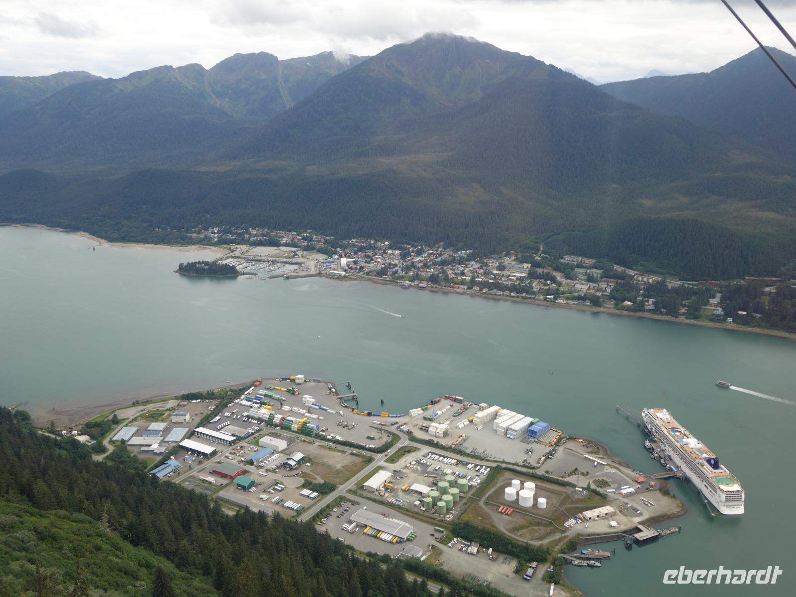 Unser letzter Stopp des Tages führt uns mit der Seilbahn hinauf auf den Mount Roberts. Die Seilbahn bringt uns hinauf auf 532m, von wo wir einen wunderbaren Blick über Juneau haben. Wir sehen Douglas Island und den Gastineau Kanal auf der einen Seite und die Berglandschaft auf der anderen. Wer Lust hat wandert ein wenig umher. Es gibt zahlreiche gut beschilderte Trails. Auch einem Abstieg zu Fuß steht nichts im Wege. Das Schiff legt heute spät ab, also haben wir genug Zeit, um uns noch auf eigene Faust in Juneau umzuschauen und vielleicht auf ein kühles Kaltgetränk im Red Dog Salon mit seinem urigen Ambiente vorbei zu schauen. Cheers!