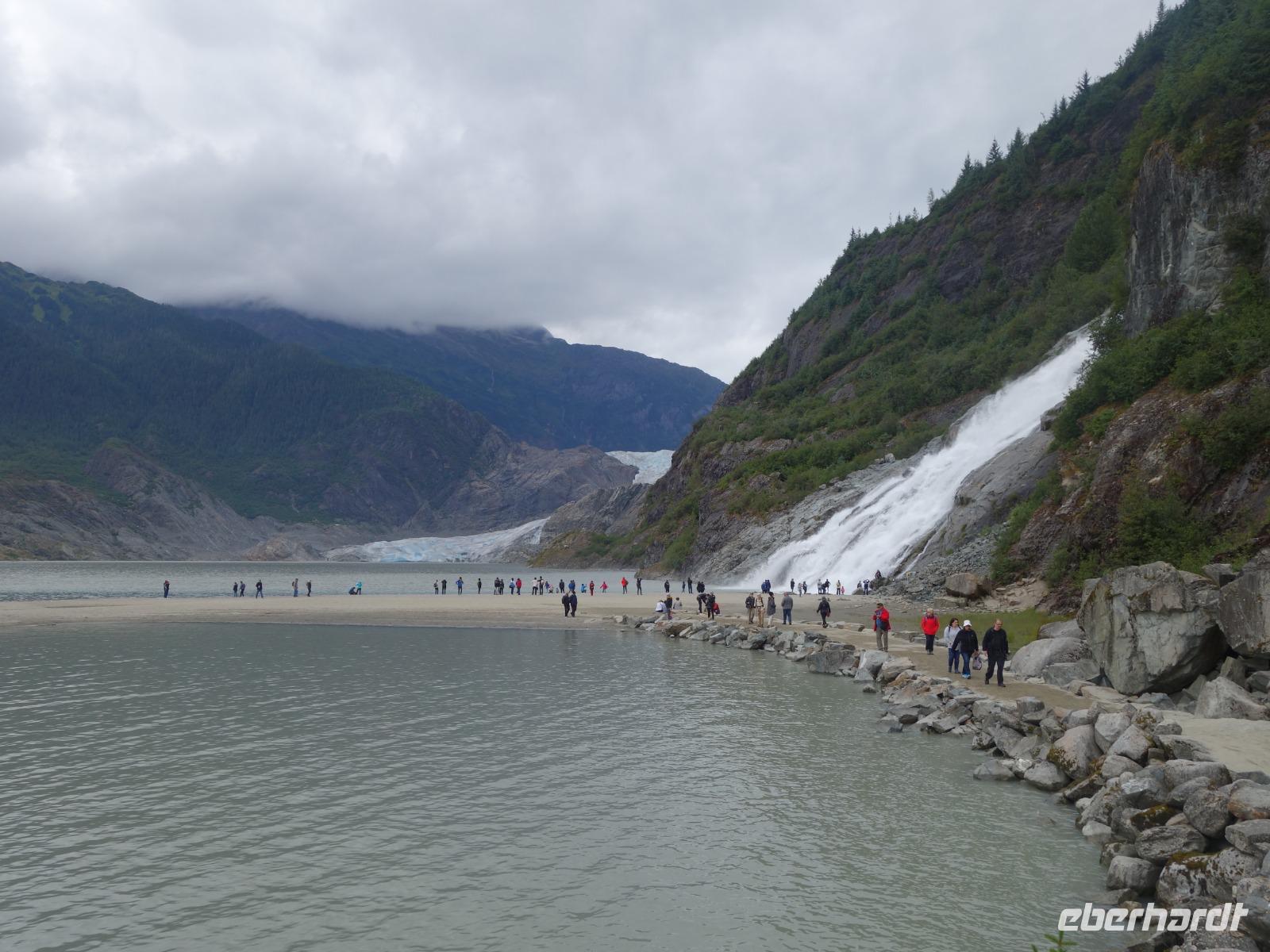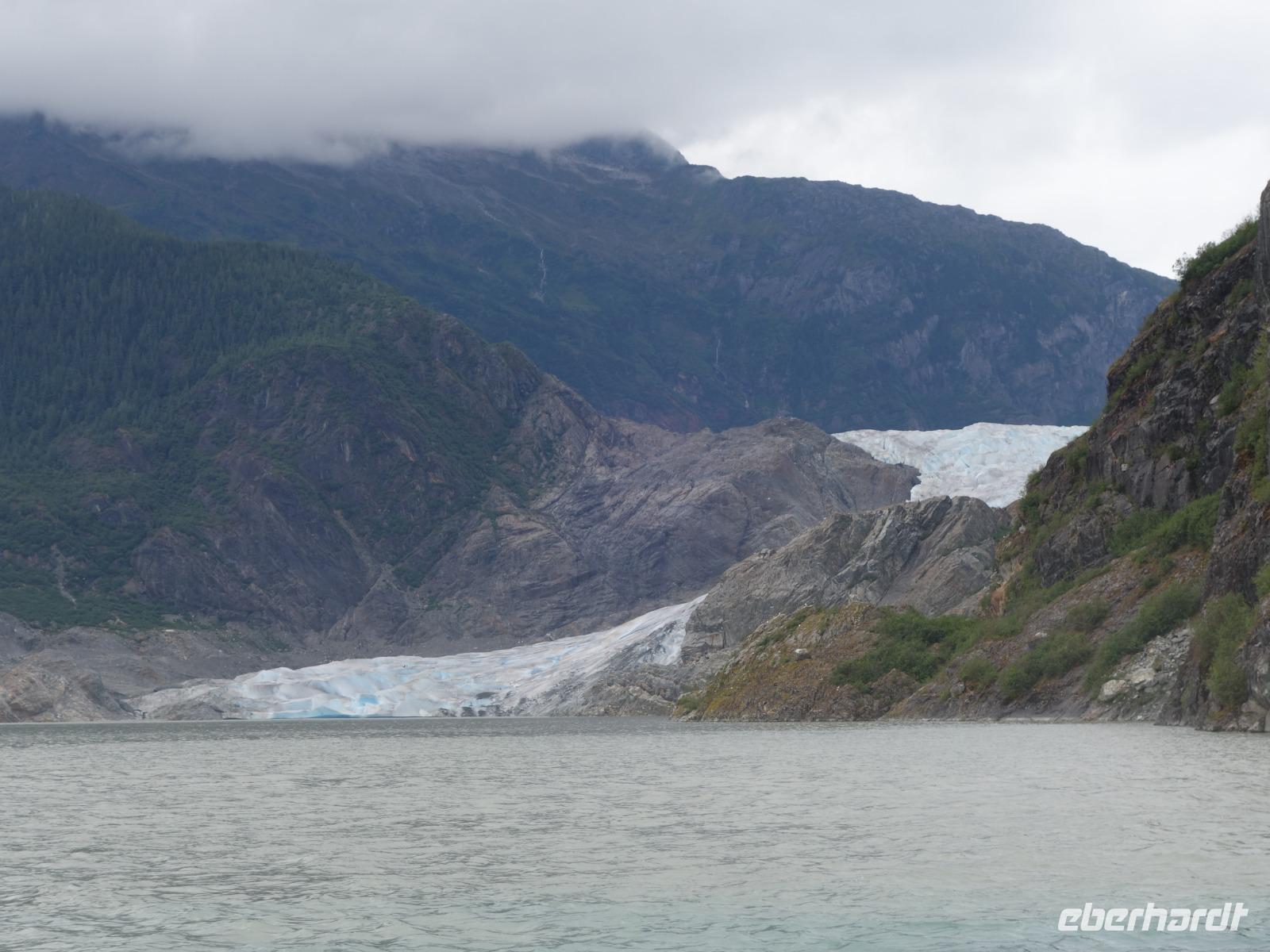 Unser erster Stopp des Tages ist der Mendenhall Gletscher, ca. 20km von Juneau entfernt. Inmitten des Tongass Nationalparks befindet sich das immer noch große Juneau Eisfeld mit ca. 4.000km², welches sich nach Osten bis in die kanadische Provinz British Columbia erstreckt. Der Gletscher ist ca. 12km lang, 2,4km breit und ca. 67m hoch. Sein Eis erreicht eine Dicke von bis zu 1.370m. Das Eis an manchen Stellen schimmert noch in wunderbaren Blautönen, die sich mit der Fotokamera kaum einfangen lassen. Die einzigartige Kristallstruktur lässt alle Farben außer Blautöne von dem Licht absorbieren. Dieser Gletscher zieht sich - im Vergleich zum Athabasca Gletscher nur 10-15m pro Jahr zurück. Das heißt, dass er bei diesem Tempo nicht nur durch seine Größe noch mindestens 200 Jahre brauchen wird, bis er sich ganz zurückgezogen hat. Das der Mendenhall Gletscher nicht schneller schrumpft liegt im Besonderen aber an dem günstigen Klima. Feuchte Luft steigt in Richtung Berge auf und kühlt ab, Schnee fällt (ca. 30m Neuschnee jedes Jahr). Da die Sommer nicht so heiß sind, schmilzt der Schnee kaum und es bilden sich dadurch neue Eisschichten.