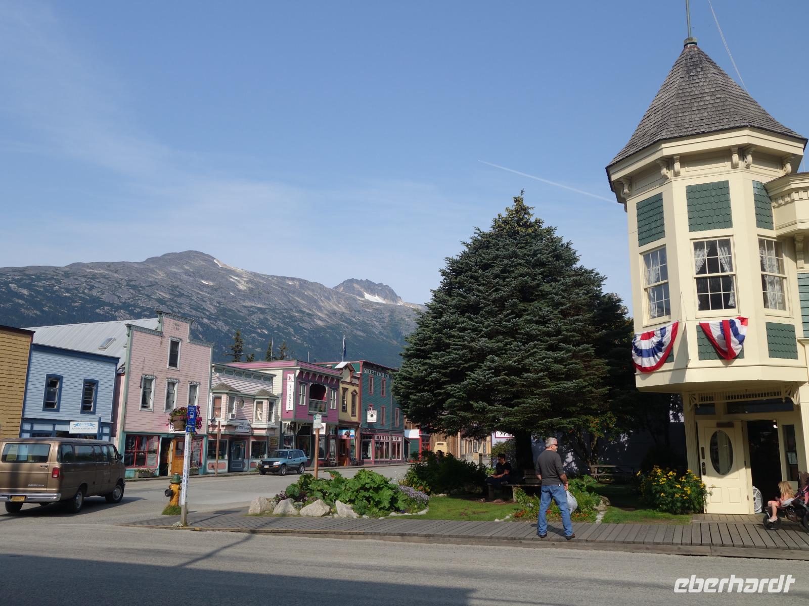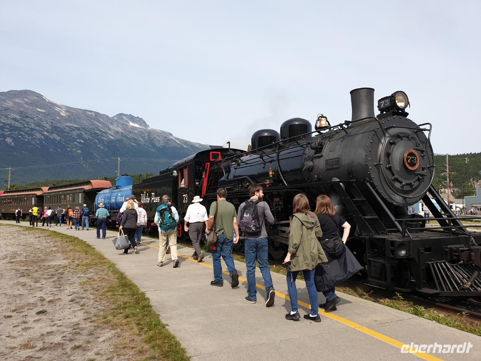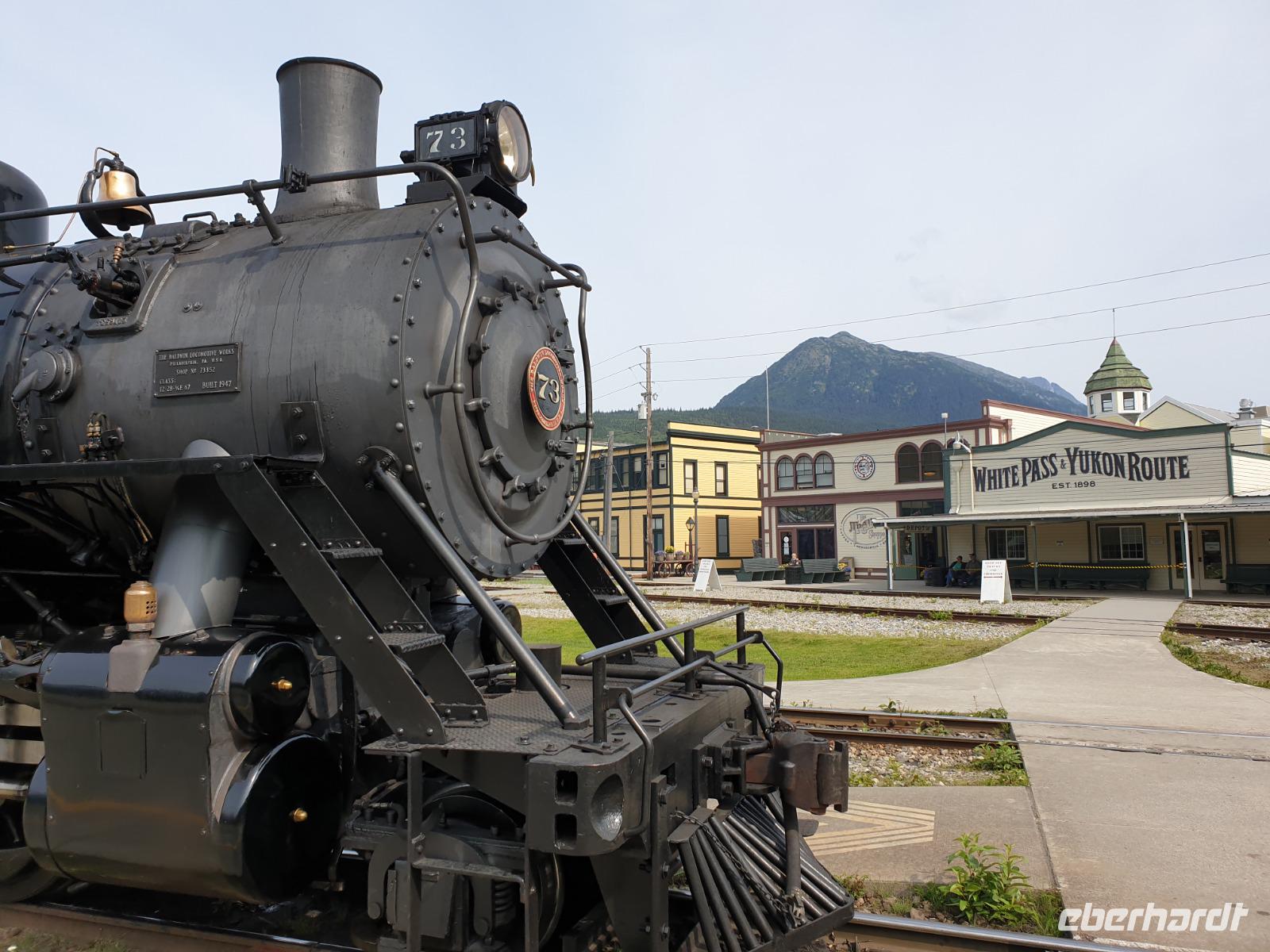 Heute legen wir in der nördlichsten Hafenstadt der Inside Passage an - in Skagway. Während des Goldrausches zählte die Stadt bis zu 20.000 Einwohner, heute ist es ein beschauliches Örtchen mit ca. 800 Einwohnern. Viele Goldsucher kamen nach Skagway, um Reichtum zu erlangen, aber nur die wenigsten fanden ihn auch. Die Quelle des Goldes war bei Lake Bennett ca. 45 Meilen von Skagway entfernt. Der Weg dorthin war über den White Pass (ca. 880m) beschwerlich und auf dem Weg dorthin sind nicht nur einige Menschen aber auch über 3.000 Pferde ums Leben gekommen, weil sie einfach zu schwer bepackt und am Verhungern waren. Man nennt den Trail deshalb unter anderem „Dead Hors Trail". Michael J. Heney wollte dem Transportproblem ein Ende bereiten und so begann 1898 der Bau der Eisenbahnlinie White Pass & Yuon Route. Die Bahnstrecke hatte teilweise eine Steigung von über 4% und schlängelt sich auf 32km über hölzerne Brücken und Tunneln bis zum White Pass hoch. Nach nur 2 Jahren wurde die wichtigste Verbindungstraße für die Goldgräber fertiggestellt.