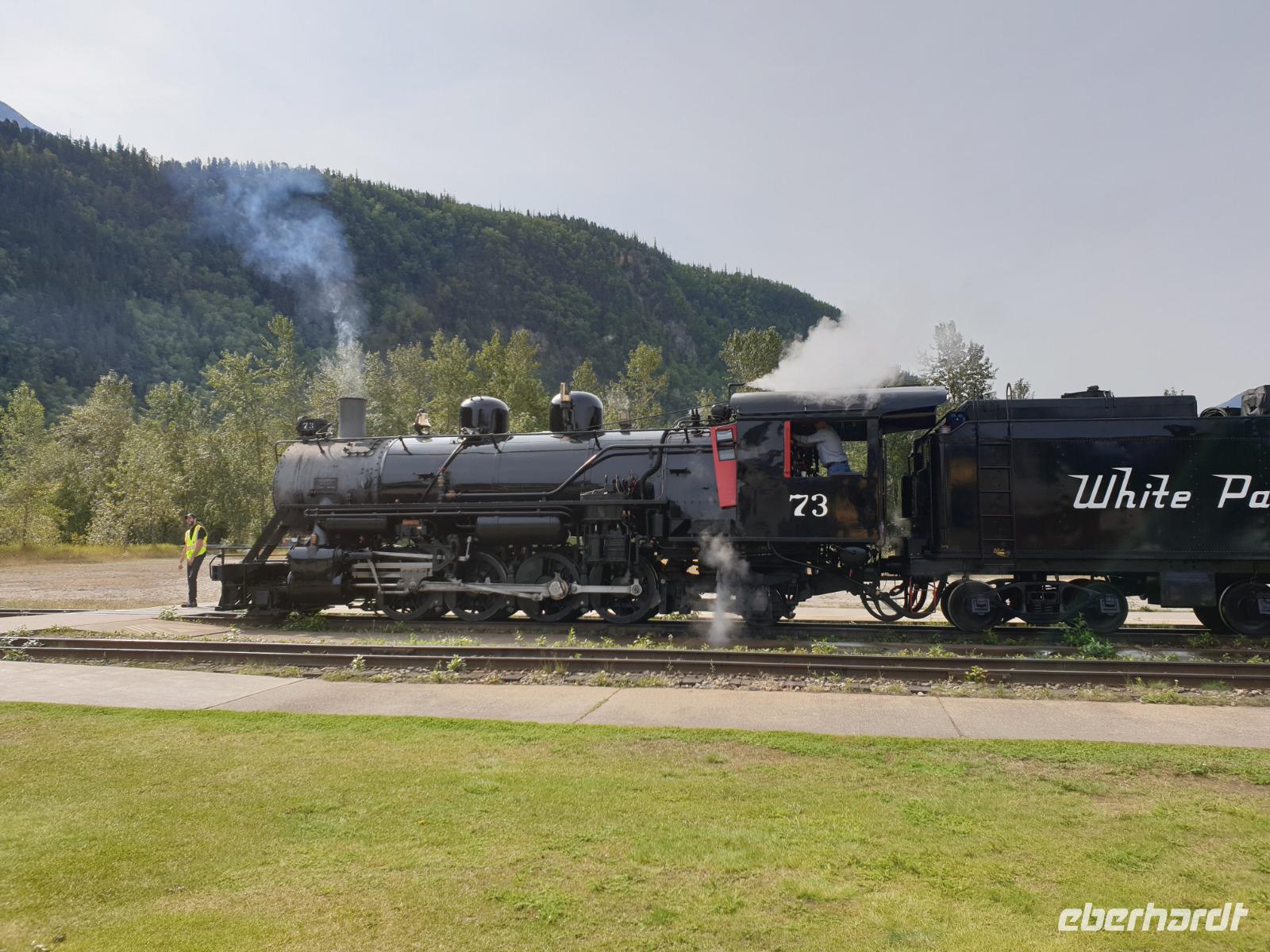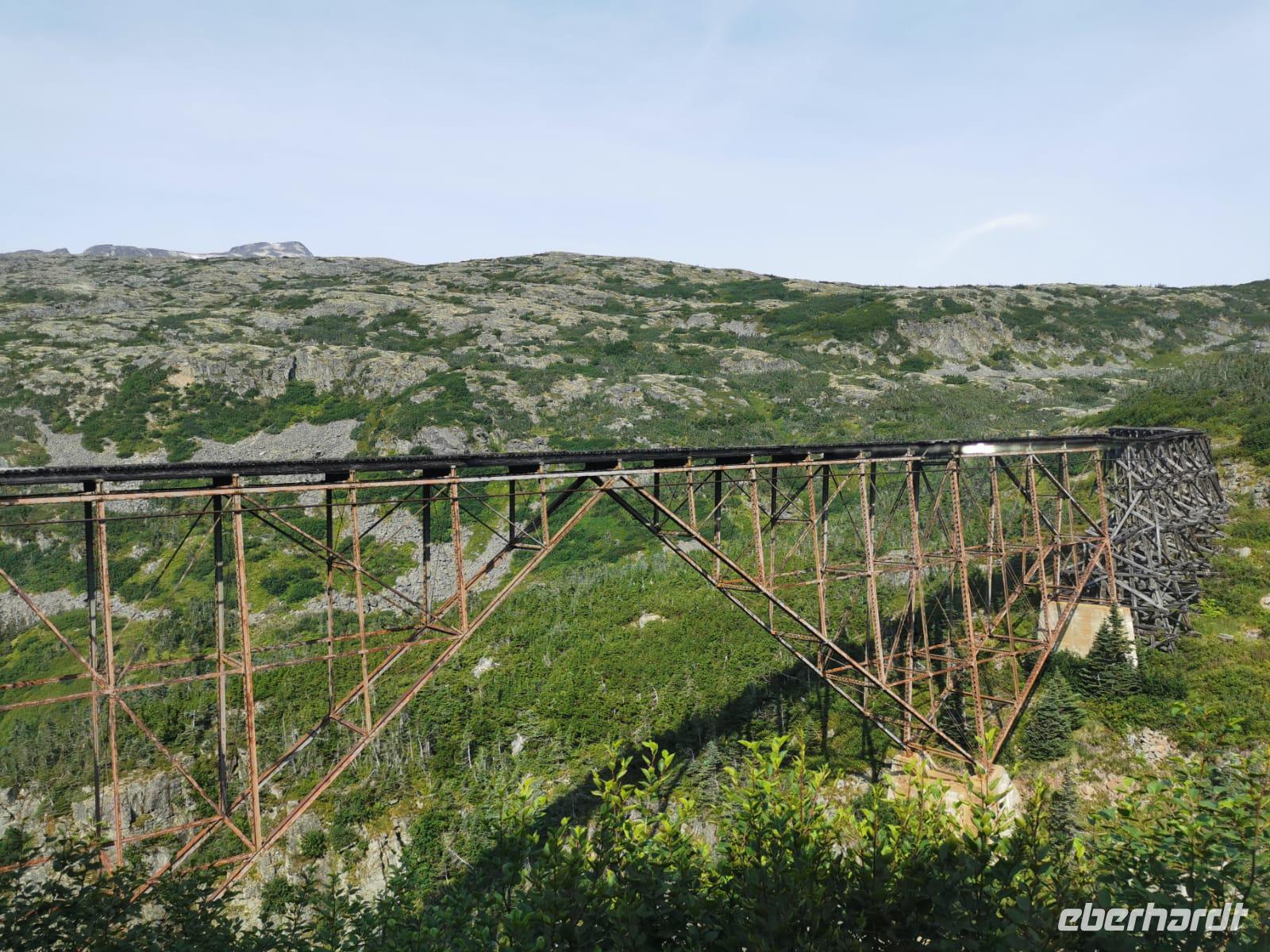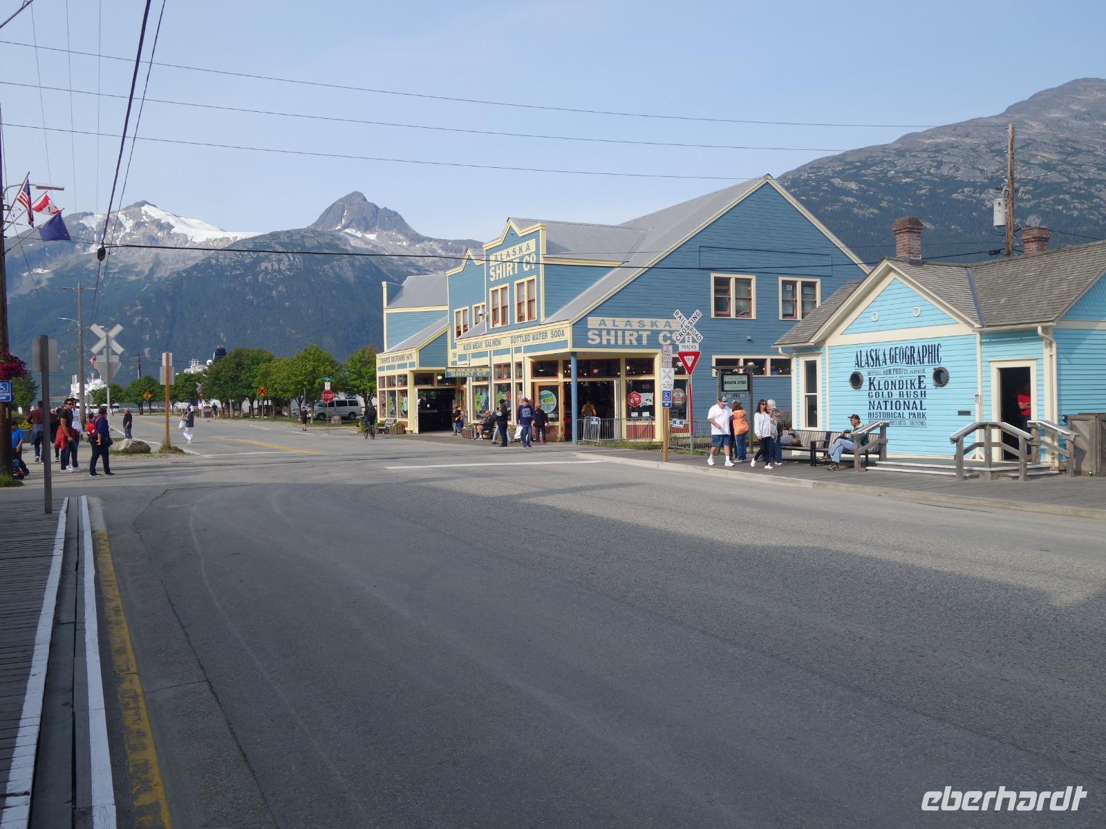 Heute legen wir in der nördlichsten Hafenstadt der Inside Passage an - in Skagway. Während des Goldrausches zählte die Stadt bis zu 20.000 Einwohner, heute ist es ein beschauliches Örtchen mit ca. 800 Einwohnern. Viele Goldsucher kamen nach Skagway, um Reichtum zu erlangen, aber nur die wenigsten fanden ihn auch. Die Quelle des Goldes war bei Lake Bennett ca. 45 Meilen von Skagway entfernt. Der Weg dorthin war über den White Pass (ca. 880m) beschwerlich und auf dem Weg dorthin sind nicht nur einige Menschen aber auch über 3.000 Pferde ums Leben gekommen, weil sie einfach zu schwer bepackt und am Verhungern waren. Man nennt den Trail deshalb unter anderem „Dead Hors Trail". Michael J. Heney wollte dem Transportproblem ein Ende bereiten und so begann 1898 der Bau der Eisenbahnlinie White Pass & Yuon Route. Die Bahnstrecke hatte teilweise eine Steigung von über 4% und schlängelt sich auf 32km über hölzerne Brücken und Tunneln bis zum White Pass hoch. Nach nur 2 Jahren wurde die wichtigste Verbindungstraße für die Goldgräber fertiggestellt.