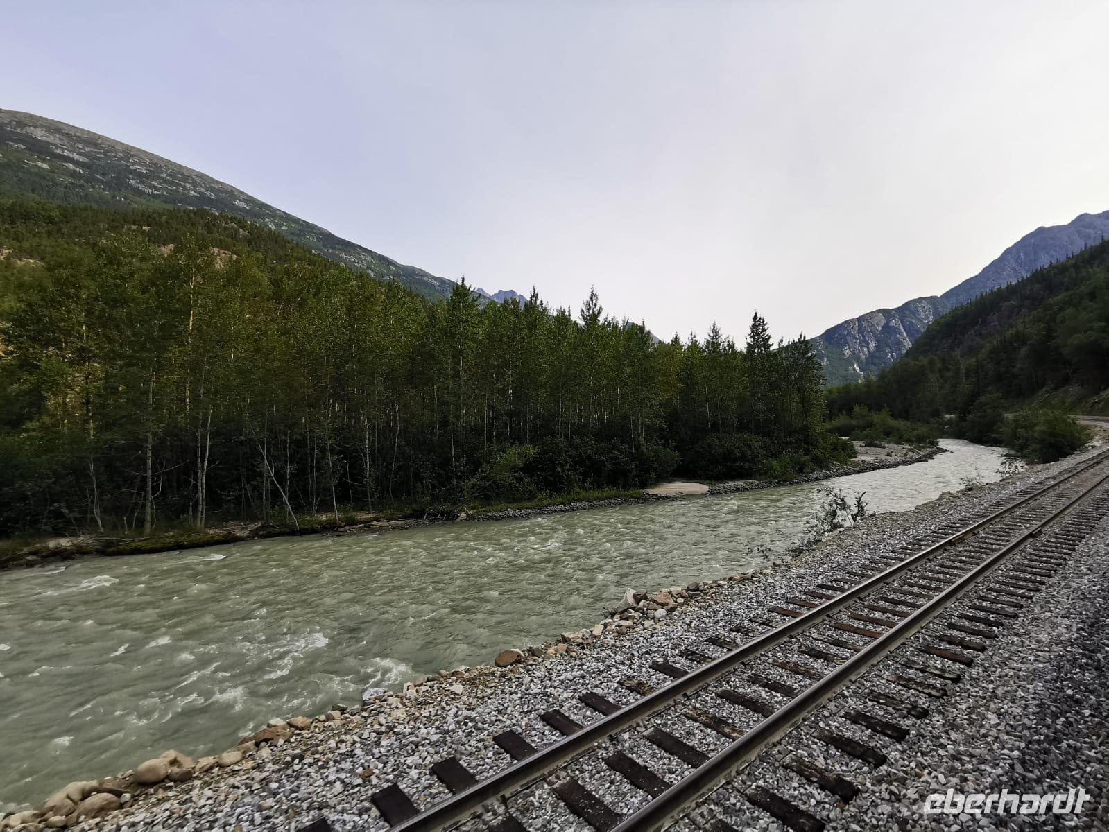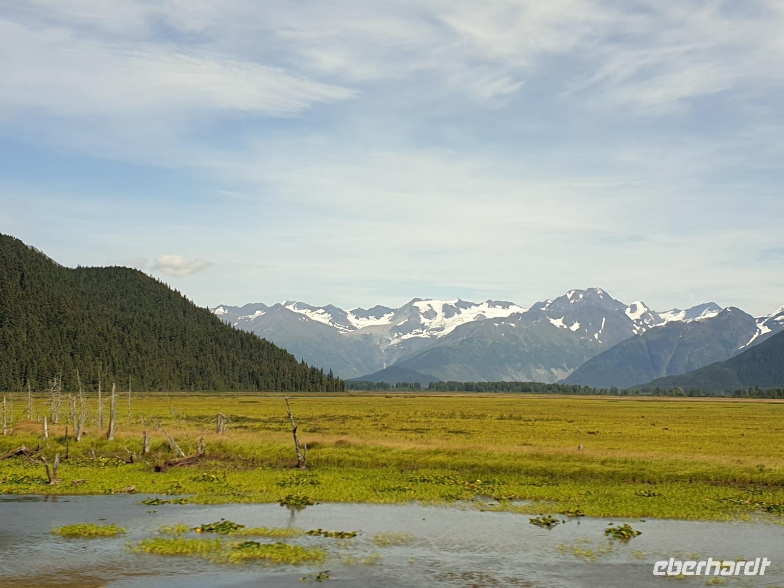 Auf unseren Ausflug mit der historischen Eisenbahn wandeln wir auf den Pfaden von 40.000 Menschen, die hier nach ihrem Goldglück suchten. Die Schmalspurbahn, einer der letzten in Nordamerika, fährt entlang des Skagway Fluss am Bridal Vell Wasserfall vorbei, inmitten einer atemberaubenden Bergkulisse. Der Blick hinunter ins Tal von den vier Brücken der Strecke ist einfach traumhaft. Oben angekommen passieren wir die Grenze zu Kanada - aber nur für eine kurze Zeit, dann geht es für uns zurück nach Alaska, bergab Richtung Skagway.