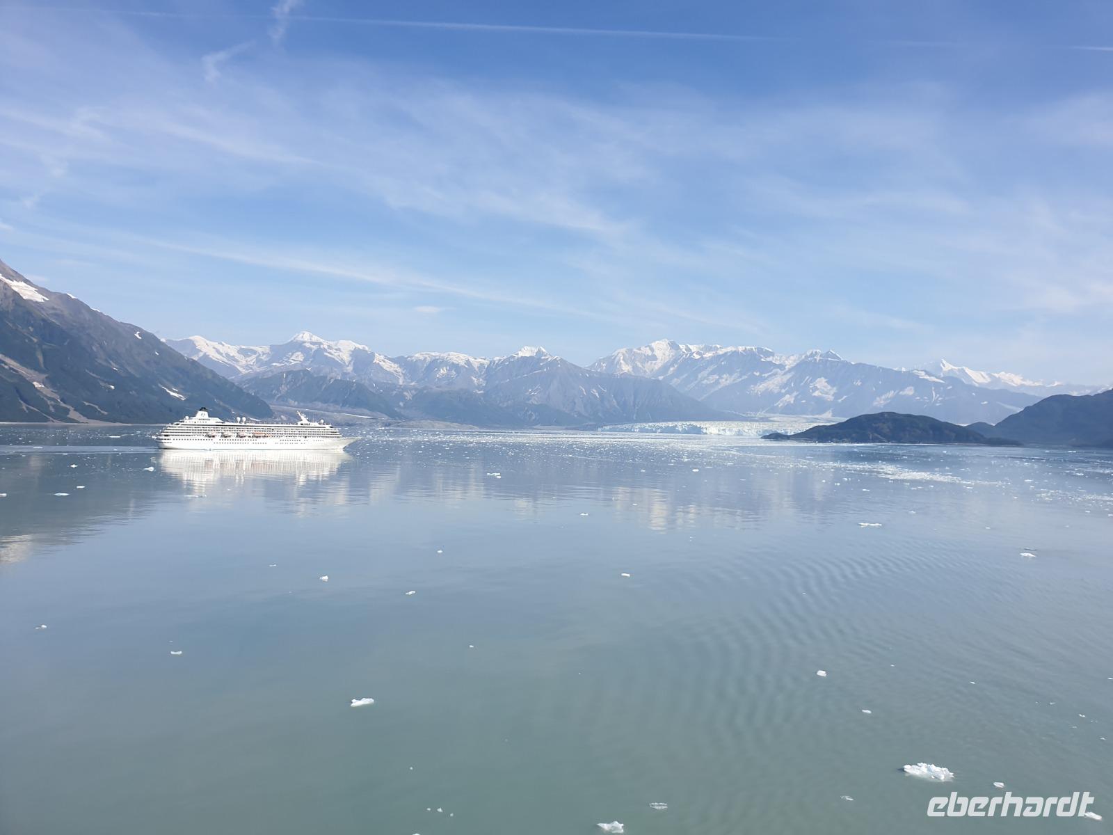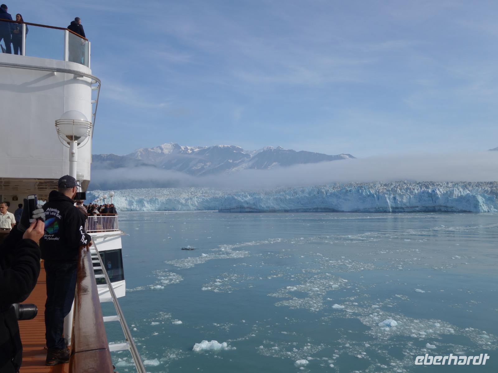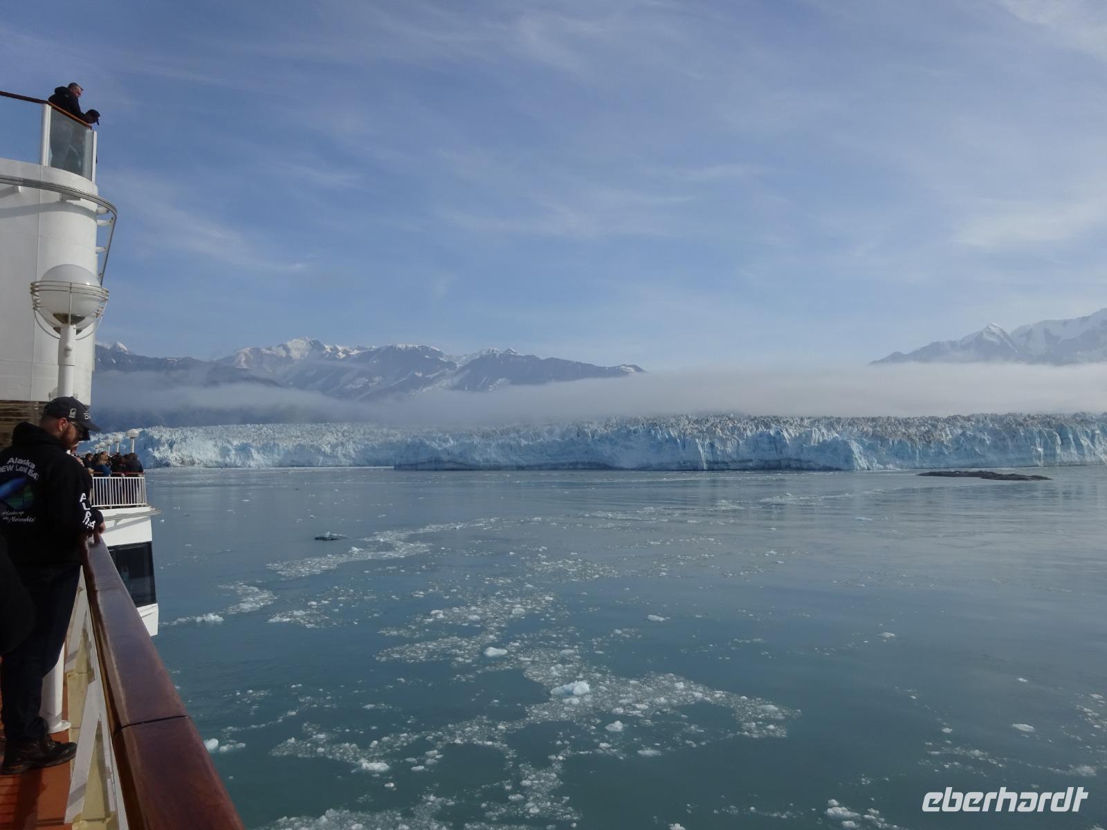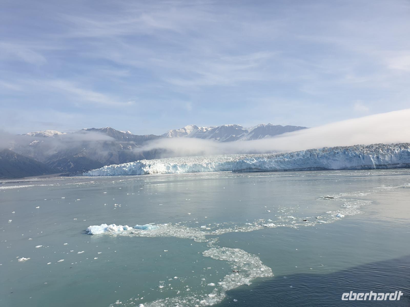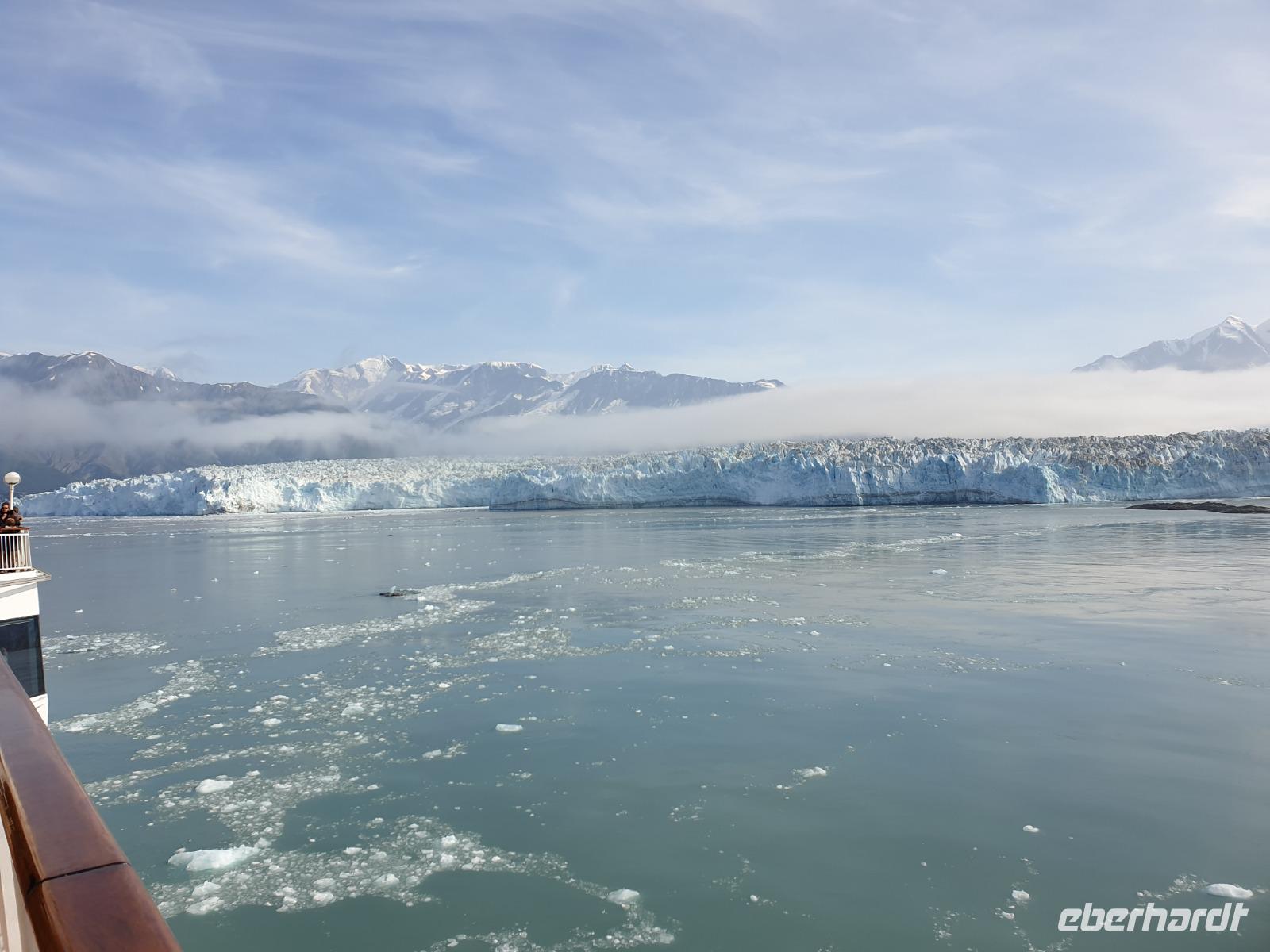 Der letzte Seetag bringt uns ganz nah an den gigantischen Hubbard Gletscher, Nordamerikas größten Gezeitengletscher. Er besteht aus 3.500km² blauen Eis und ist einer der aktivsten Gletscher in Alaska. Das können wir hautnah miterleben! Es klingt wie ein Gewitter, das aufzieht, kurz bevor der Gletscher kalbt. Der Hubbard Gletscher befindet sich zu einem Teil in Ostalaska und zum anderen Teil in Yukon, Kanada. Er wurde nach Gardiner Hubbard, dem Präsidenten der Bell Telefongesellschaft benannt. Bevor der Hubbard Gletscher das Meer erreicht, verbindet er sich im Westen mit den Valerie Gletscher. Es ist ein einmaliges Erlebnis und wieder einmal haben wir den Jackpot in Sachen Wetter gezogen. Ein herrlicher Morgen, erst liegt noch der Nebel über den „Hubbi", aber schon bald verschwindet diese und gibt die Sicht auf die wunderschönen in der Sonne glitzernde schneebedeckte Gipfel. Das auf dem Wasser treibende Eis mit dem gigantischen Gletscher im Hintergrund ist definitiv ein Bild für die Ewigkeit.