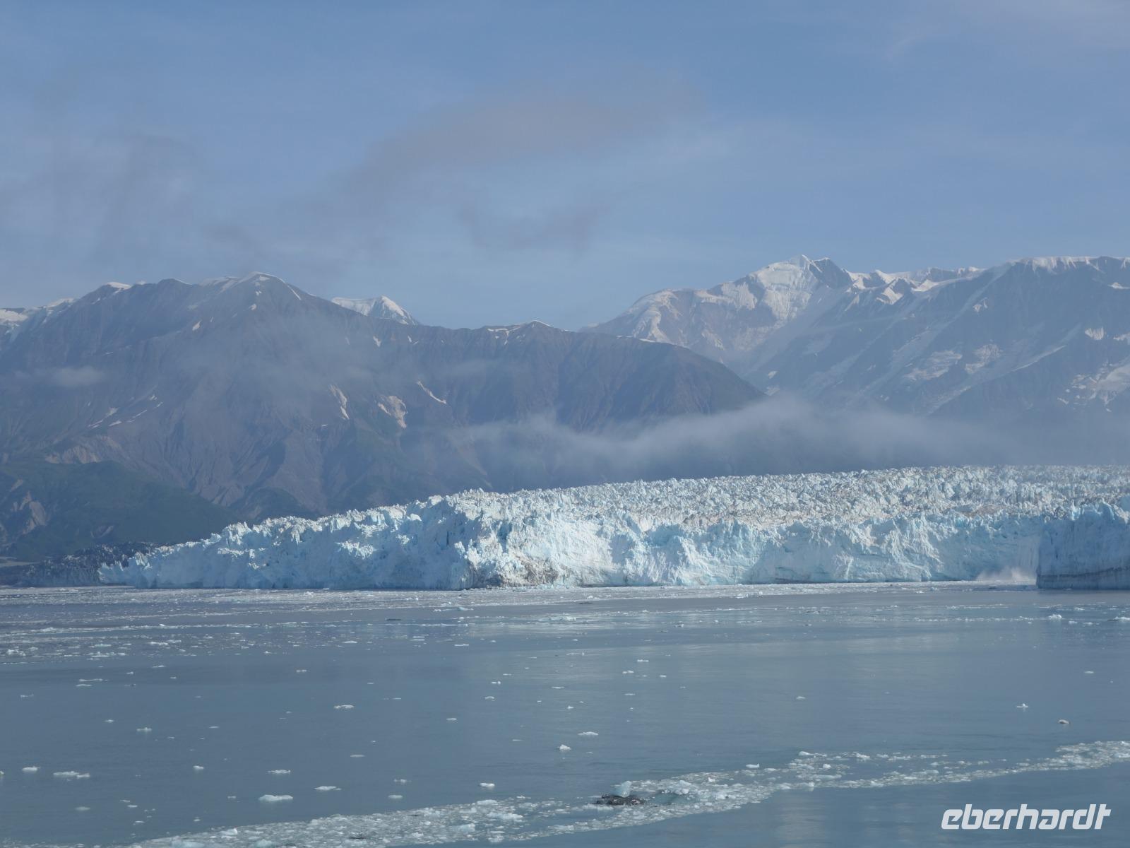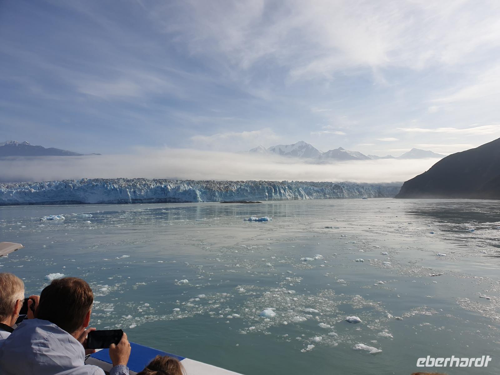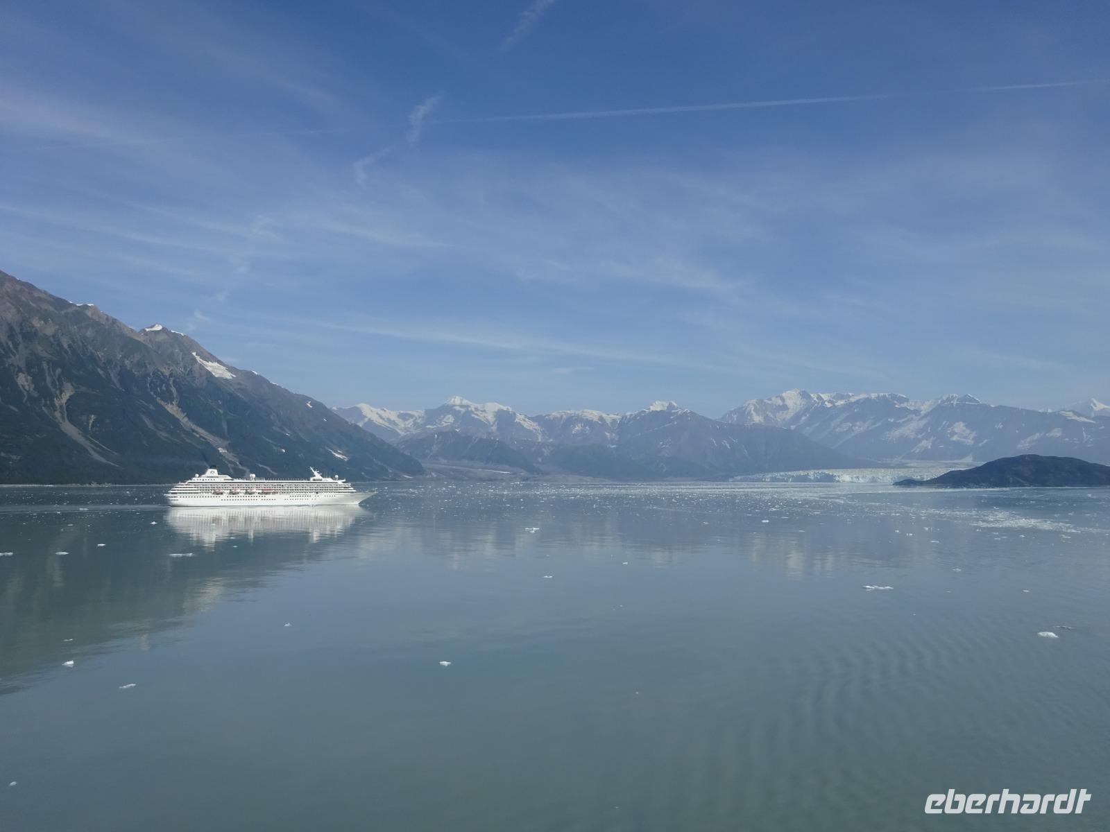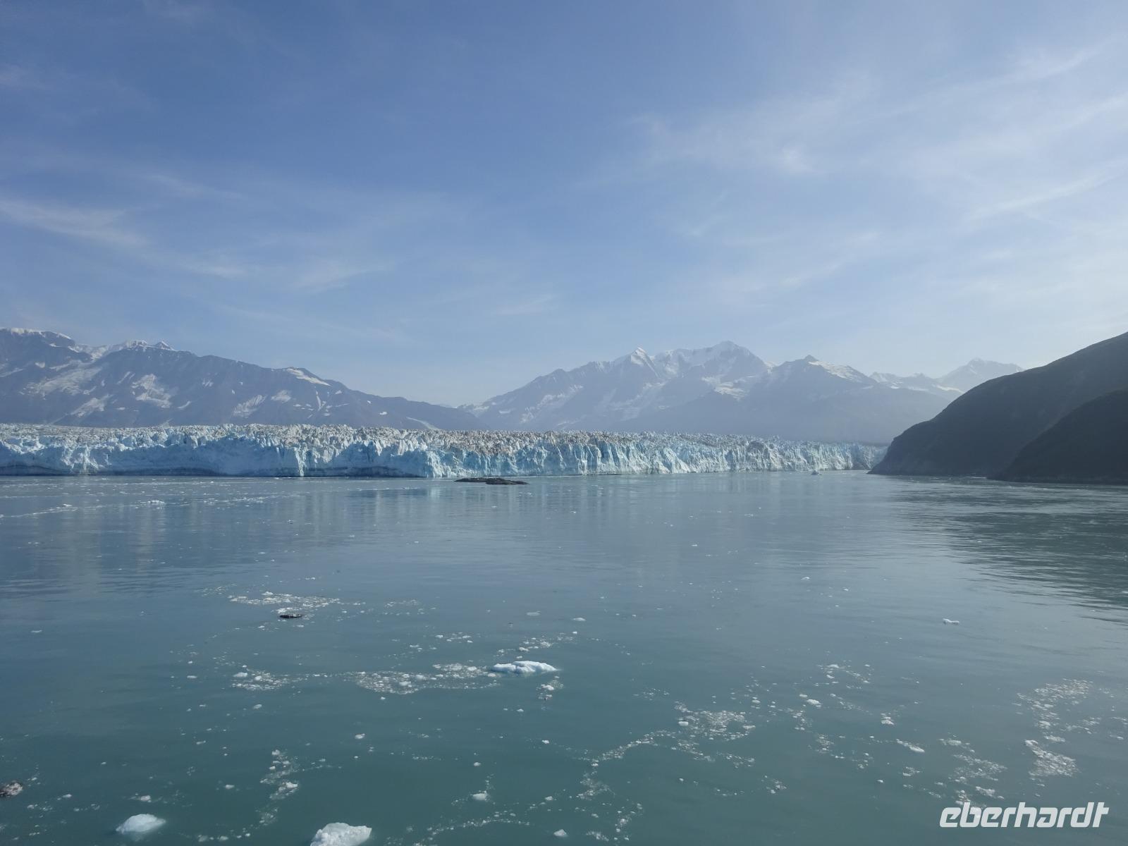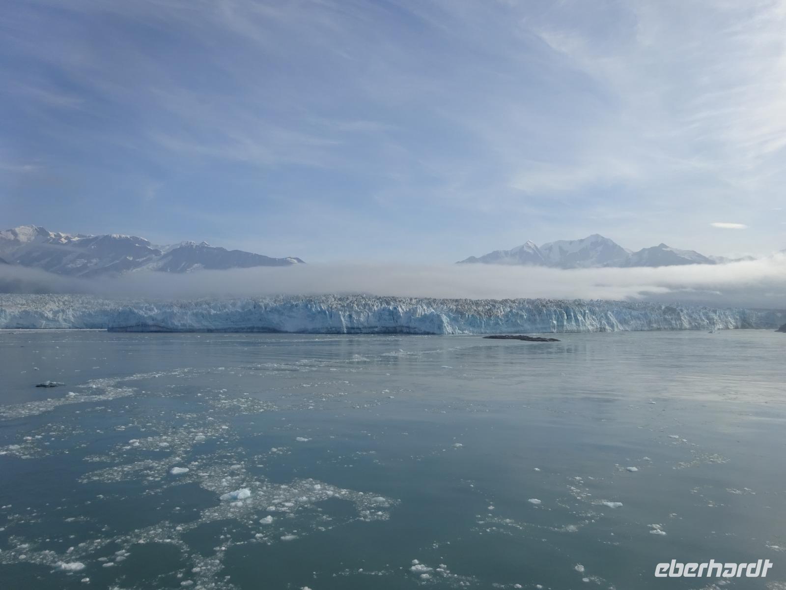 Der letzte Seetag bringt uns ganz nah an den gigantischen Hubbard Gletscher, Nordamerikas größten Gezeitengletscher. Er besteht aus 3.500km² blauen Eis und ist einer der aktivsten Gletscher in Alaska. Das können wir hautnah miterleben! Es klingt wie ein Gewitter, das aufzieht, kurz bevor der Gletscher kalbt. Der Hubbard Gletscher befindet sich zu einem Teil in Ostalaska und zum anderen Teil in Yukon, Kanada. Er wurde nach Gardiner Hubbard, dem Präsidenten der Bell Telefongesellschaft benannt. Bevor der Hubbard Gletscher das Meer erreicht, verbindet er sich im Westen mit den Valerie Gletscher. Es ist ein einmaliges Erlebnis und wieder einmal haben wir den Jackpot in Sachen Wetter gezogen. Ein herrlicher Morgen, erst liegt noch der Nebel über den „Hubbi", aber schon bald verschwindet diese und gibt die Sicht auf die wunderschönen in der Sonne glitzernde schneebedeckte Gipfel. Das auf dem Wasser treibende Eis mit dem gigantischen Gletscher im Hintergrund ist definitiv ein Bild für die Ewigkeit.