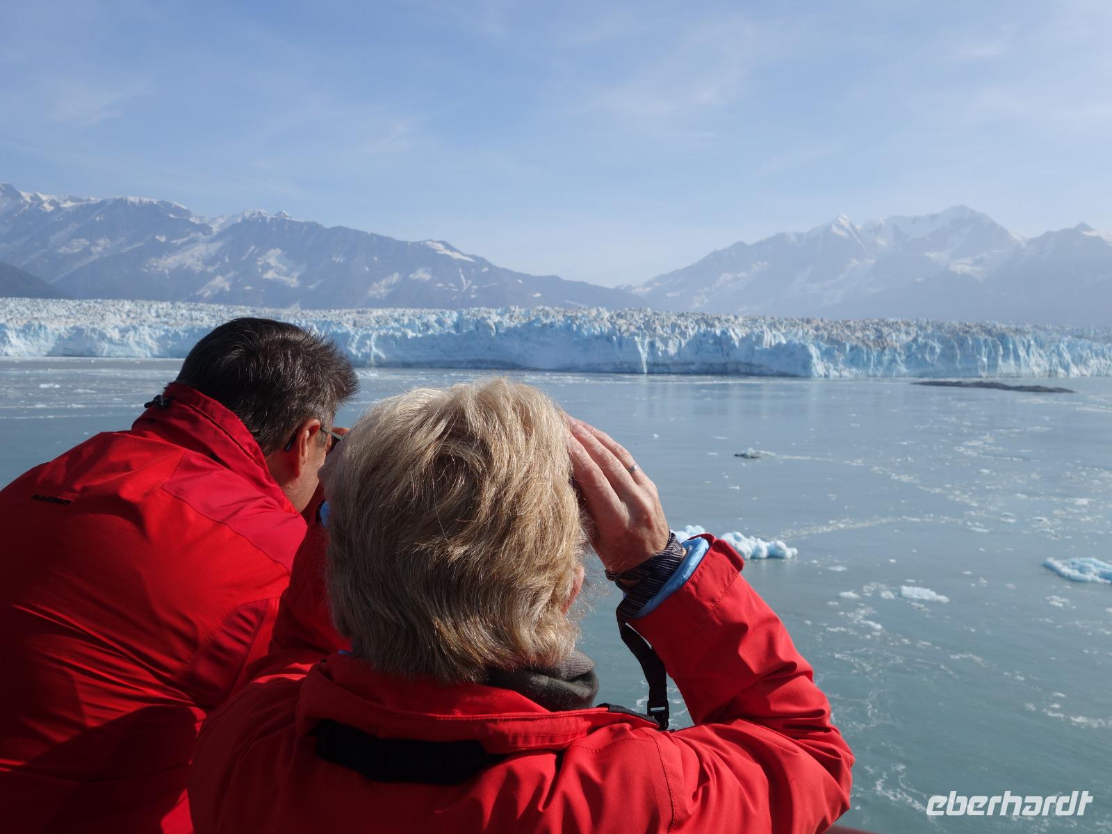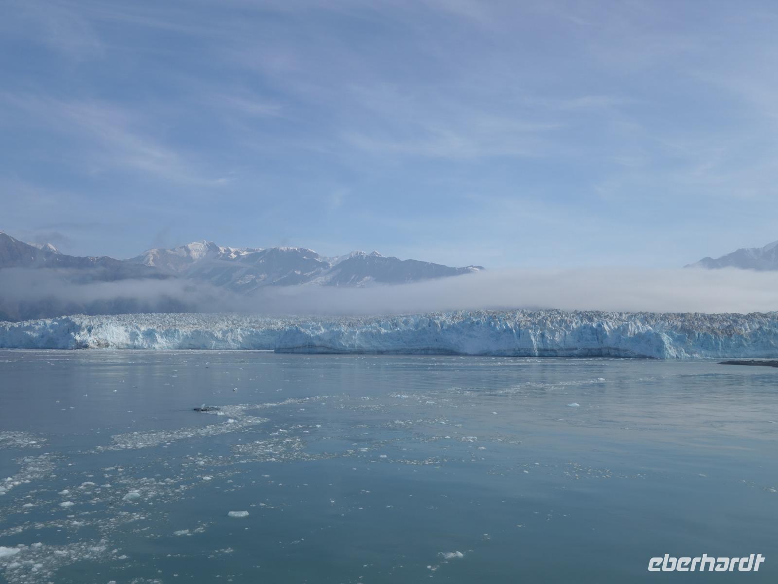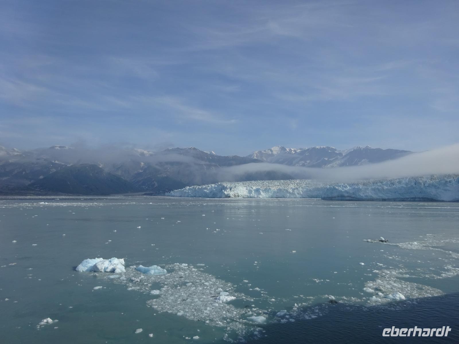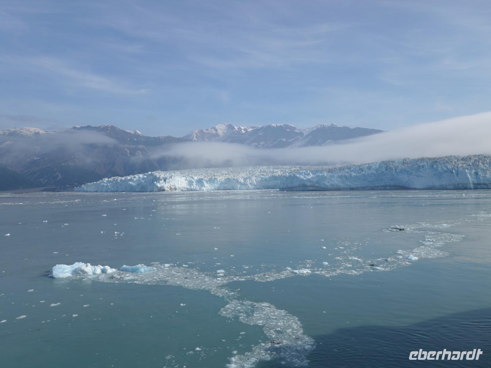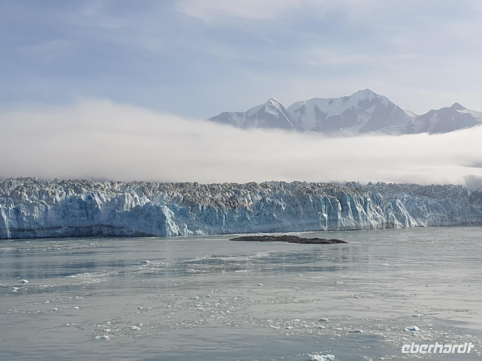 Der letzte Seetag bringt uns ganz nah an den gigantischen Hubbard Gletscher, Nordamerikas größten Gezeitengletscher. Er besteht aus 3.500km² blauen Eis und ist einer der aktivsten Gletscher in Alaska. Das können wir hautnah miterleben! Es klingt wie ein Gewitter, das aufzieht, kurz bevor der Gletscher kalbt. Der Hubbard Gletscher befindet sich zu einem Teil in Ostalaska und zum anderen Teil in Yukon, Kanada. Er wurde nach Gardiner Hubbard, dem Präsidenten der Bell Telefongesellschaft benannt. Bevor der Hubbard Gletscher das Meer erreicht, verbindet er sich im Westen mit den Valerie Gletscher. Es ist ein einmaliges Erlebnis und wieder einmal haben wir den Jackpot in Sachen Wetter gezogen. Ein herrlicher Morgen, erst liegt noch der Nebel über den „Hubbi", aber schon bald verschwindet diese und gibt die Sicht auf die wunderschönen in der Sonne glitzernde schneebedeckte Gipfel. Das auf dem Wasser treibende Eis mit dem gigantischen Gletscher im Hintergrund ist definitiv ein Bild für die Ewigkeit.