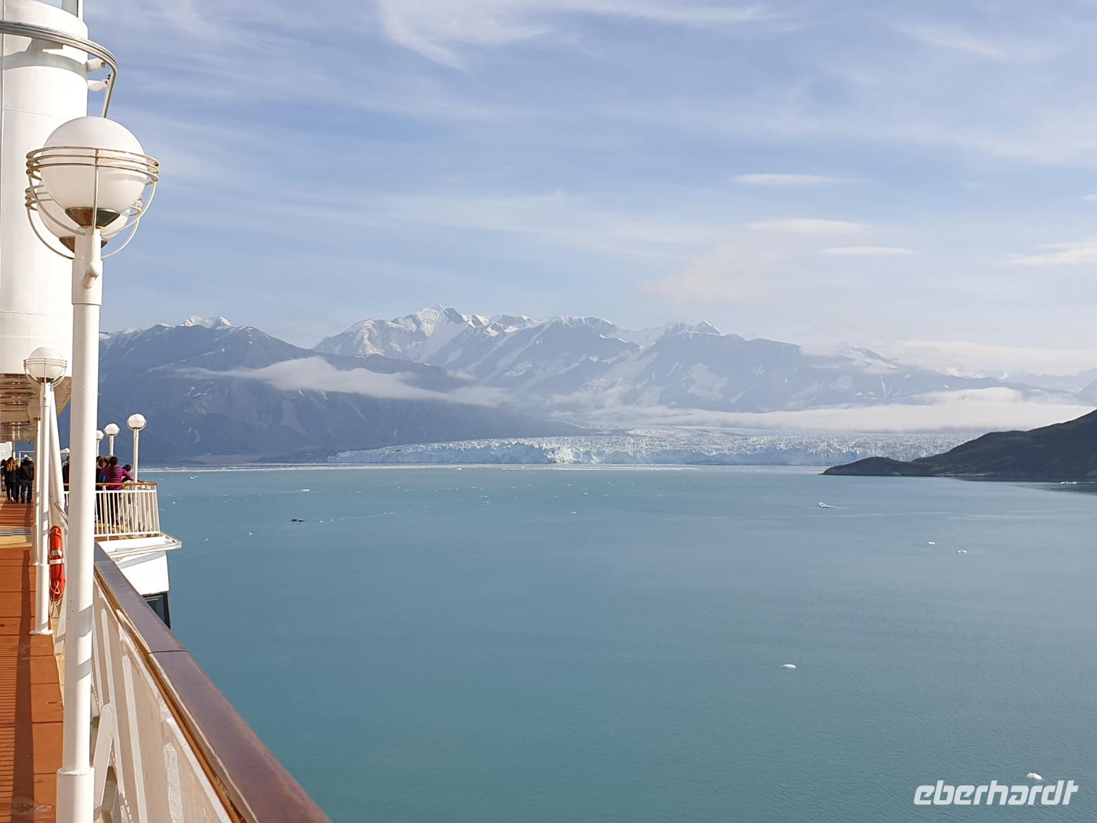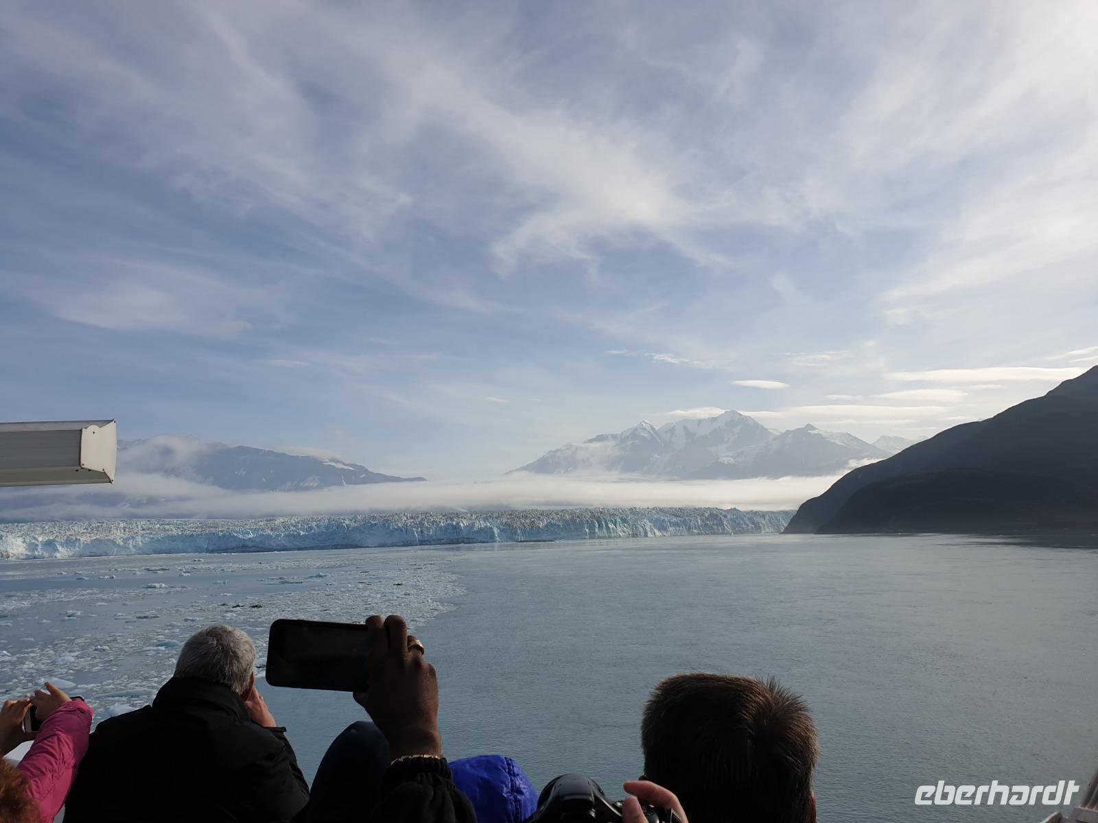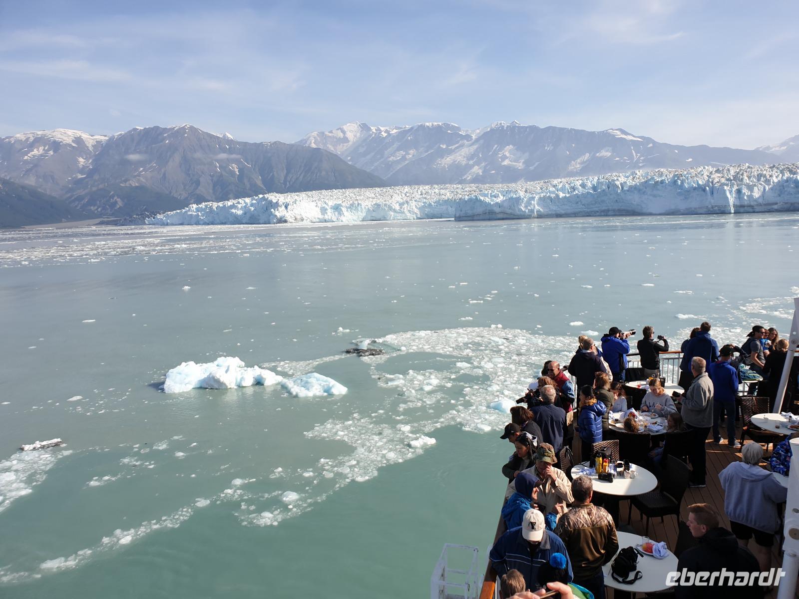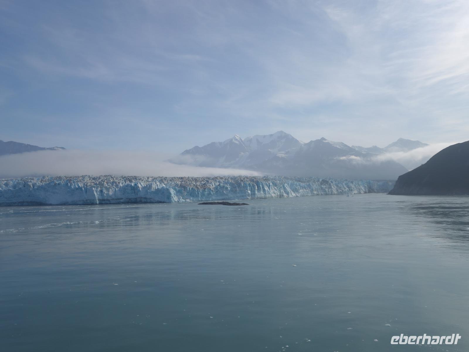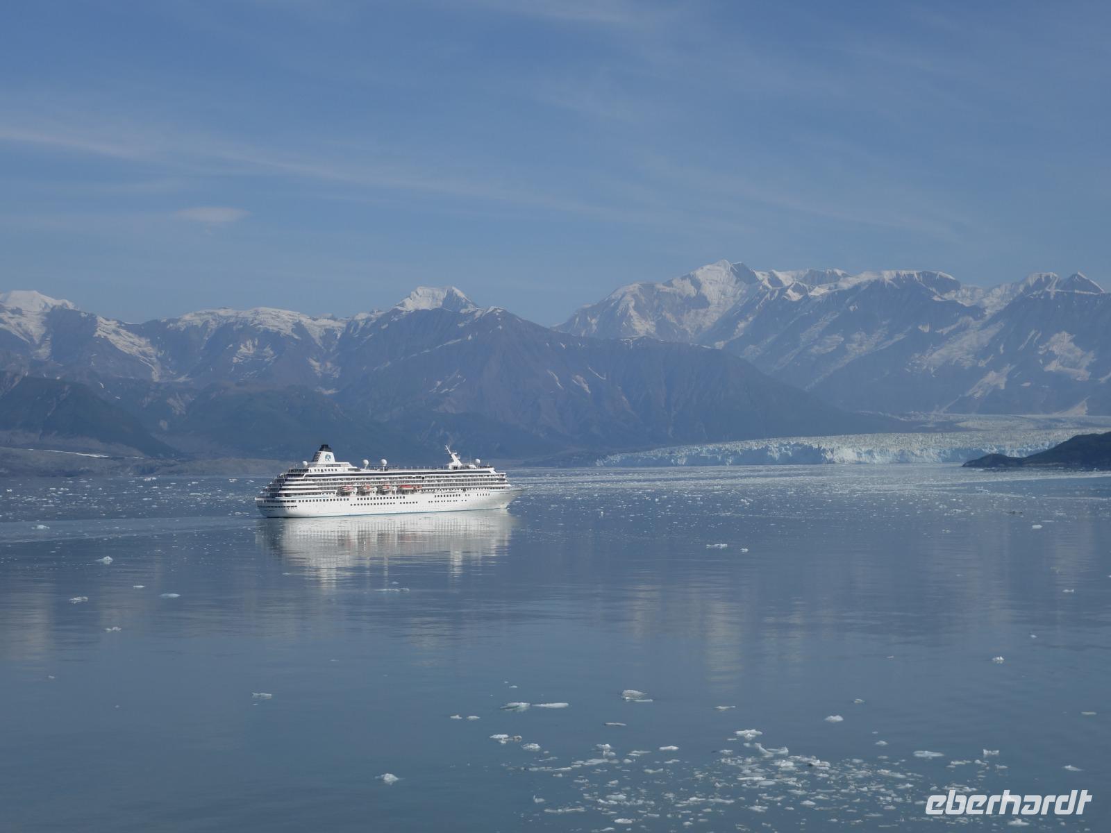 Der letzte Seetag bringt uns ganz nah an den gigantischen Hubbard Gletscher, Nordamerikas größten Gezeitengletscher. Er besteht aus 3.500km² blauen Eis und ist einer der aktivsten Gletscher in Alaska. Das können wir hautnah miterleben! Es klingt wie ein Gewitter, das aufzieht, kurz bevor der Gletscher kalbt. Der Hubbard Gletscher befindet sich zu einem Teil in Ostalaska und zum anderen Teil in Yukon, Kanada. Er wurde nach Gardiner Hubbard, dem Präsidenten der Bell Telefongesellschaft benannt. Bevor der Hubbard Gletscher das Meer erreicht, verbindet er sich im Westen mit den Valerie Gletscher. Es ist ein einmaliges Erlebnis und wieder einmal haben wir den Jackpot in Sachen Wetter gezogen. Ein herrlicher Morgen, erst liegt noch der Nebel über den „Hubbi", aber schon bald verschwindet diese und gibt die Sicht auf die wunderschönen in der Sonne glitzernde schneebedeckte Gipfel. Das auf dem Wasser treibende Eis mit dem gigantischen Gletscher im Hintergrund ist definitiv ein Bild für die Ewigkeit.