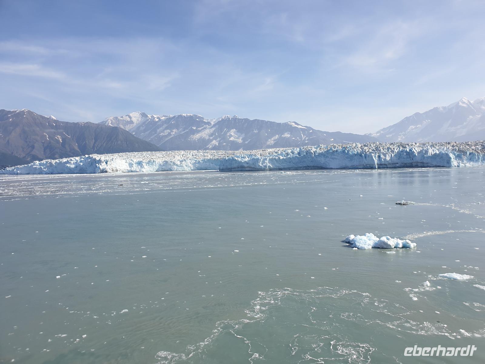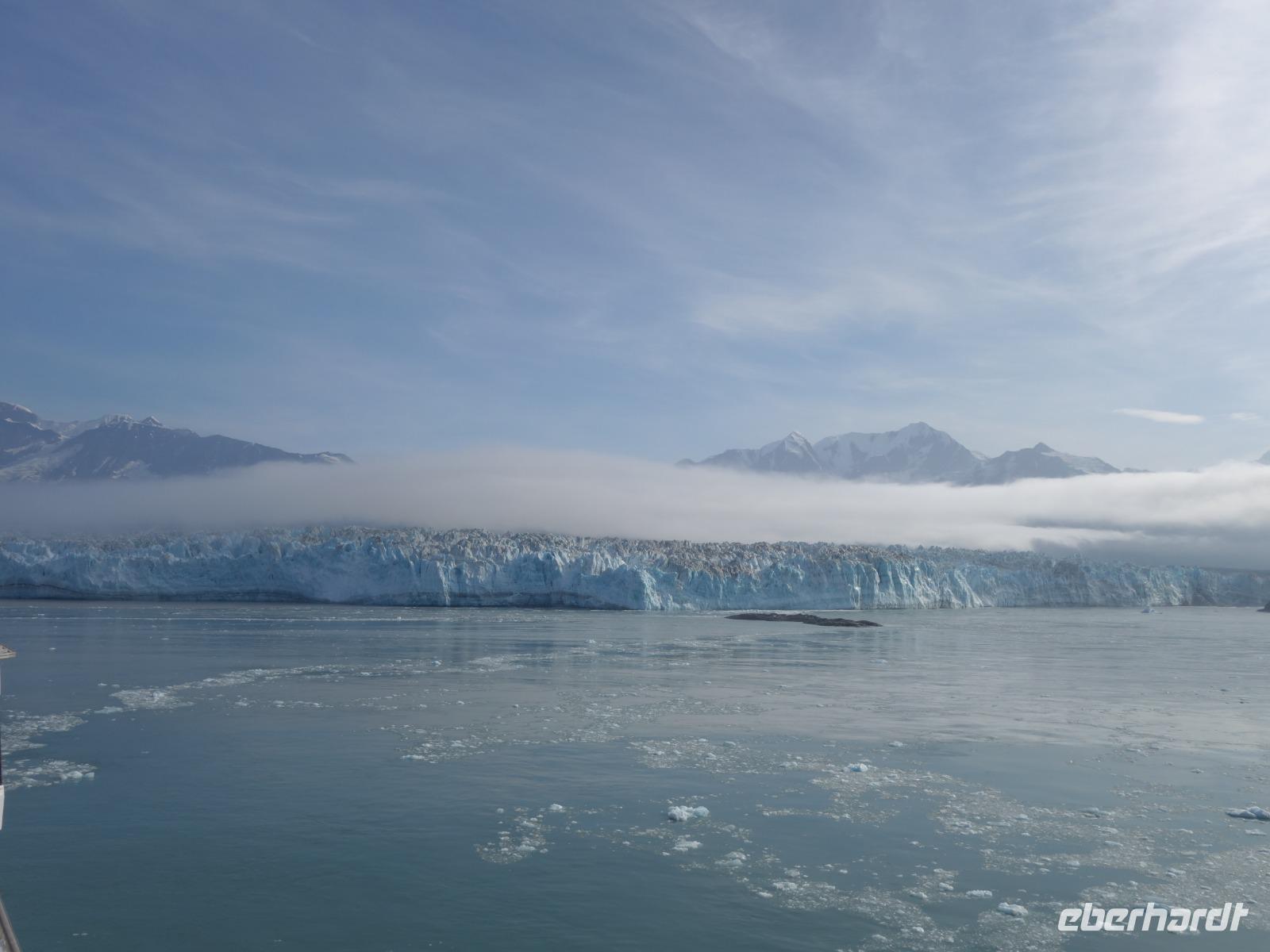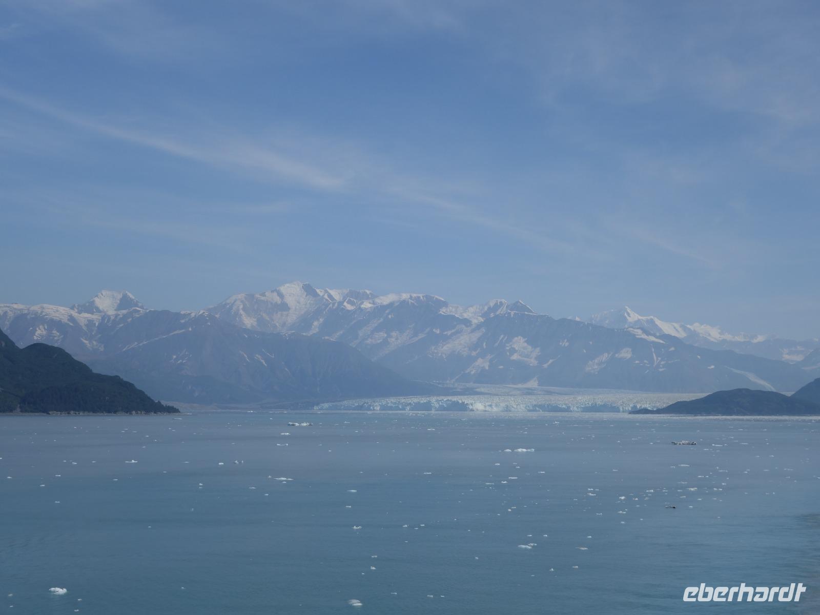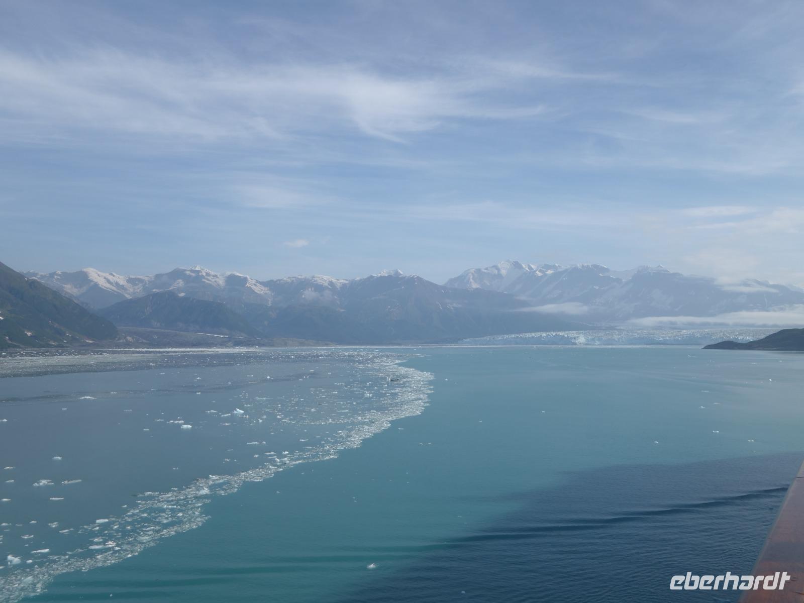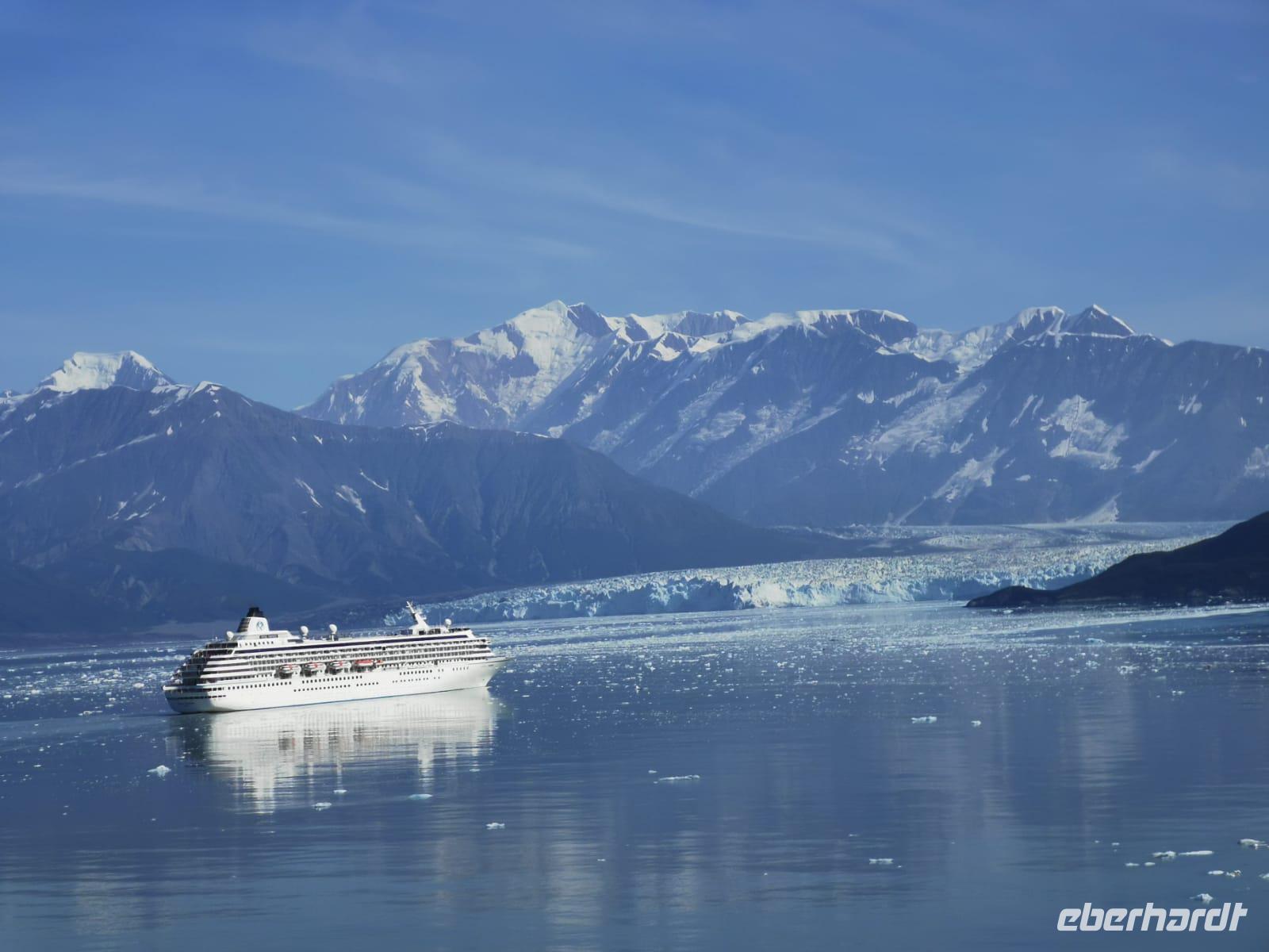 Der letzte Seetag bringt uns ganz nah an den gigantischen Hubbard Gletscher, Nordamerikas größten Gezeitengletscher. Er besteht aus 3.500km² blauen Eis und ist einer der aktivsten Gletscher in Alaska. Das können wir hautnah miterleben! Es klingt wie ein Gewitter, das aufzieht, kurz bevor der Gletscher kalbt. Der Hubbard Gletscher befindet sich zu einem Teil in Ostalaska und zum anderen Teil in Yukon, Kanada. Er wurde nach Gardiner Hubbard, dem Präsidenten der Bell Telefongesellschaft benannt. Bevor der Hubbard Gletscher das Meer erreicht, verbindet er sich im Westen mit den Valerie Gletscher. Es ist ein einmaliges Erlebnis und wieder einmal haben wir den Jackpot in Sachen Wetter gezogen. Ein herrlicher Morgen, erst liegt noch der Nebel über den „Hubbi", aber schon bald verschwindet diese und gibt die Sicht auf die wunderschönen in der Sonne glitzernde schneebedeckte Gipfel. Das auf dem Wasser treibende Eis mit dem gigantischen Gletscher im Hintergrund ist definitiv ein Bild für die Ewigkeit.
