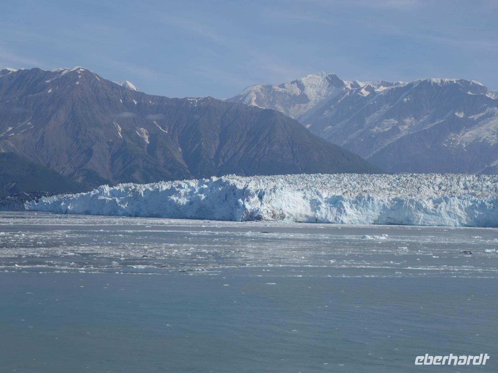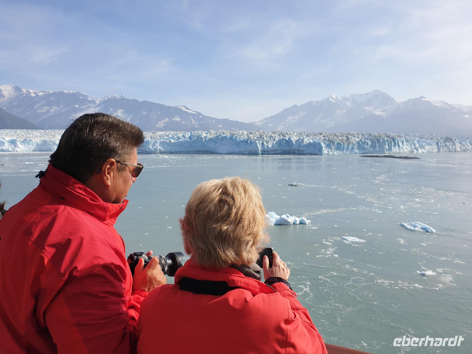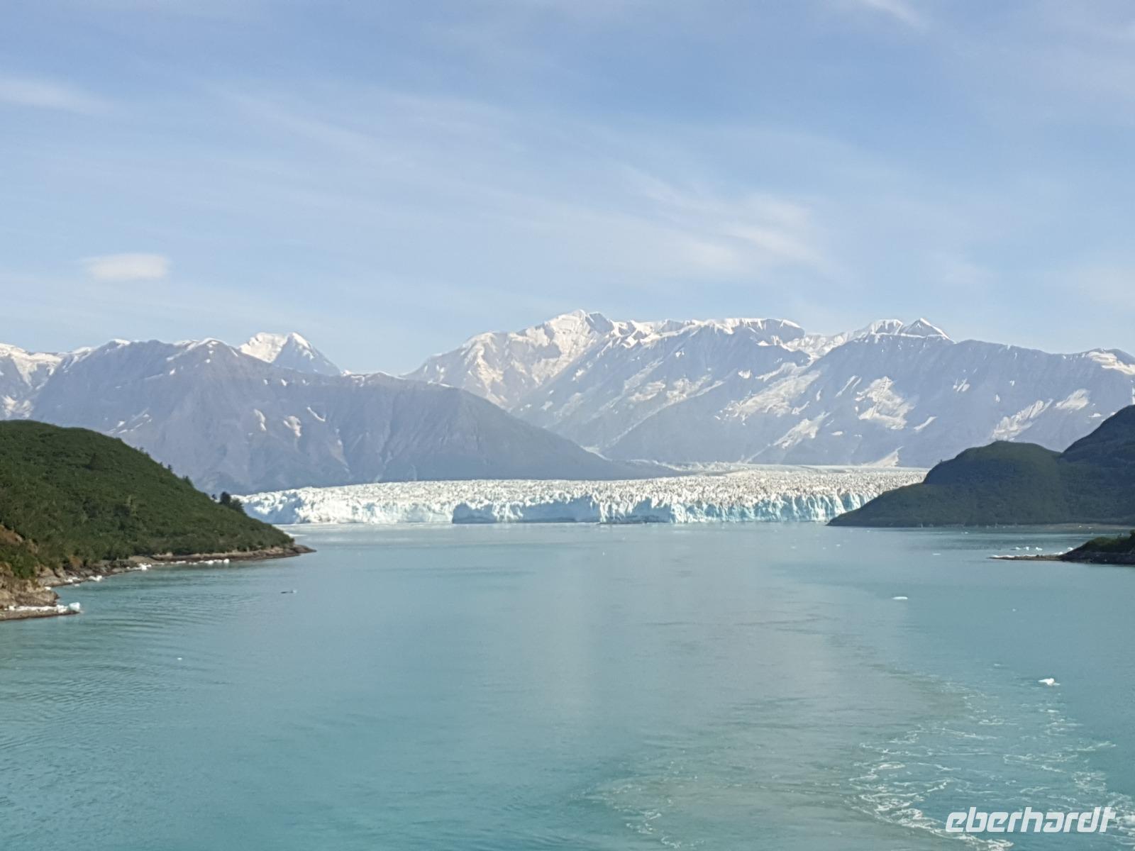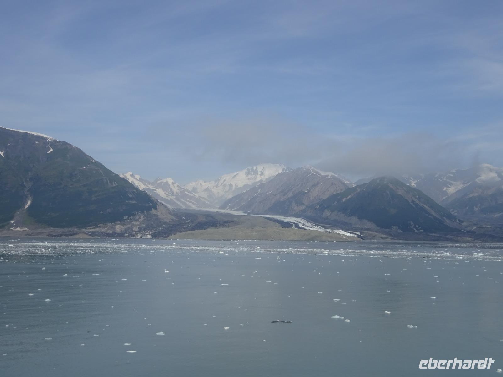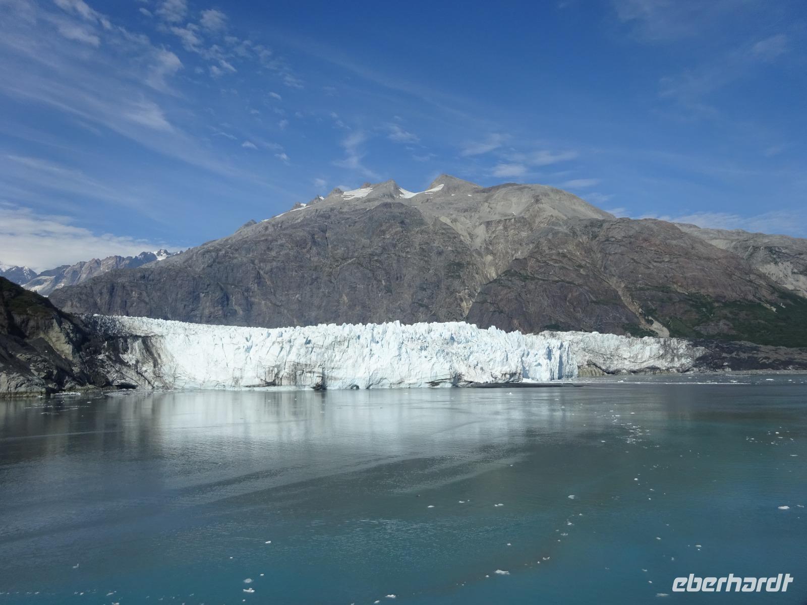 Der letzte Seetag bringt uns ganz nah an den gigantischen Hubbard Gletscher, Nordamerikas größten Gezeitengletscher. Er besteht aus 3.500km² blauen Eis und ist einer der aktivsten Gletscher in Alaska. Das können wir hautnah miterleben! Es klingt wie ein Gewitter, das aufzieht, kurz bevor der Gletscher kalbt. Der Hubbard Gletscher befindet sich zu einem Teil in Ostalaska und zum anderen Teil in Yukon, Kanada. Er wurde nach Gardiner Hubbard, dem Präsidenten der Bell Telefongesellschaft benannt. Bevor der Hubbard Gletscher das Meer erreicht, verbindet er sich im Westen mit den Valerie Gletscher. Es ist ein einmaliges Erlebnis und wieder einmal haben wir den Jackpot in Sachen Wetter gezogen. Ein herrlicher Morgen, erst liegt noch der Nebel über den „Hubbi", aber schon bald verschwindet diese und gibt die Sicht auf die wunderschönen in der Sonne glitzernde schneebedeckte Gipfel. Das auf dem Wasser treibende Eis mit dem gigantischen Gletscher im Hintergrund ist definitiv ein Bild für die Ewigkeit.