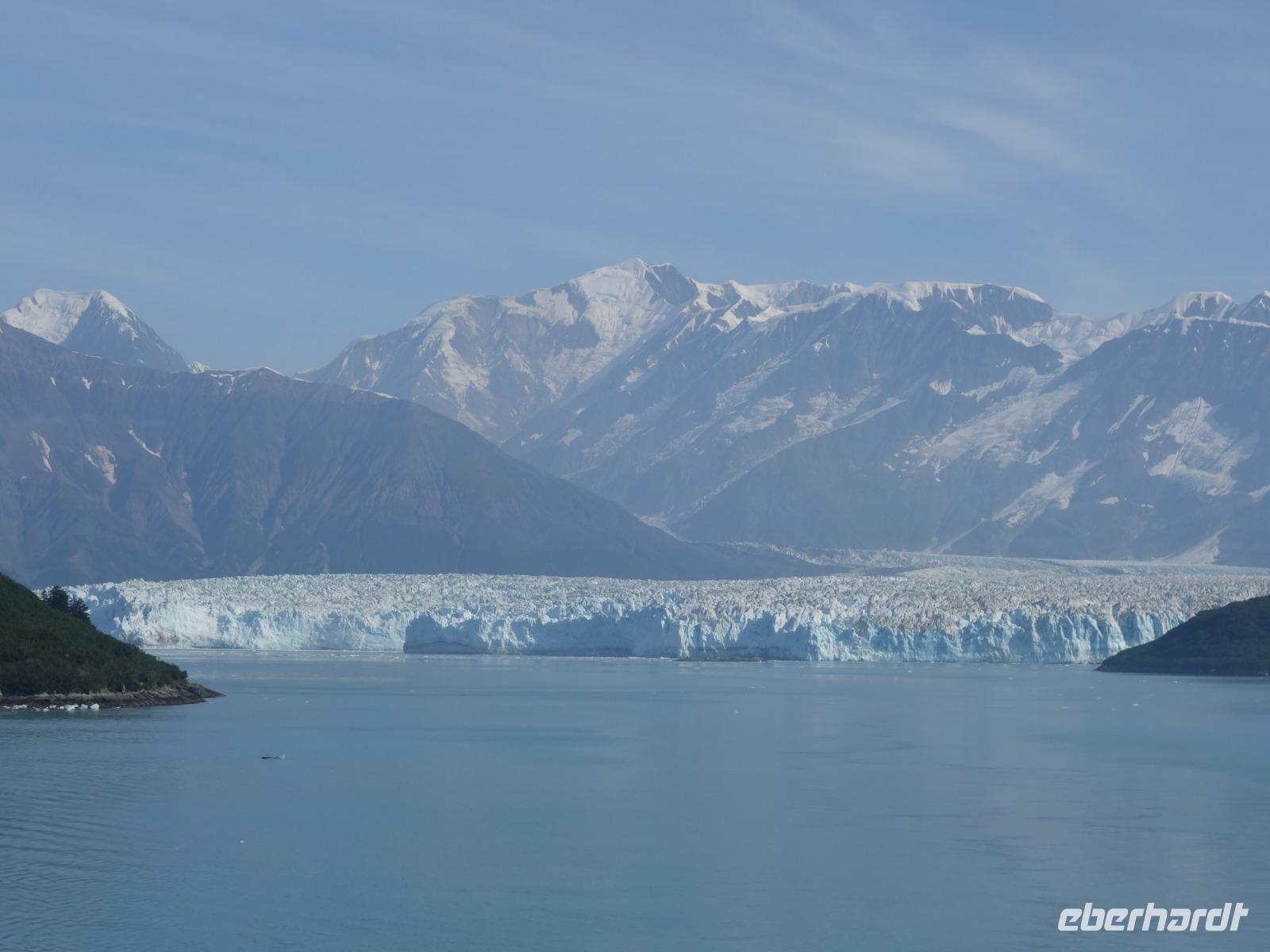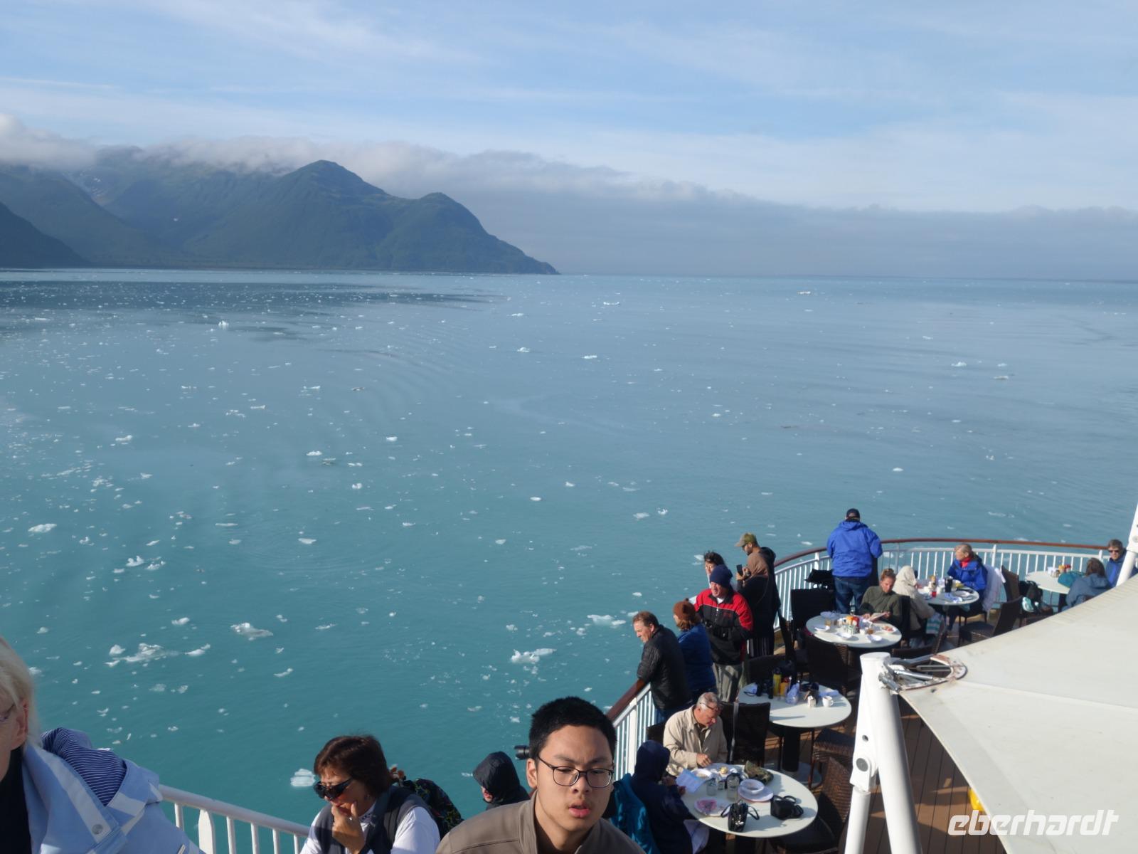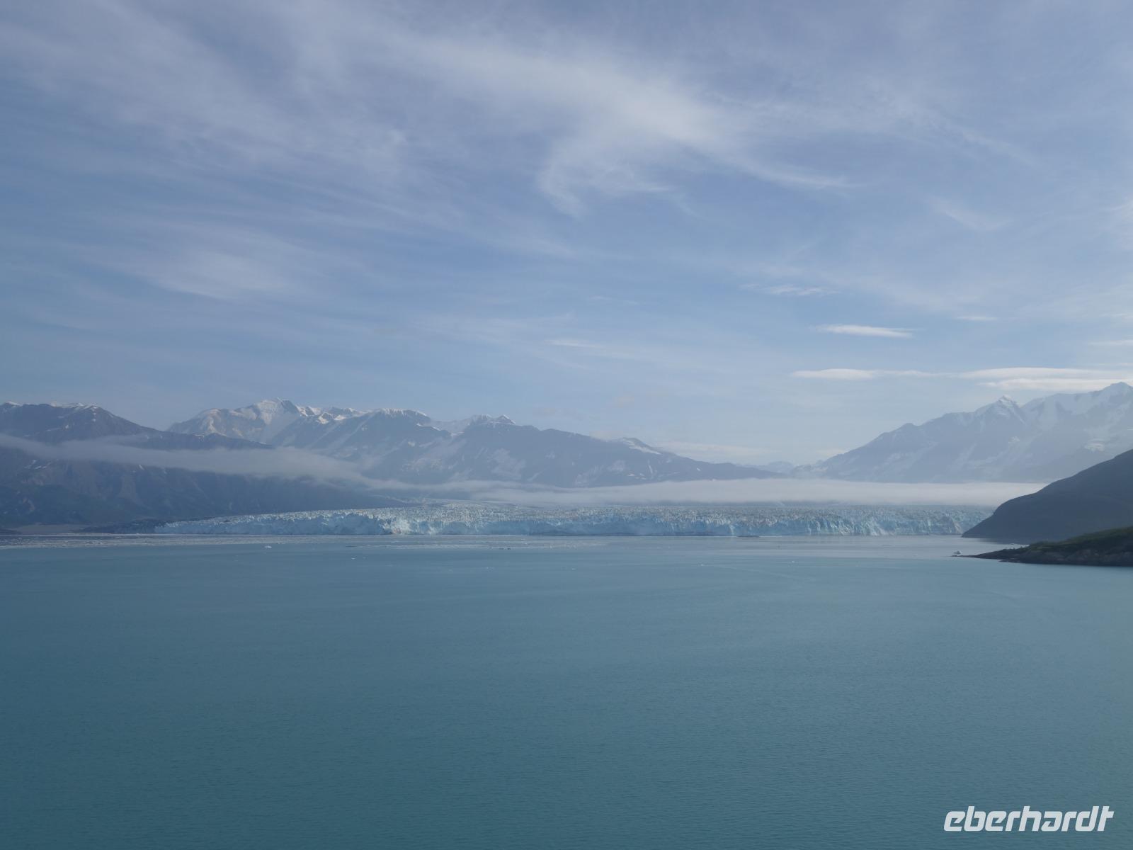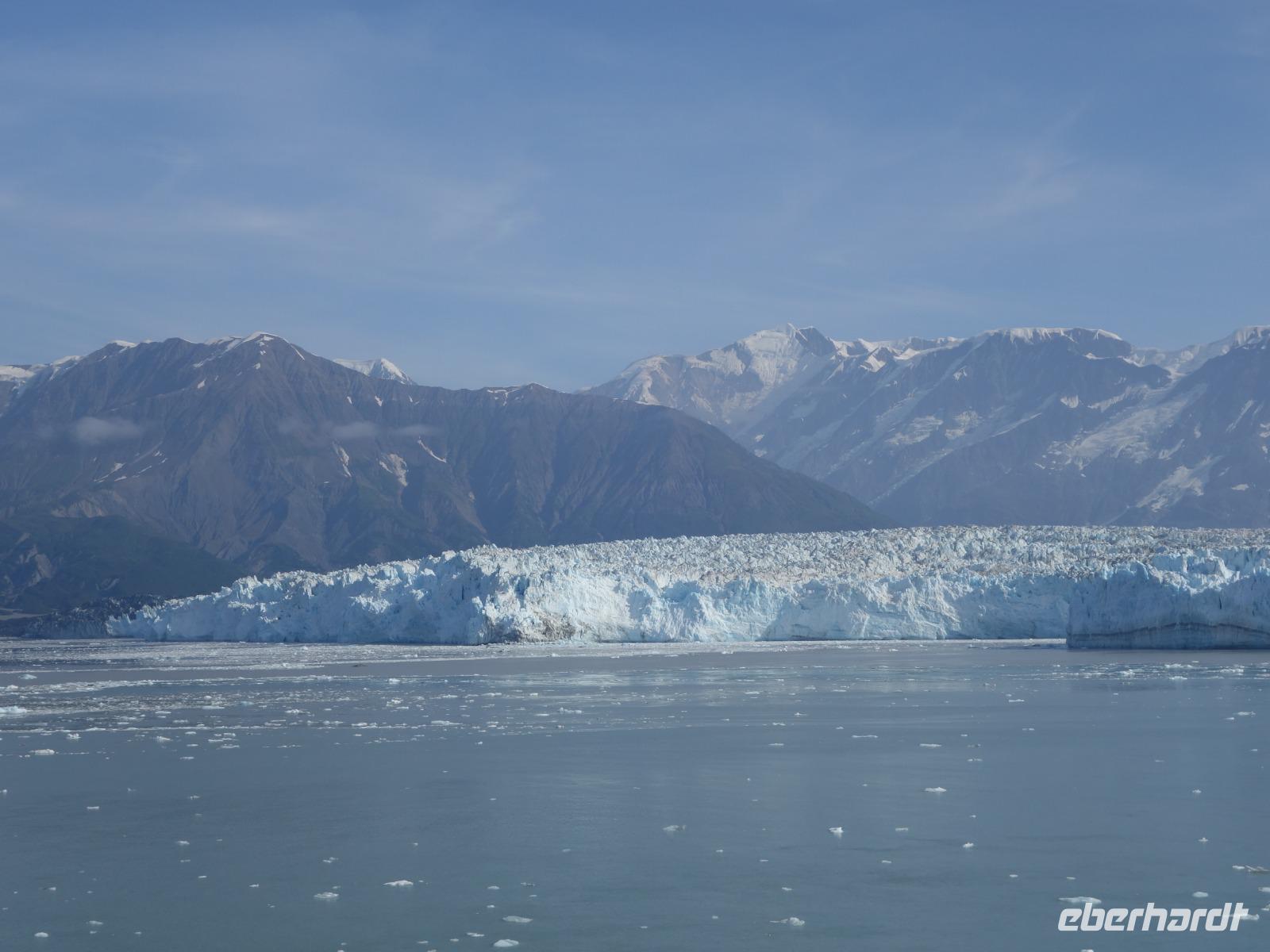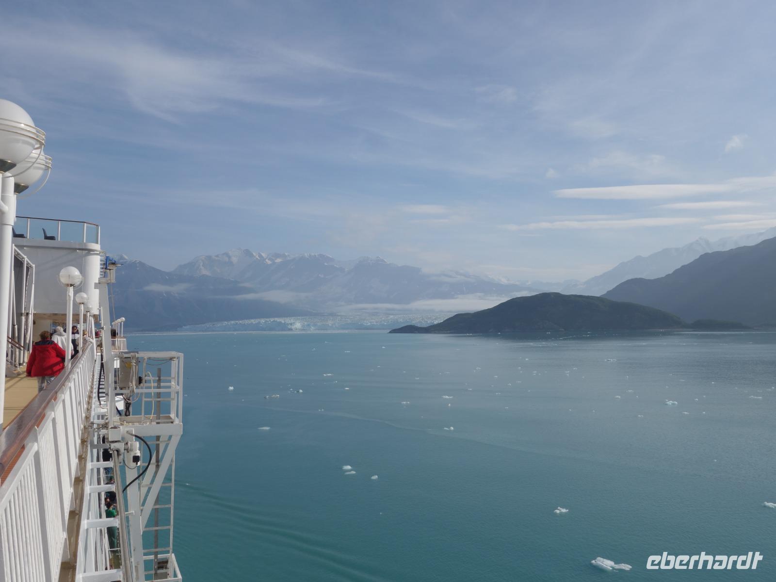 Der letzte Seetag bringt uns ganz nah an den gigantischen Hubbard Gletscher, Nordamerikas größten Gezeitengletscher. Er besteht aus 3.500km² blauen Eis und ist einer der aktivsten Gletscher in Alaska. Das können wir hautnah miterleben! Es klingt wie ein Gewitter, das aufzieht, kurz bevor der Gletscher kalbt. Der Hubbard Gletscher befindet sich zu einem Teil in Ostalaska und zum anderen Teil in Yukon, Kanada. Er wurde nach Gardiner Hubbard, dem Präsidenten der Bell Telefongesellschaft benannt. Bevor der Hubbard Gletscher das Meer erreicht, verbindet er sich im Westen mit den Valerie Gletscher. Es ist ein einmaliges Erlebnis und wieder einmal haben wir den Jackpot in Sachen Wetter gezogen. Ein herrlicher Morgen, erst liegt noch der Nebel über den „Hubbi", aber schon bald verschwindet diese und gibt die Sicht auf die wunderschönen in der Sonne glitzernde schneebedeckte Gipfel. Das auf dem Wasser treibende Eis mit dem gigantischen Gletscher im Hintergrund ist definitiv ein Bild für die Ewigkeit.