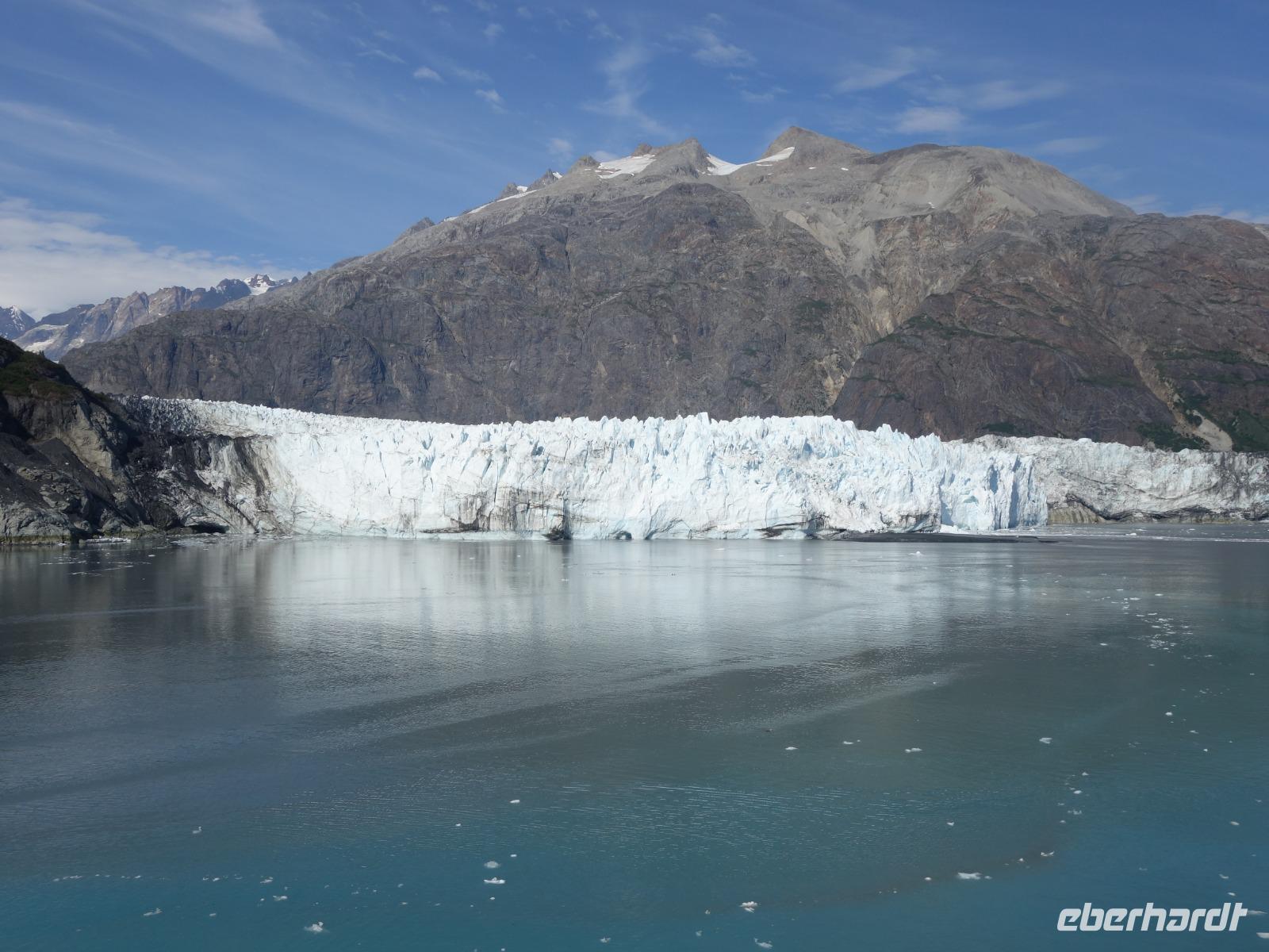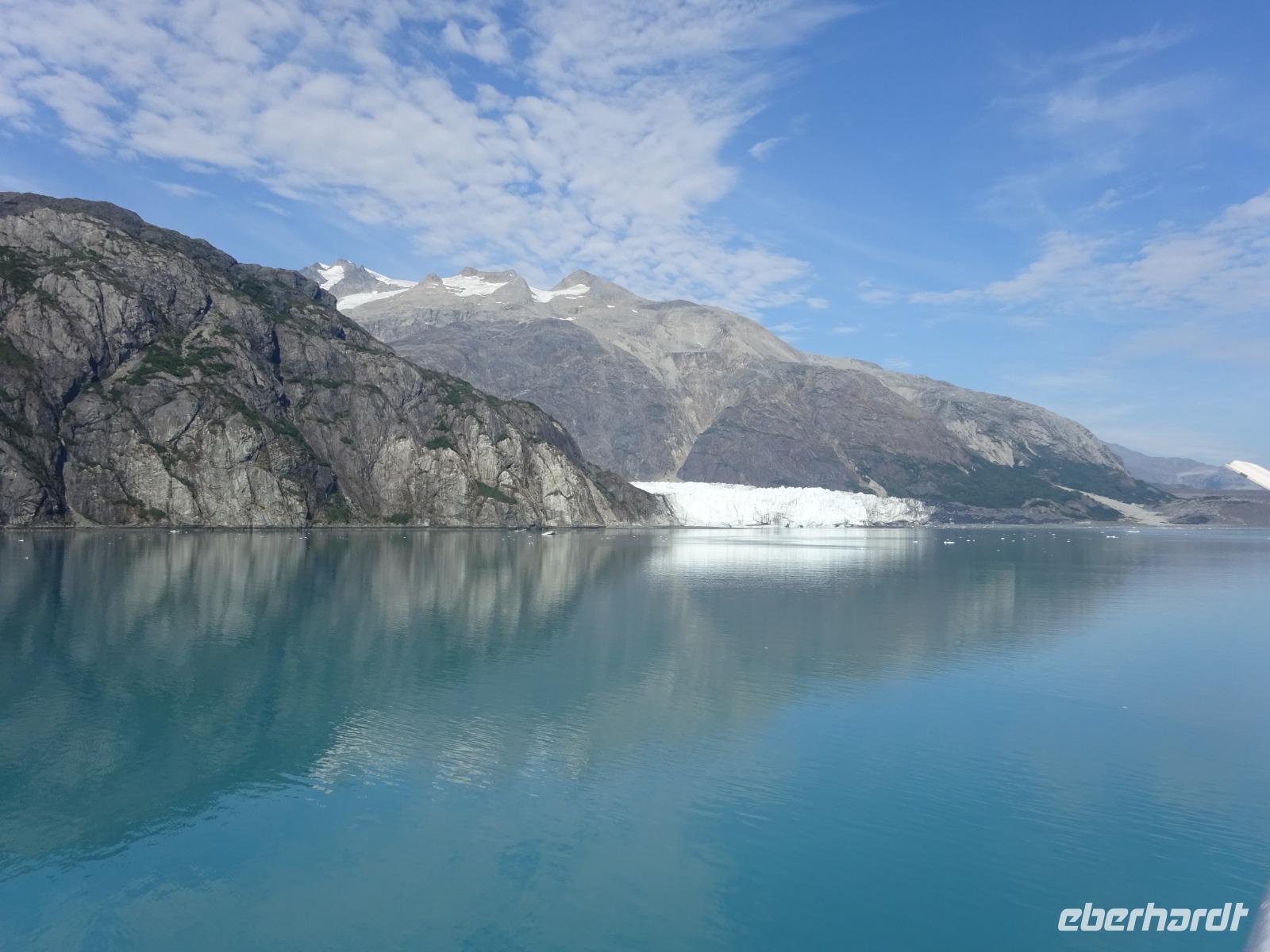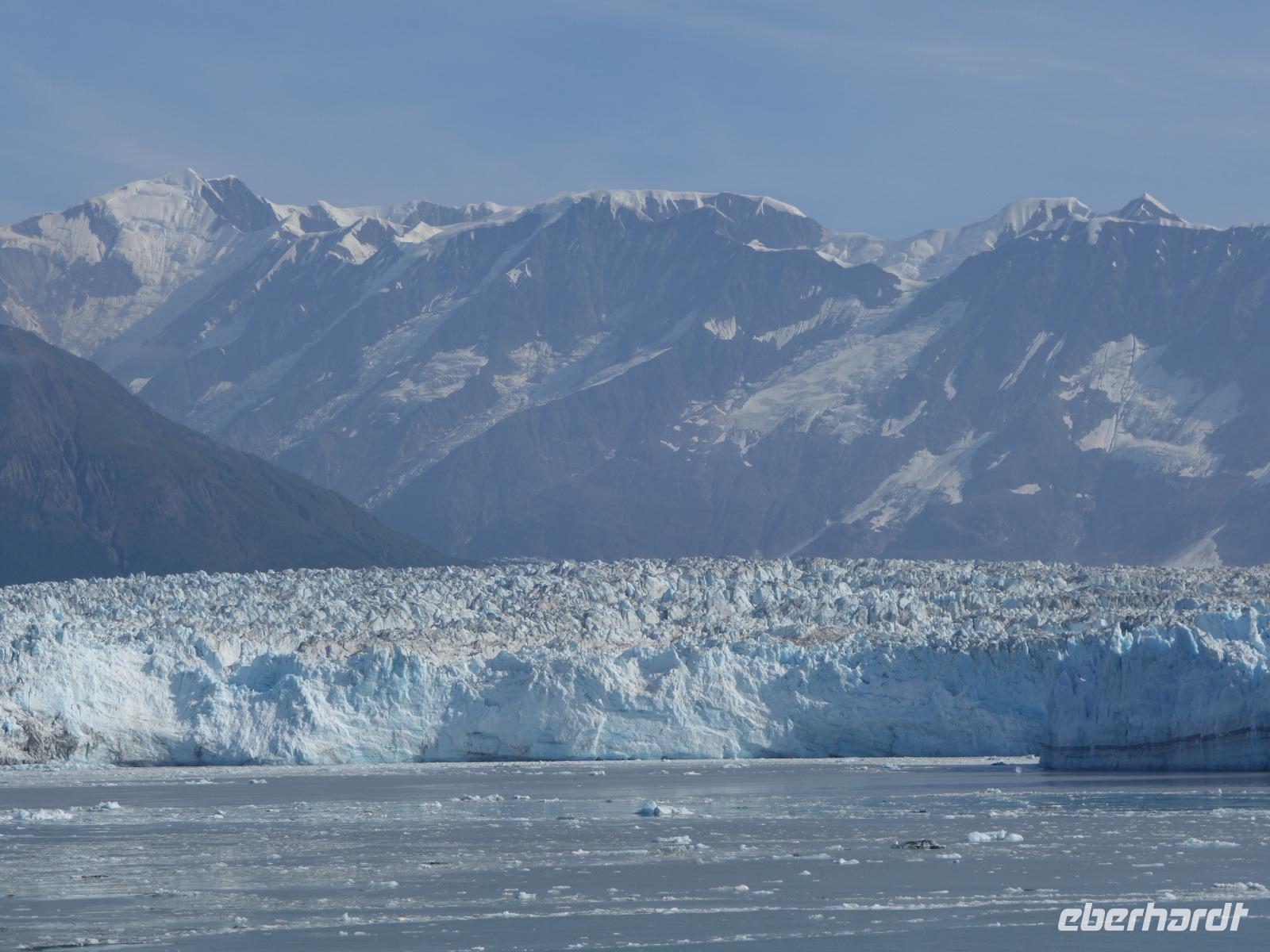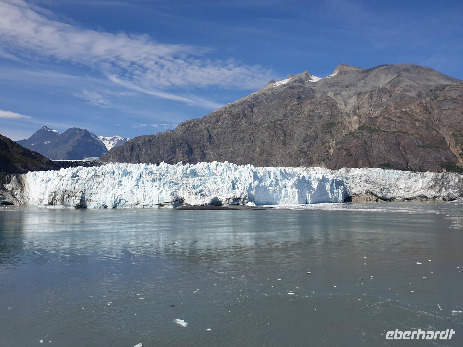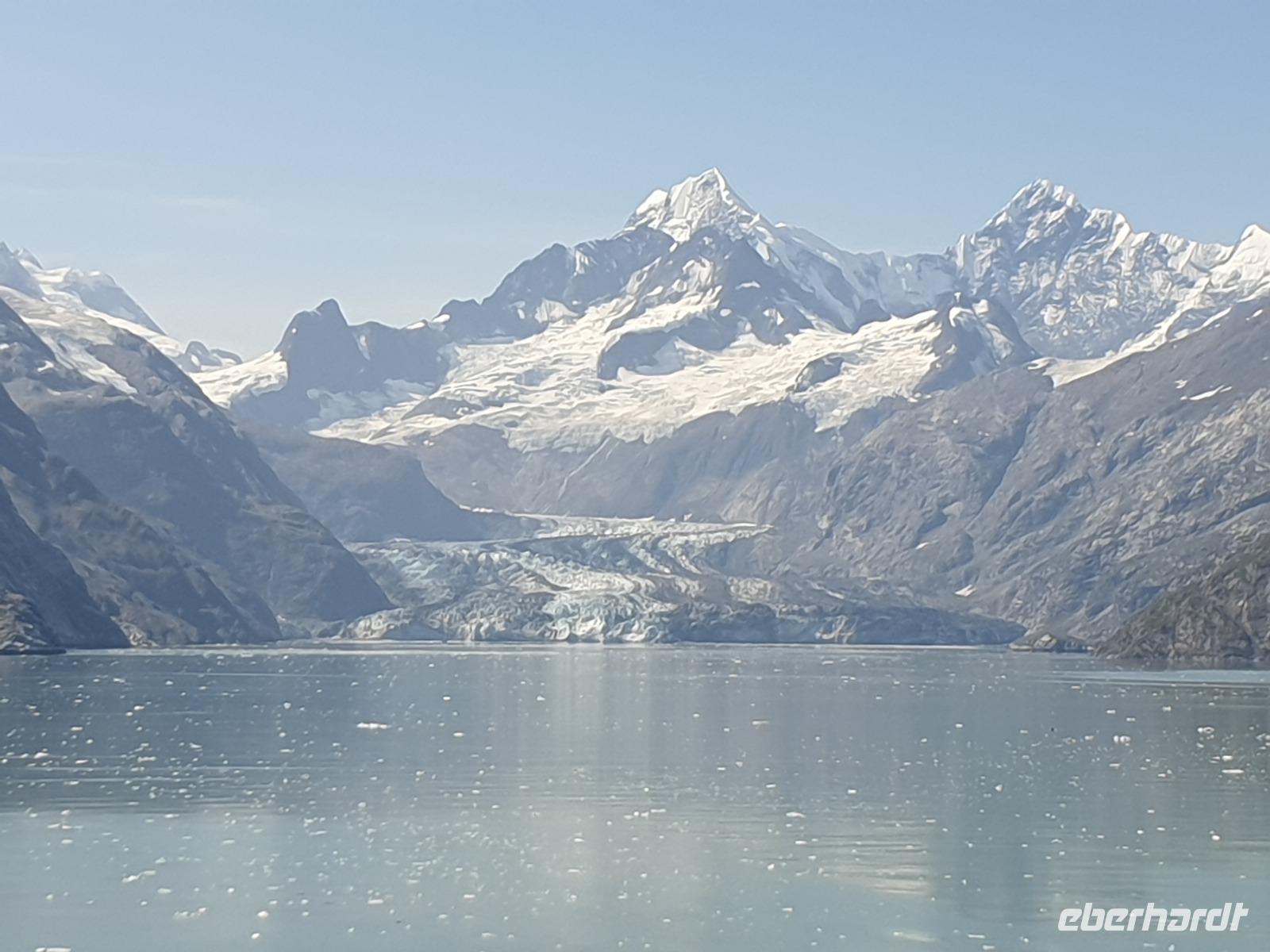 Der letzte Seetag bringt uns ganz nah an den gigantischen Hubbard Gletscher, Nordamerikas größten Gezeitengletscher. Er besteht aus 3.500km² blauen Eis und ist einer der aktivsten Gletscher in Alaska. Das können wir hautnah miterleben! Es klingt wie ein Gewitter, das aufzieht, kurz bevor der Gletscher kalbt. Der Hubbard Gletscher befindet sich zu einem Teil in Ostalaska und zum anderen Teil in Yukon, Kanada. Er wurde nach Gardiner Hubbard, dem Präsidenten der Bell Telefongesellschaft benannt. Bevor der Hubbard Gletscher das Meer erreicht, verbindet er sich im Westen mit den Valerie Gletscher. Es ist ein einmaliges Erlebnis und wieder einmal haben wir den Jackpot in Sachen Wetter gezogen. Ein herrlicher Morgen, erst liegt noch der Nebel über den „Hubbi", aber schon bald verschwindet diese und gibt die Sicht auf die wunderschönen in der Sonne glitzernde schneebedeckte Gipfel. Das auf dem Wasser treibende Eis mit dem gigantischen Gletscher im Hintergrund ist definitiv ein Bild für die Ewigkeit.