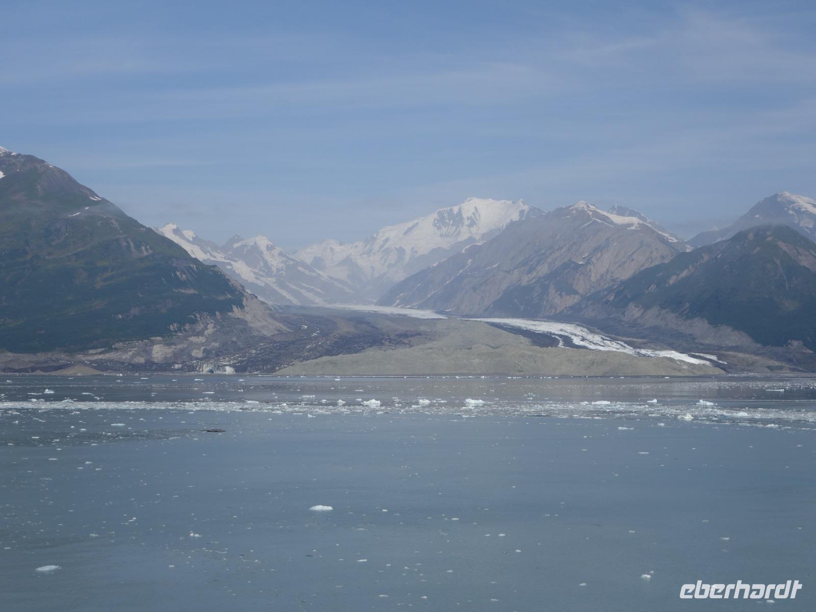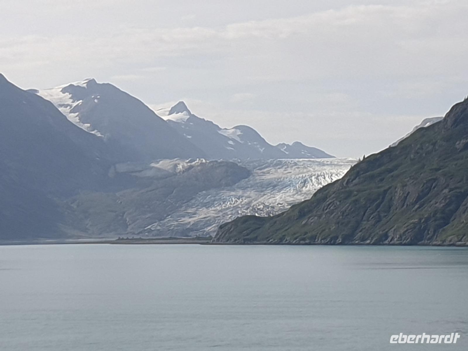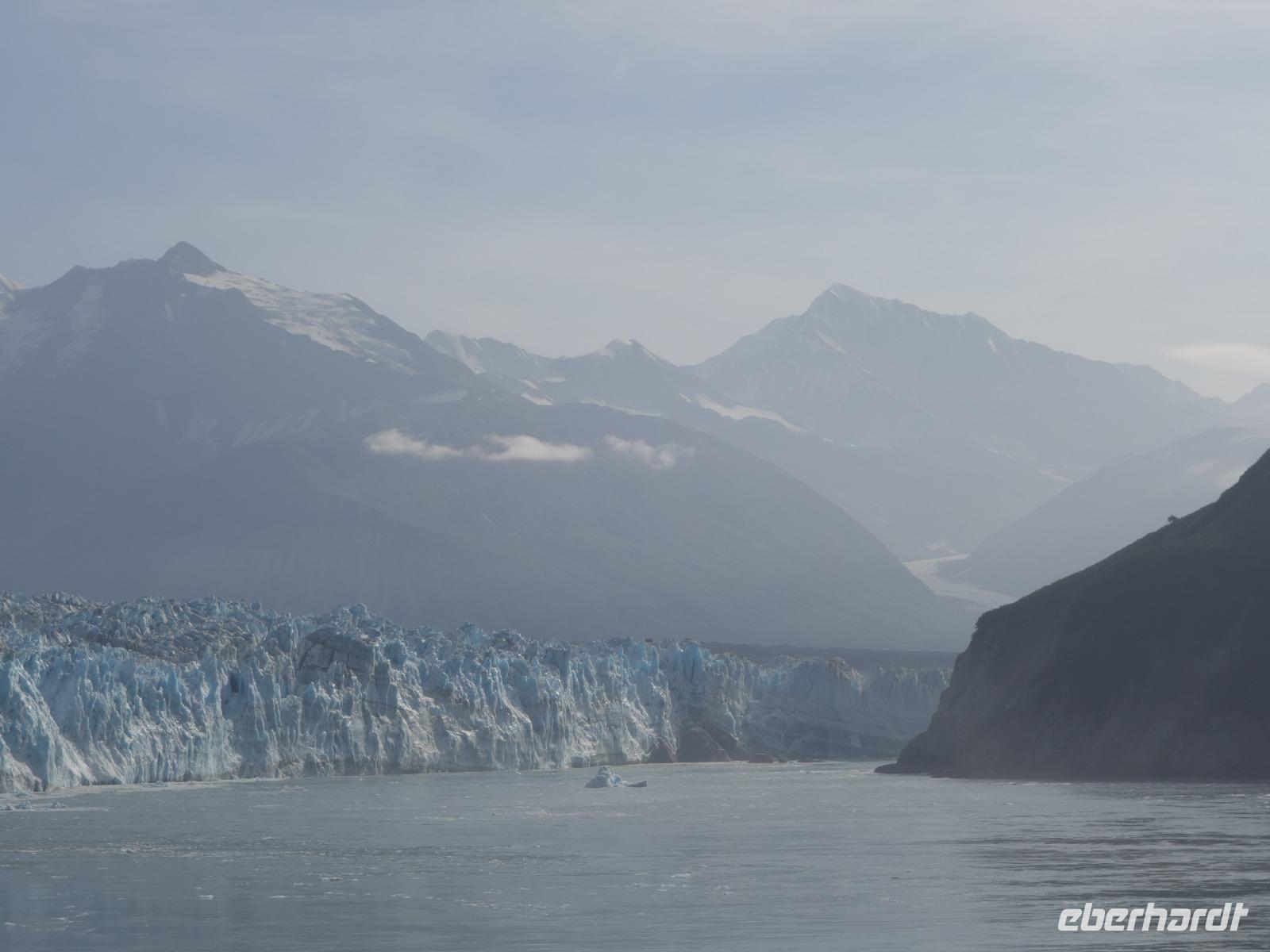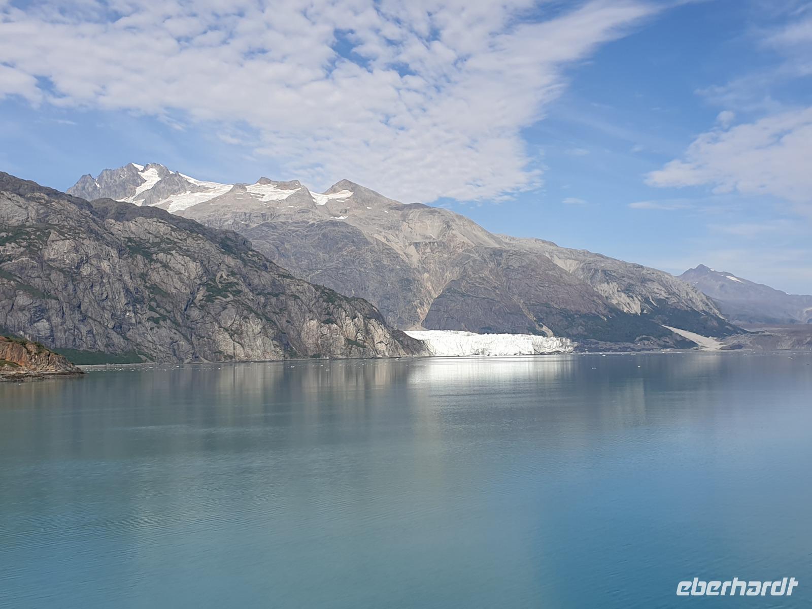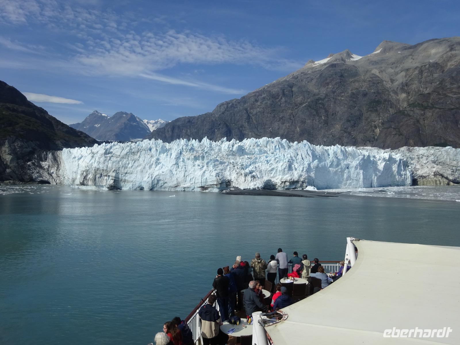 Der letzte Seetag bringt uns ganz nah an den gigantischen Hubbard Gletscher, Nordamerikas größten Gezeitengletscher. Er besteht aus 3.500km² blauen Eis und ist einer der aktivsten Gletscher in Alaska. Das können wir hautnah miterleben! Es klingt wie ein Gewitter, das aufzieht, kurz bevor der Gletscher kalbt. Der Hubbard Gletscher befindet sich zu einem Teil in Ostalaska und zum anderen Teil in Yukon, Kanada. Er wurde nach Gardiner Hubbard, dem Präsidenten der Bell Telefongesellschaft benannt. Bevor der Hubbard Gletscher das Meer erreicht, verbindet er sich im Westen mit den Valerie Gletscher. Es ist ein einmaliges Erlebnis und wieder einmal haben wir den Jackpot in Sachen Wetter gezogen. Ein herrlicher Morgen, erst liegt noch der Nebel über den „Hubbi", aber schon bald verschwindet diese und gibt die Sicht auf die wunderschönen in der Sonne glitzernde schneebedeckte Gipfel. Das auf dem Wasser treibende Eis mit dem gigantischen Gletscher im Hintergrund ist definitiv ein Bild für die Ewigkeit.