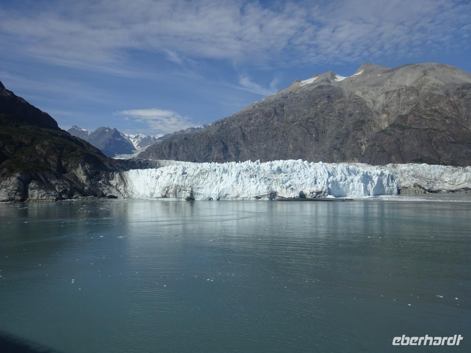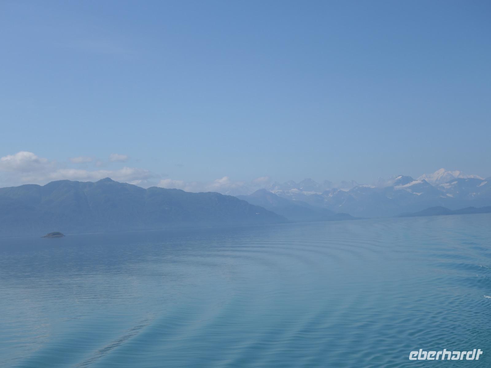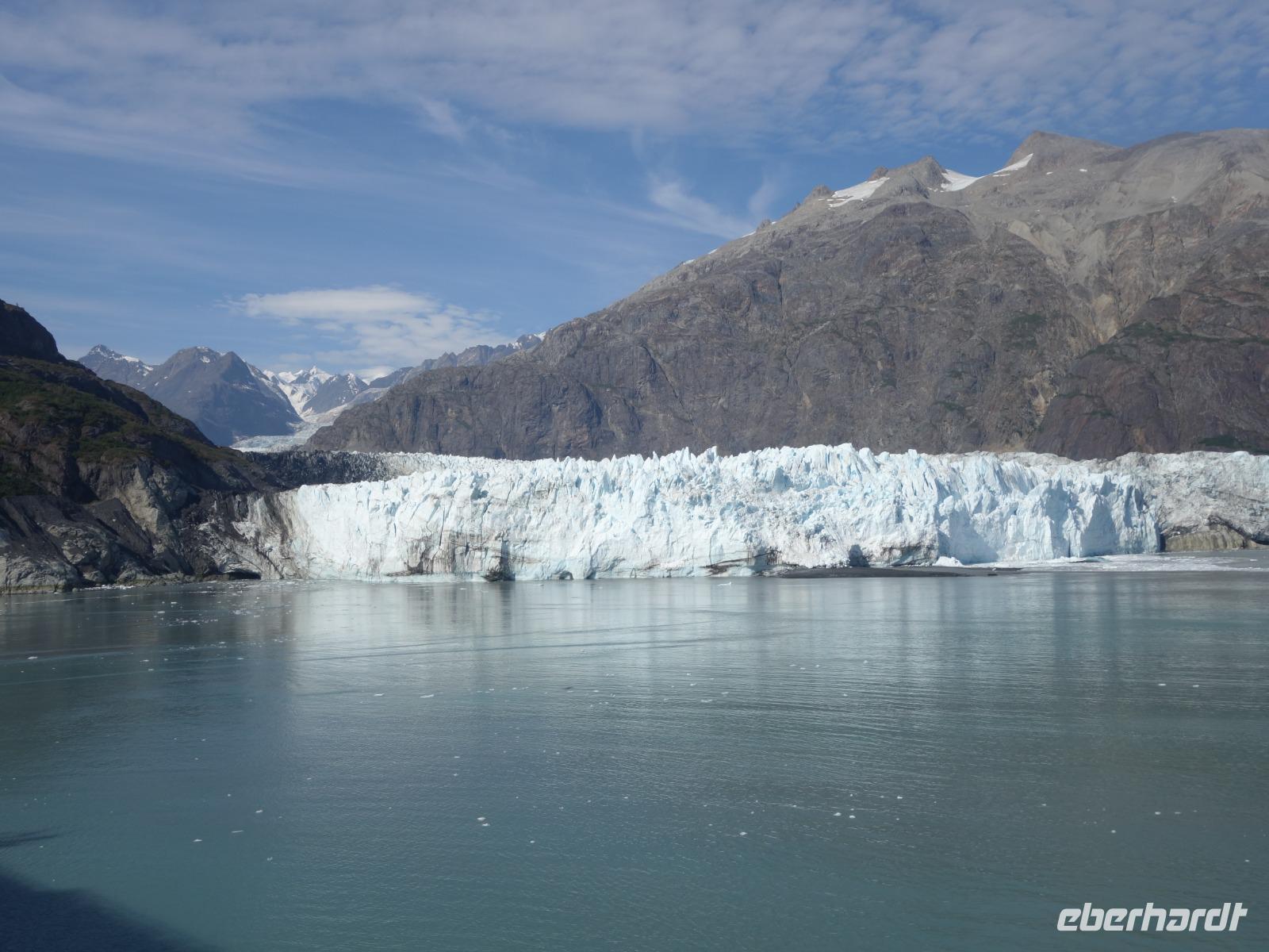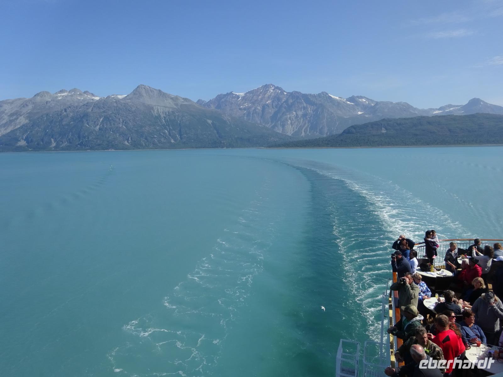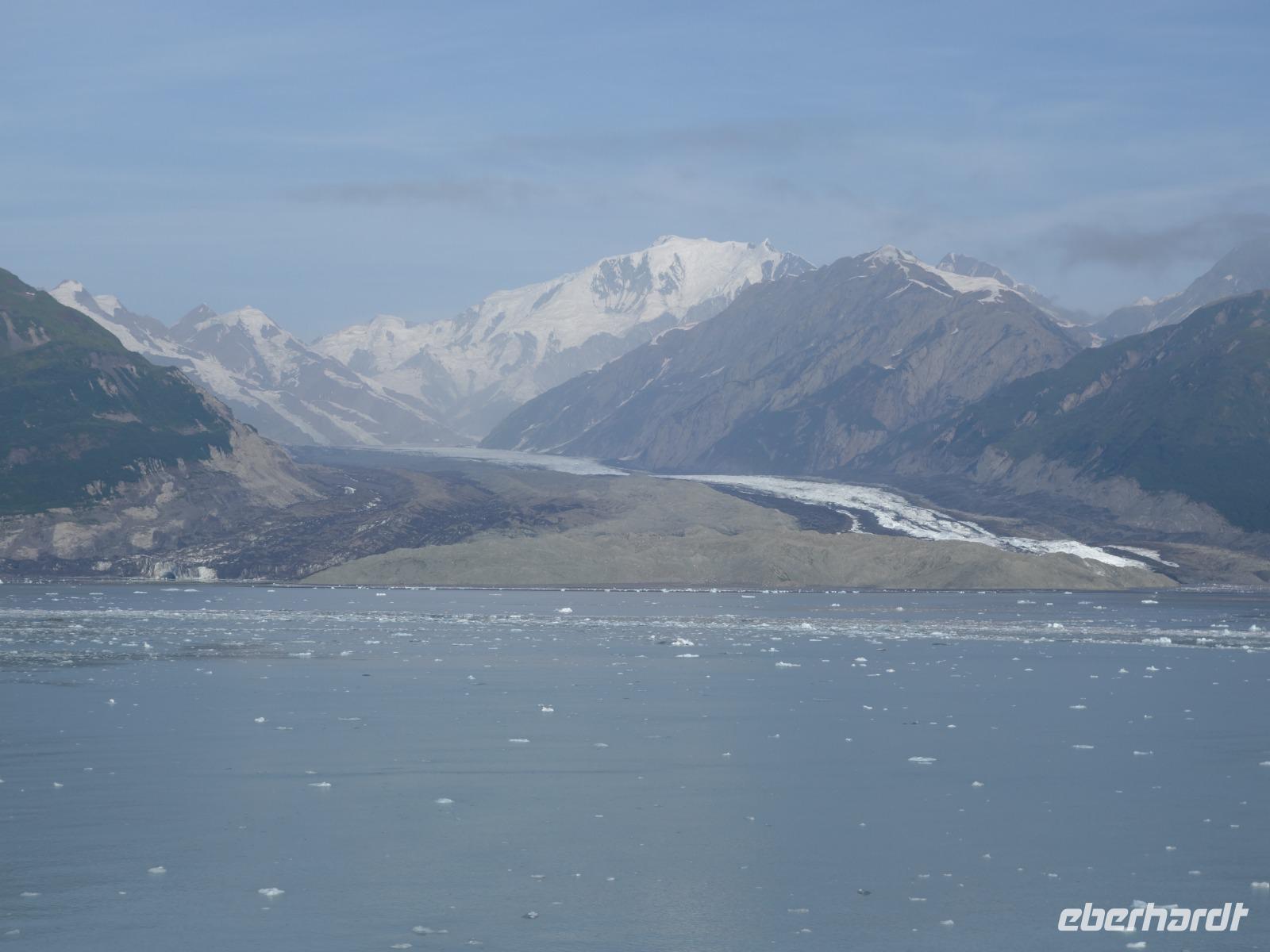 Der letzte Seetag bringt uns ganz nah an den gigantischen Hubbard Gletscher, Nordamerikas größten Gezeitengletscher. Er besteht aus 3.500km² blauen Eis und ist einer der aktivsten Gletscher in Alaska. Das können wir hautnah miterleben! Es klingt wie ein Gewitter, das aufzieht, kurz bevor der Gletscher kalbt. Der Hubbard Gletscher befindet sich zu einem Teil in Ostalaska und zum anderen Teil in Yukon, Kanada. Er wurde nach Gardiner Hubbard, dem Präsidenten der Bell Telefongesellschaft benannt. Bevor der Hubbard Gletscher das Meer erreicht, verbindet er sich im Westen mit den Valerie Gletscher. Es ist ein einmaliges Erlebnis und wieder einmal haben wir den Jackpot in Sachen Wetter gezogen. Ein herrlicher Morgen, erst liegt noch der Nebel über den „Hubbi", aber schon bald verschwindet diese und gibt die Sicht auf die wunderschönen in der Sonne glitzernde schneebedeckte Gipfel. Das auf dem Wasser treibende Eis mit dem gigantischen Gletscher im Hintergrund ist definitiv ein Bild für die Ewigkeit.