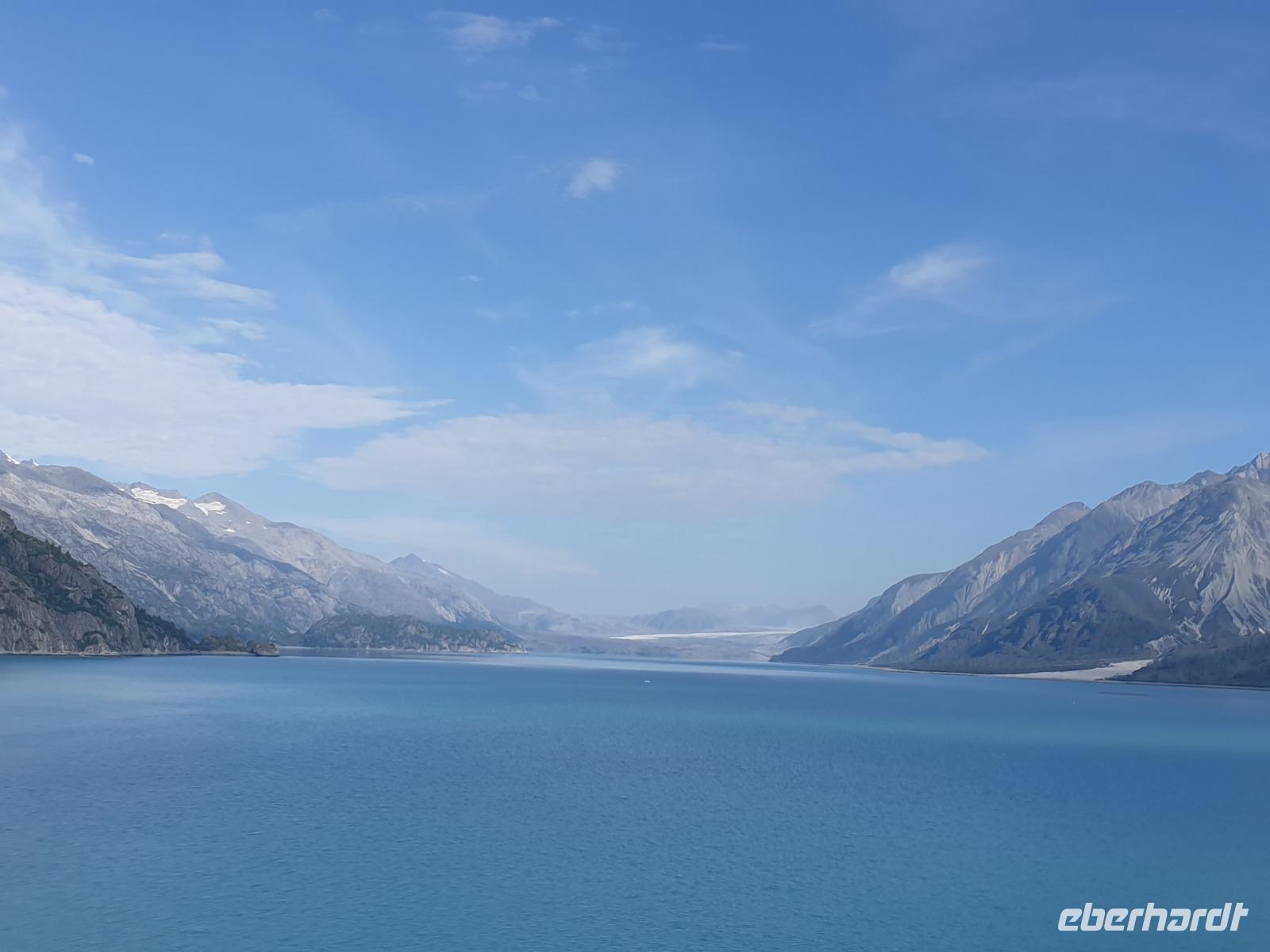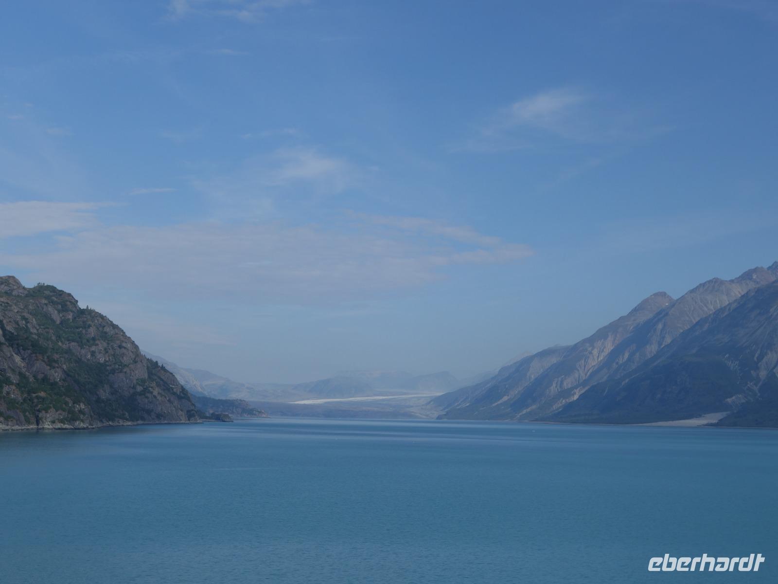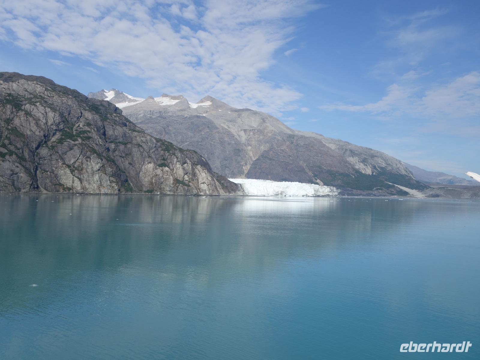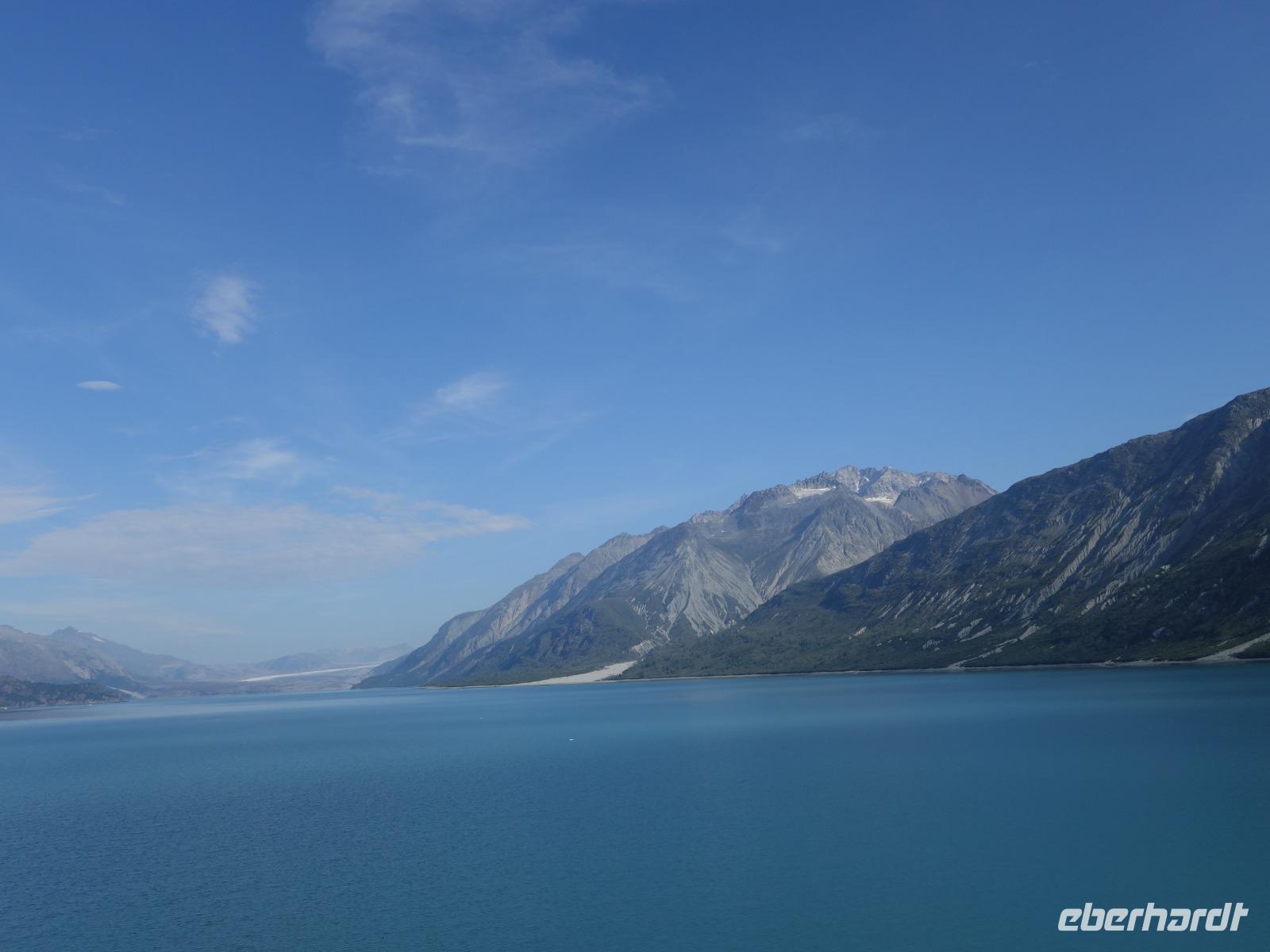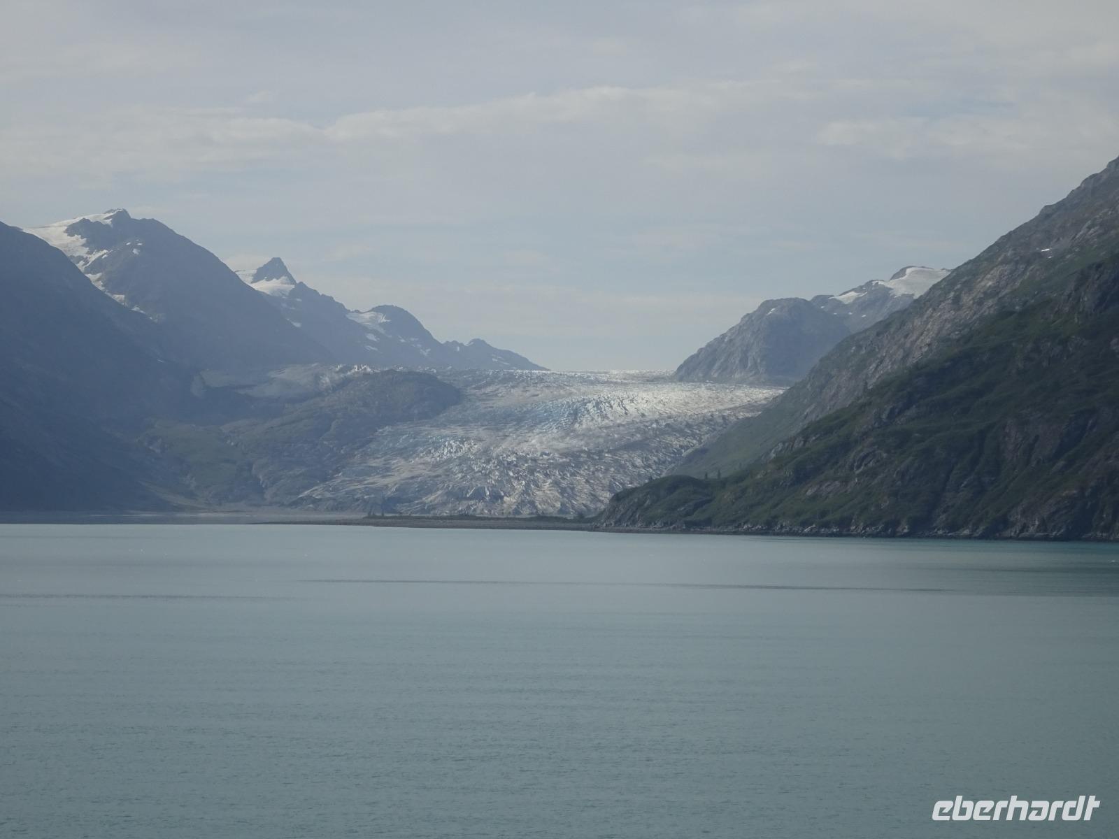 Der letzte Seetag bringt uns ganz nah an den gigantischen Hubbard Gletscher, Nordamerikas größten Gezeitengletscher. Er besteht aus 3.500km² blauen Eis und ist einer der aktivsten Gletscher in Alaska. Das können wir hautnah miterleben! Es klingt wie ein Gewitter, das aufzieht, kurz bevor der Gletscher kalbt. Der Hubbard Gletscher befindet sich zu einem Teil in Ostalaska und zum anderen Teil in Yukon, Kanada. Er wurde nach Gardiner Hubbard, dem Präsidenten der Bell Telefongesellschaft benannt. Bevor der Hubbard Gletscher das Meer erreicht, verbindet er sich im Westen mit den Valerie Gletscher. Es ist ein einmaliges Erlebnis und wieder einmal haben wir den Jackpot in Sachen Wetter gezogen. Ein herrlicher Morgen, erst liegt noch der Nebel über den „Hubbi", aber schon bald verschwindet diese und gibt die Sicht auf die wunderschönen in der Sonne glitzernde schneebedeckte Gipfel. Das auf dem Wasser treibende Eis mit dem gigantischen Gletscher im Hintergrund ist definitiv ein Bild für die Ewigkeit.