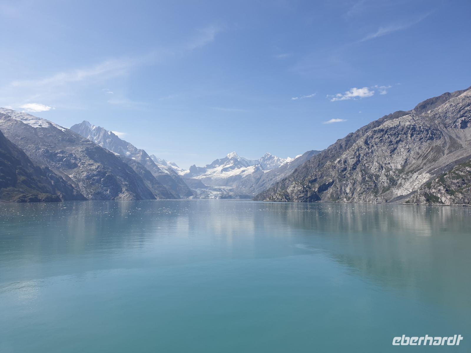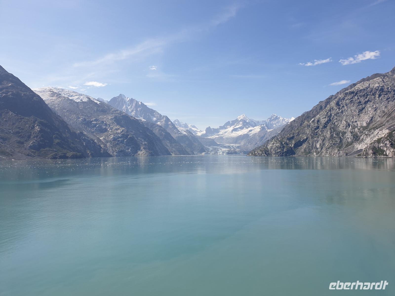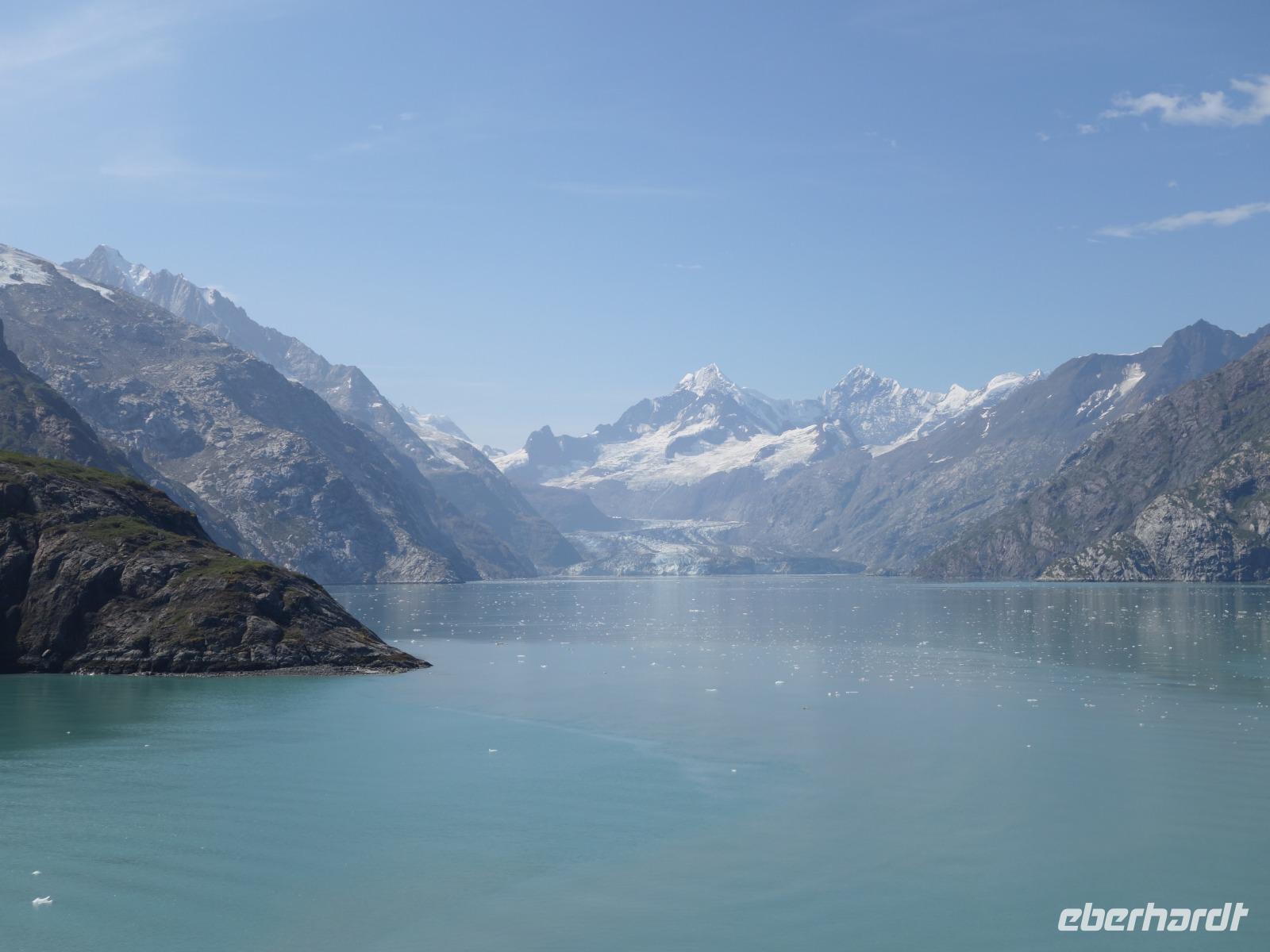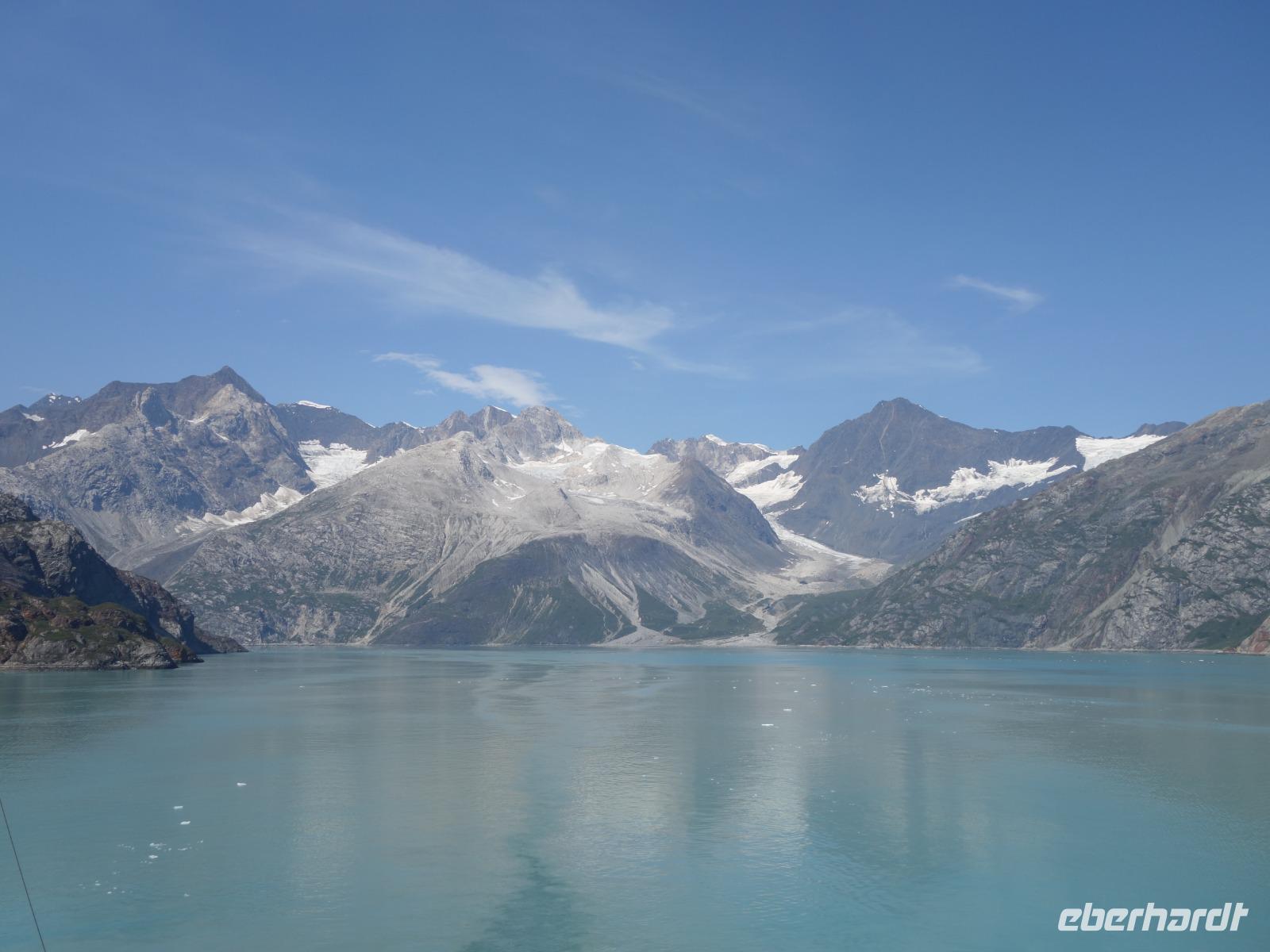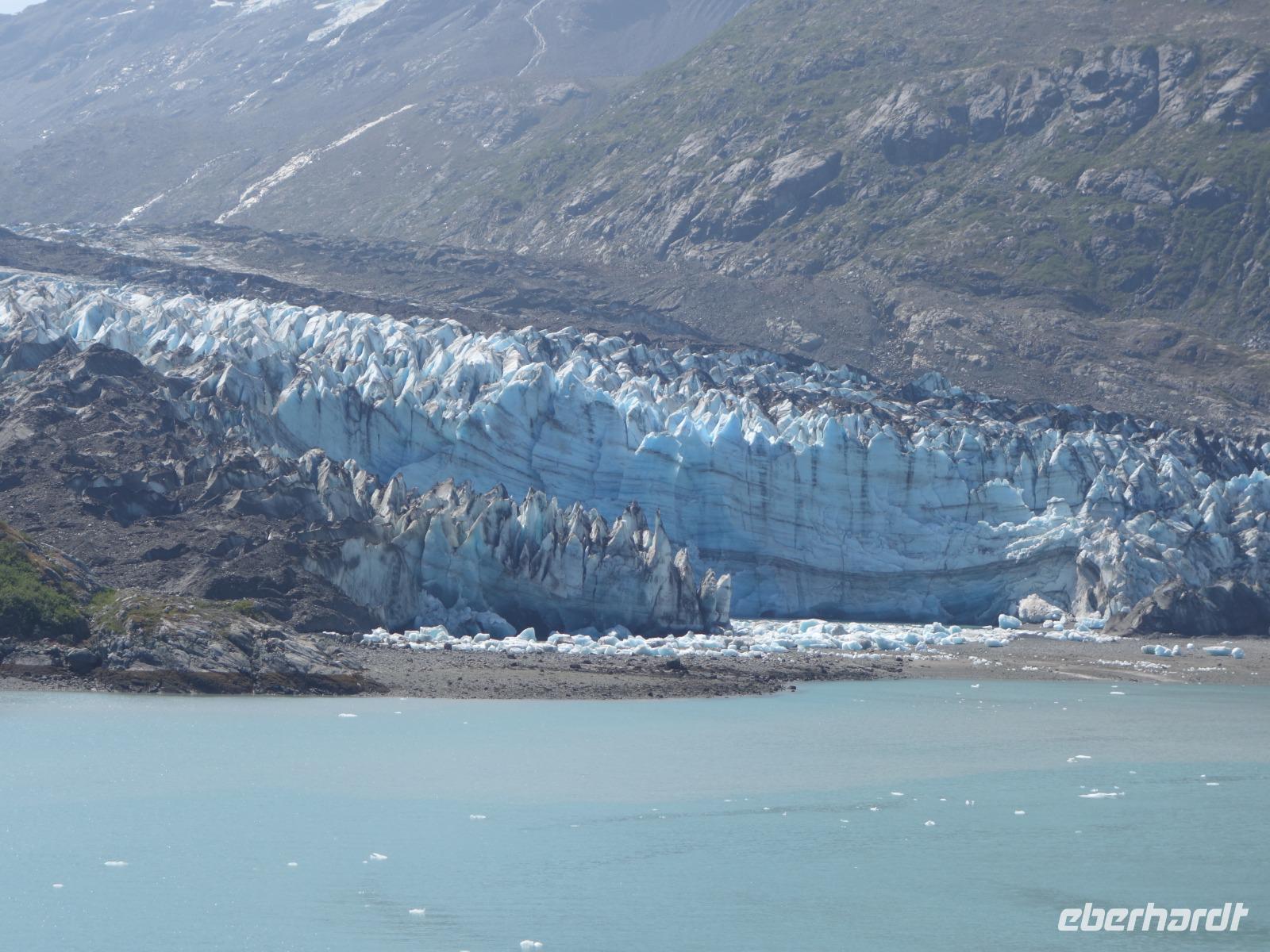 Der letzte Seetag bringt uns ganz nah an den gigantischen Hubbard Gletscher, Nordamerikas größten Gezeitengletscher. Er besteht aus 3.500km² blauen Eis und ist einer der aktivsten Gletscher in Alaska. Das können wir hautnah miterleben! Es klingt wie ein Gewitter, das aufzieht, kurz bevor der Gletscher kalbt. Der Hubbard Gletscher befindet sich zu einem Teil in Ostalaska und zum anderen Teil in Yukon, Kanada. Er wurde nach Gardiner Hubbard, dem Präsidenten der Bell Telefongesellschaft benannt. Bevor der Hubbard Gletscher das Meer erreicht, verbindet er sich im Westen mit den Valerie Gletscher. Es ist ein einmaliges Erlebnis und wieder einmal haben wir den Jackpot in Sachen Wetter gezogen. Ein herrlicher Morgen, erst liegt noch der Nebel über den „Hubbi", aber schon bald verschwindet diese und gibt die Sicht auf die wunderschönen in der Sonne glitzernde schneebedeckte Gipfel. Das auf dem Wasser treibende Eis mit dem gigantischen Gletscher im Hintergrund ist definitiv ein Bild für die Ewigkeit.