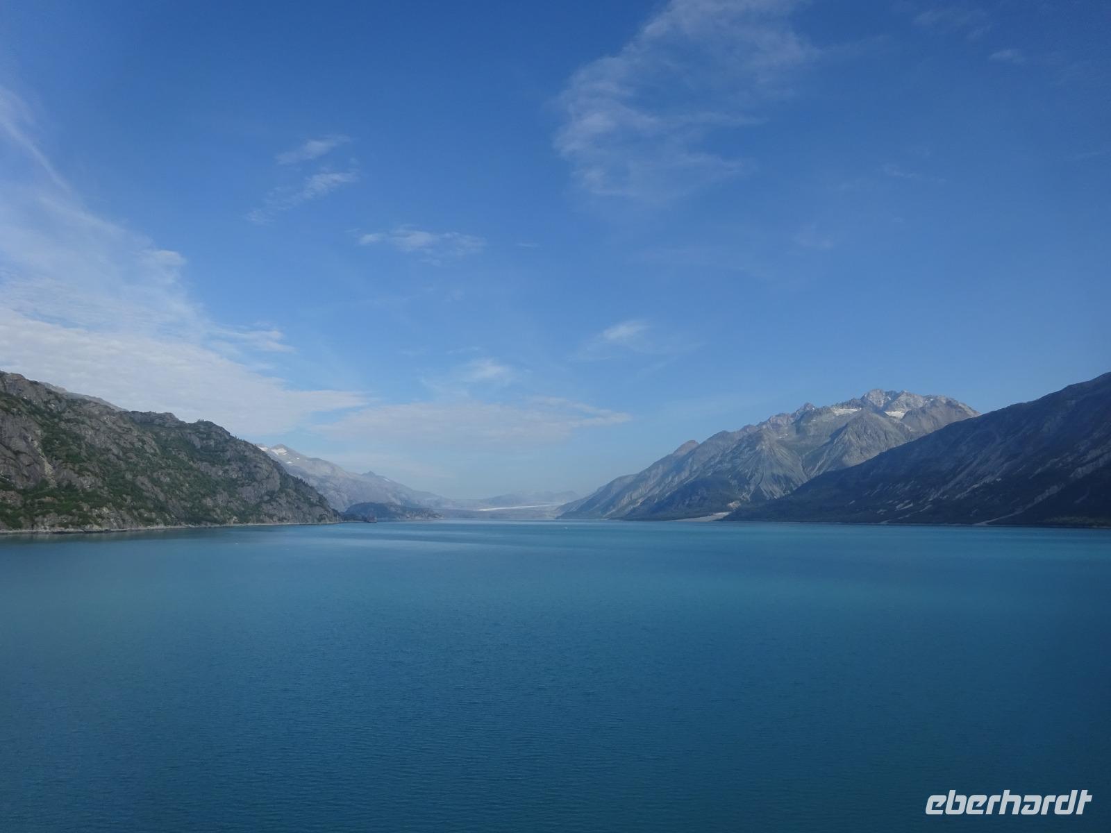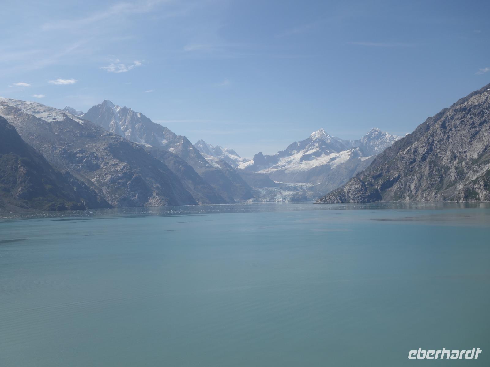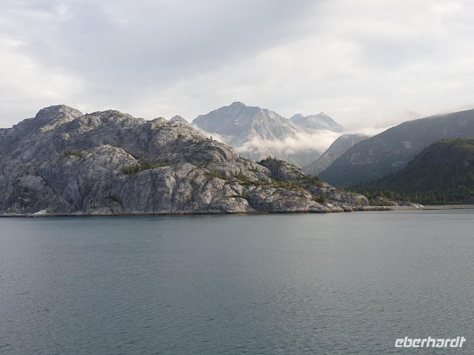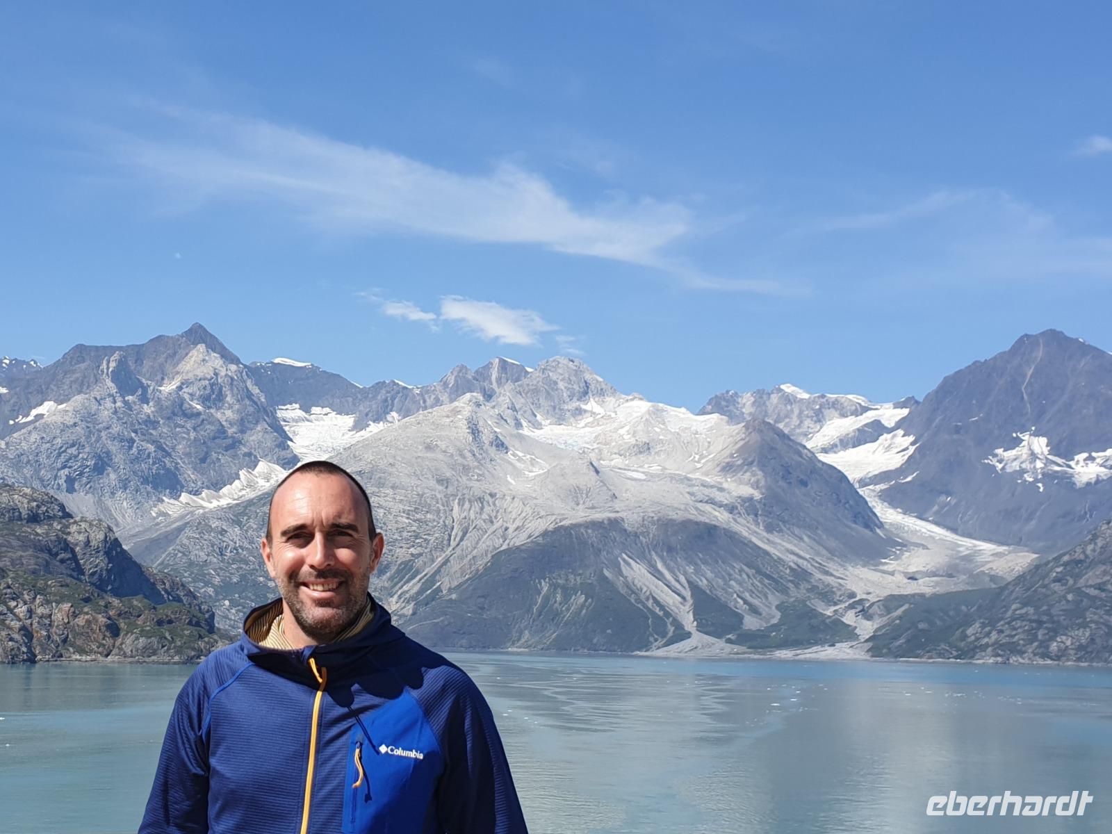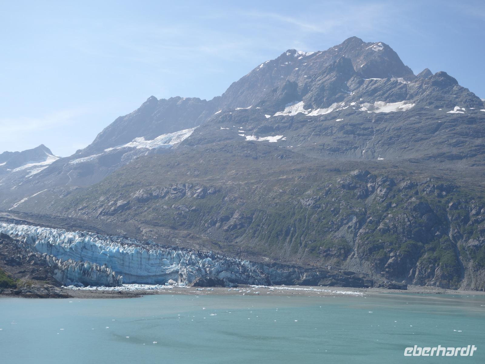 Der letzte Seetag bringt uns ganz nah an den gigantischen Hubbard Gletscher, Nordamerikas größten Gezeitengletscher. Er besteht aus 3.500km² blauen Eis und ist einer der aktivsten Gletscher in Alaska. Das können wir hautnah miterleben! Es klingt wie ein Gewitter, das aufzieht, kurz bevor der Gletscher kalbt. Der Hubbard Gletscher befindet sich zu einem Teil in Ostalaska und zum anderen Teil in Yukon, Kanada. Er wurde nach Gardiner Hubbard, dem Präsidenten der Bell Telefongesellschaft benannt. Bevor der Hubbard Gletscher das Meer erreicht, verbindet er sich im Westen mit den Valerie Gletscher. Es ist ein einmaliges Erlebnis und wieder einmal haben wir den Jackpot in Sachen Wetter gezogen. Ein herrlicher Morgen, erst liegt noch der Nebel über den „Hubbi", aber schon bald verschwindet diese und gibt die Sicht auf die wunderschönen in der Sonne glitzernde schneebedeckte Gipfel. Das auf dem Wasser treibende Eis mit dem gigantischen Gletscher im Hintergrund ist definitiv ein Bild für die Ewigkeit.