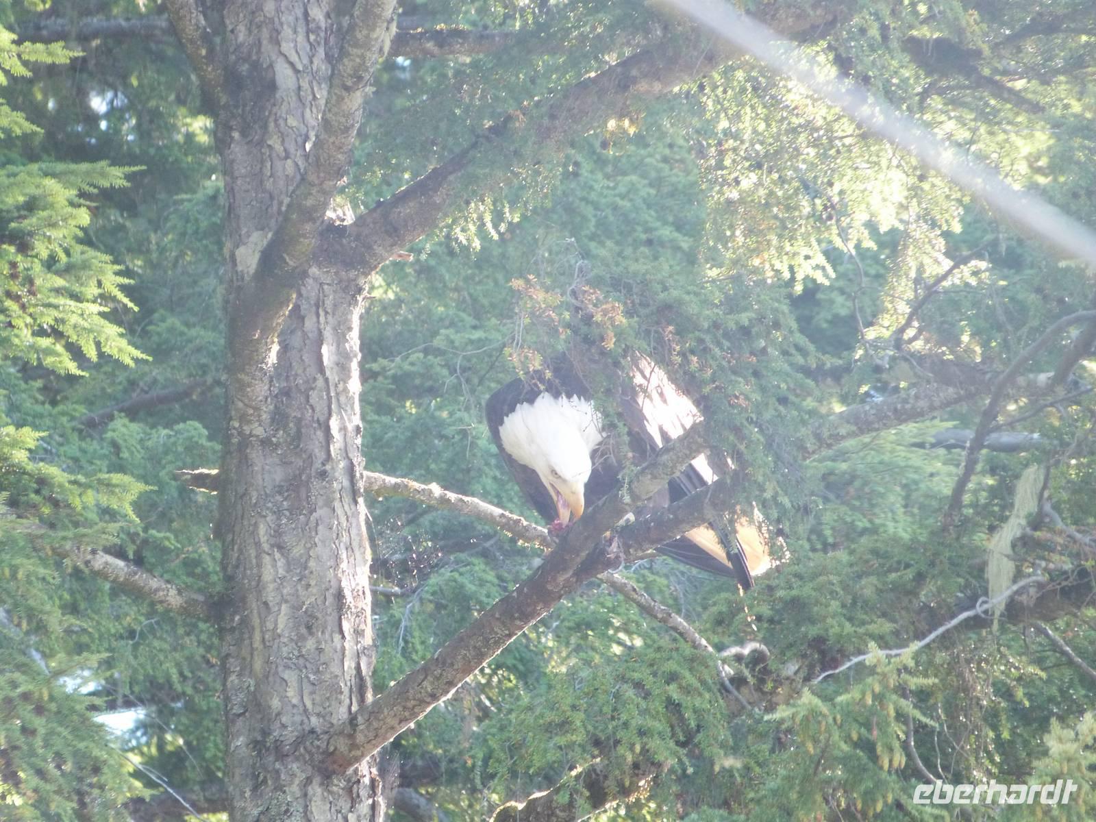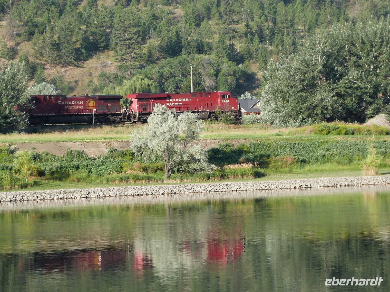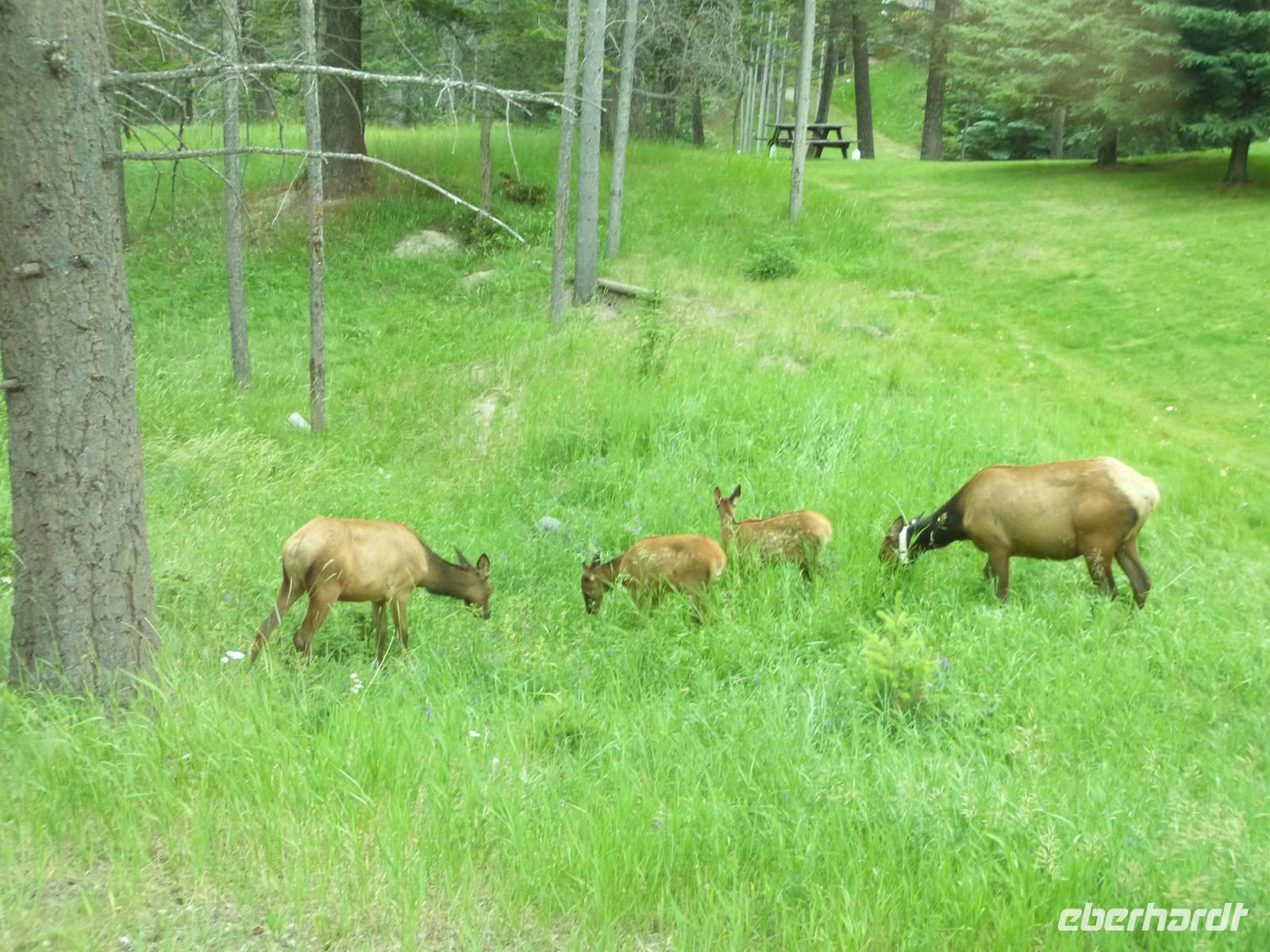 Nach dem Frühstück hieß es „Abschied nehmen von Alberta", wir verließen diesen Bundesstaat und sagten „Willkommen in British Columbia". Die kanadische Bergziege ist das Symbol British Columbiens, die wir auf den Straßenschildern die nächsten Tage immer wieder sehen. Heute hatten wir eine weite Strecke vor uns, wir fuhren nach Kamloops. Anja hatte aber ein paar schöne Stopps unterwegs für uns vorbereitet. Wir lernten die Ski Legende Mike Wiegele in Blueriver kennen und erfuhren von ihm viele interessante Tipps und Tricks für das Heli-Skiing, welches in Blueriver im Winter gefahren wird. Etwas weiter hielten wir in Clearwater und genossen bei Kristian und Monika, einer deutschen Auswanderer-Familie, einen Mittagsstopp mit hauseigenen Leckereien. Dann ging es weiter das letzte Stück bis nach Kamloops, wo wir am Nachmittag unsere Unterkunft „South Thompson Ranch" am South Thompson Fluss bezogen. Beim gemütlichen Zusammensitzen auf der Terrasse konnten wir den tiefroten Sonnenuntergang beobachten und ein Pärchen Weißkopfseeadler.