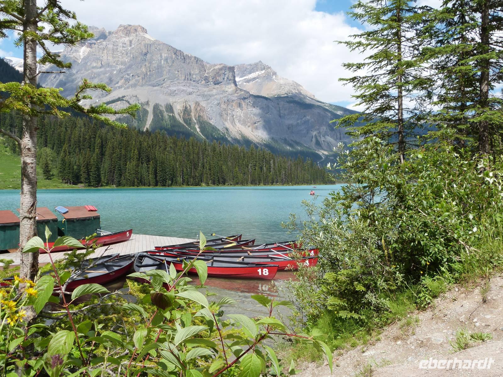 Anschließend fuhren wir zu den Takkakaw-Wasserfällen, wo unser Buschauffeur den Bus rückwärts die Straße hoch lenkte. Das war ganz schön spannend. Bei den Wasserfällen machten wir ein kleines Picknick und hatten einen herrlichen Blick auf die Wasserfälle und die Umgebung. Eine herrrliche Ruhe umgab uns. Gut gestärkt fuhren wir dann zum Emerald See, wo wir eine fantastische Blaufärbung des Wassers vor fanden. Auf einem Gruppenbild hielten wir die wunderbare Landschaft für uns fest.
