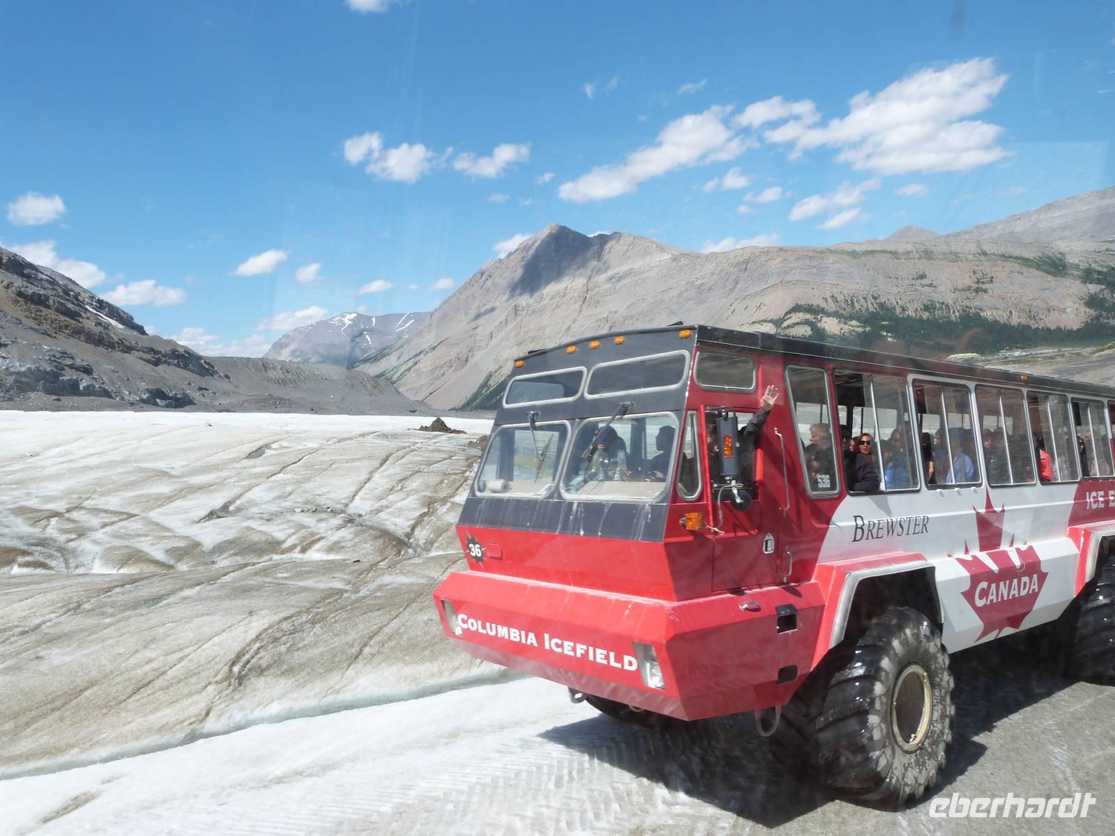 Heute führte uns unsere Reise entlang des berühmten und wunderschönen „Icefields Parkway". Nach dem Frühstück fuhren wir vorbei an Banff, dem Mount Rundle und dem Tunnelberg zum Lake Louise. Unterwegs am Straßenrand sahen wir einen Grizzly Bären. Dort angekommen, zeigte uns Anja das Châteu Lake Louise von innen und anschließend hatten wir etwas Freizeit, um entlang des Sees zu Laufen und die herrliche Landschaft zu genießen. Leider verlassen wir heute den Banff Nationalpark und fahren zum Icefields Parkway bei traumhaftem Bilderbuchwetter. Nach mehreren Fotostopps, wie am Krähenfuss Gletscher, Bowsee und Peytolake erreichten wir am Mittag den Athabasca Icefield. Am Athabasca Gletscher angekommen, unternahmen wir zusammen mit Anja eine Schneemobil-Auffahrt zum Gletscher und versuchten unser Glück jünger zu werden. Man sagt nämlich, wenn man Gletscherwasser trinkt, dass sich der menschliche Körper einer Verjüngung von ca. 5 Jahre unterzieht. Natürlich nahmen wir alle einen großen Schluck! Dann fuhren wir Richtung Jaspar. Eine Kaffeepause legen wir am Sunwapta Falls Resort ein, dort beobachteten wir einen Schwarzbären. Wir stoppten noch einmal an den Athabasca Wasserfällen.
