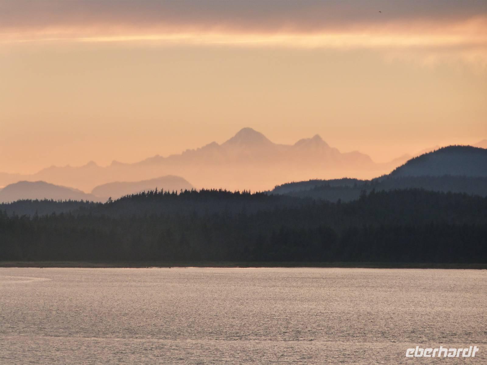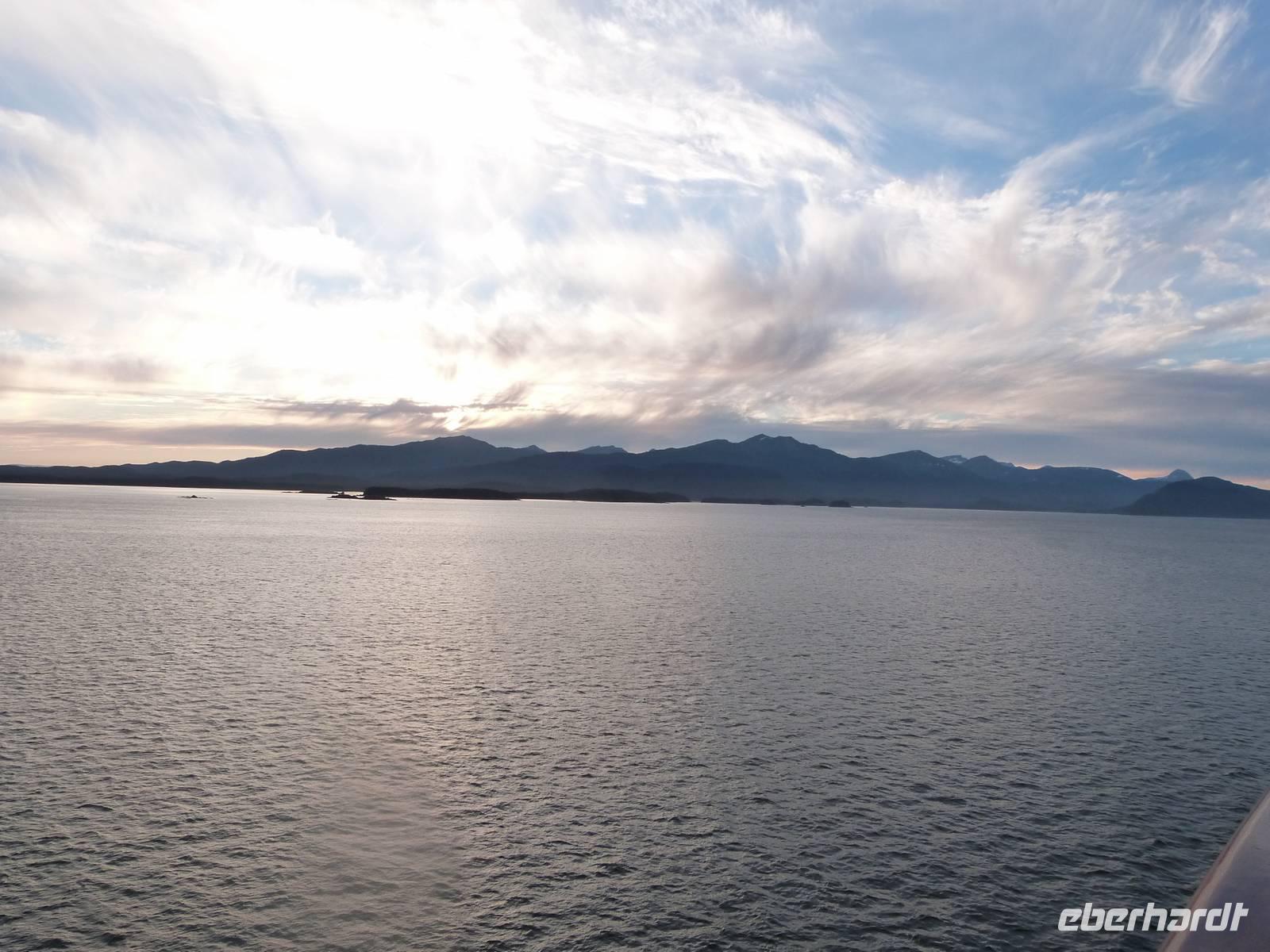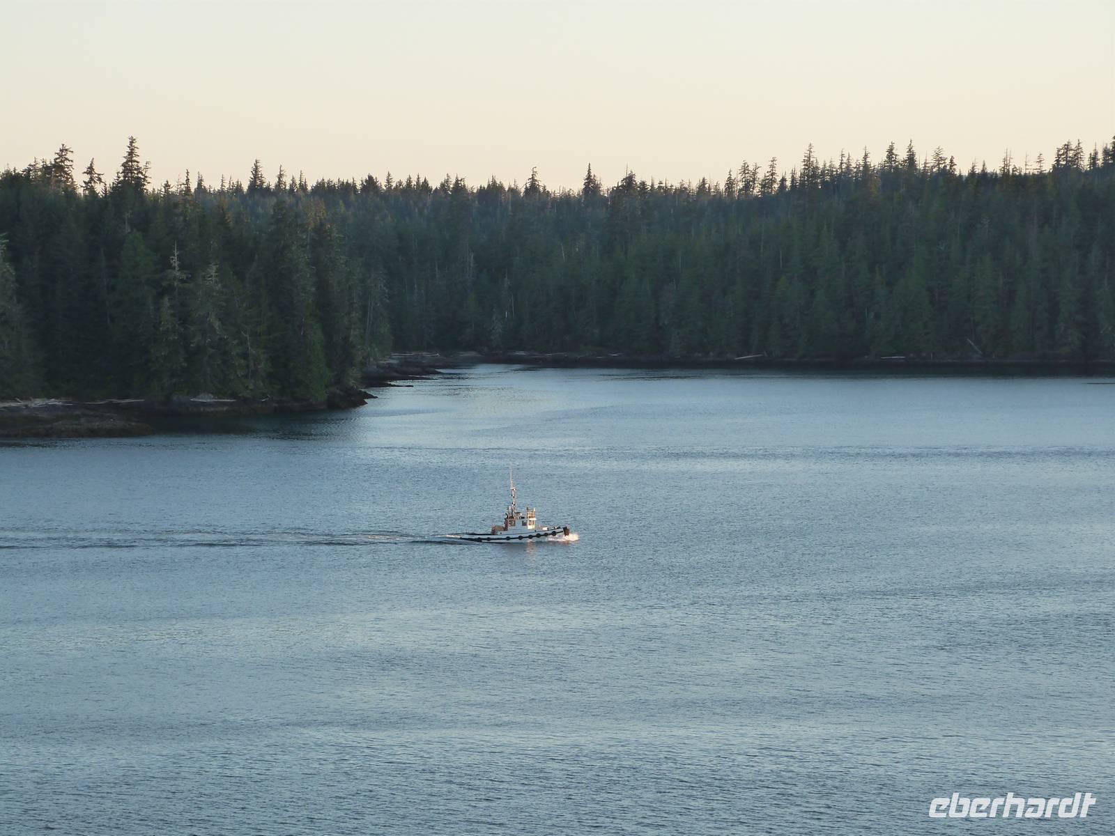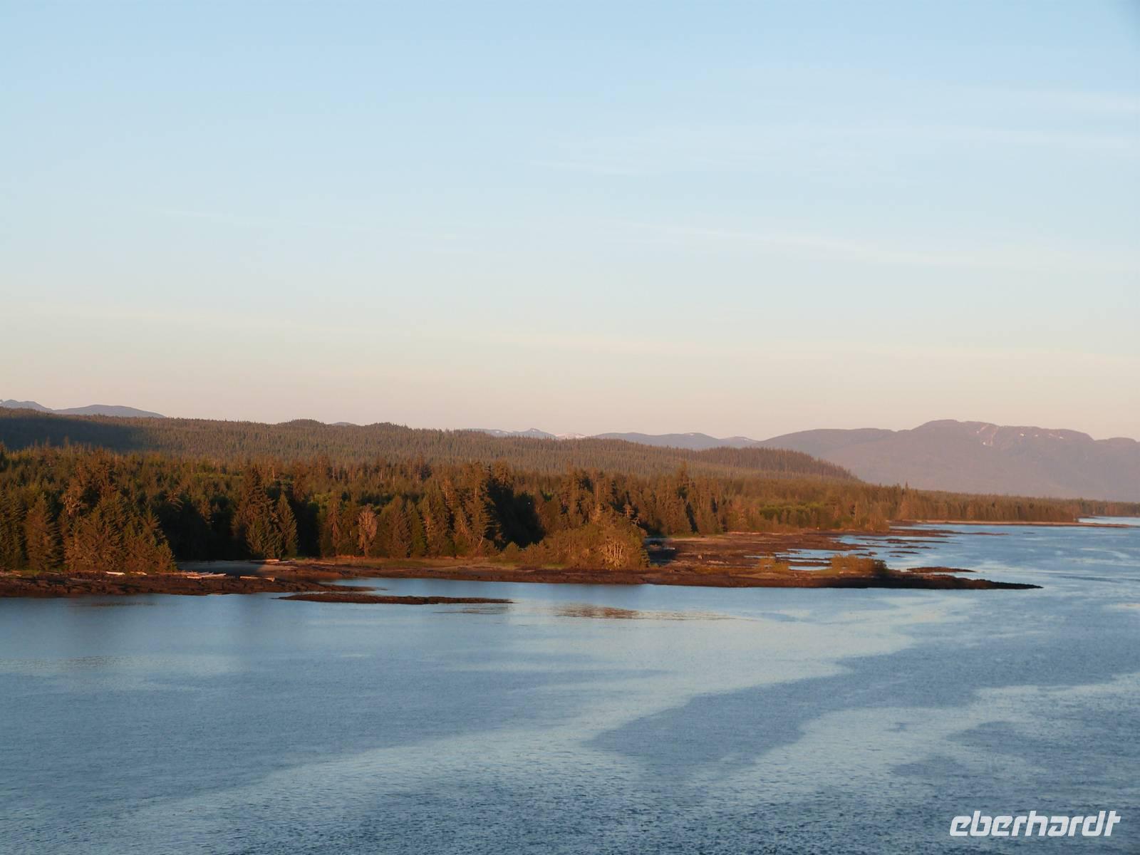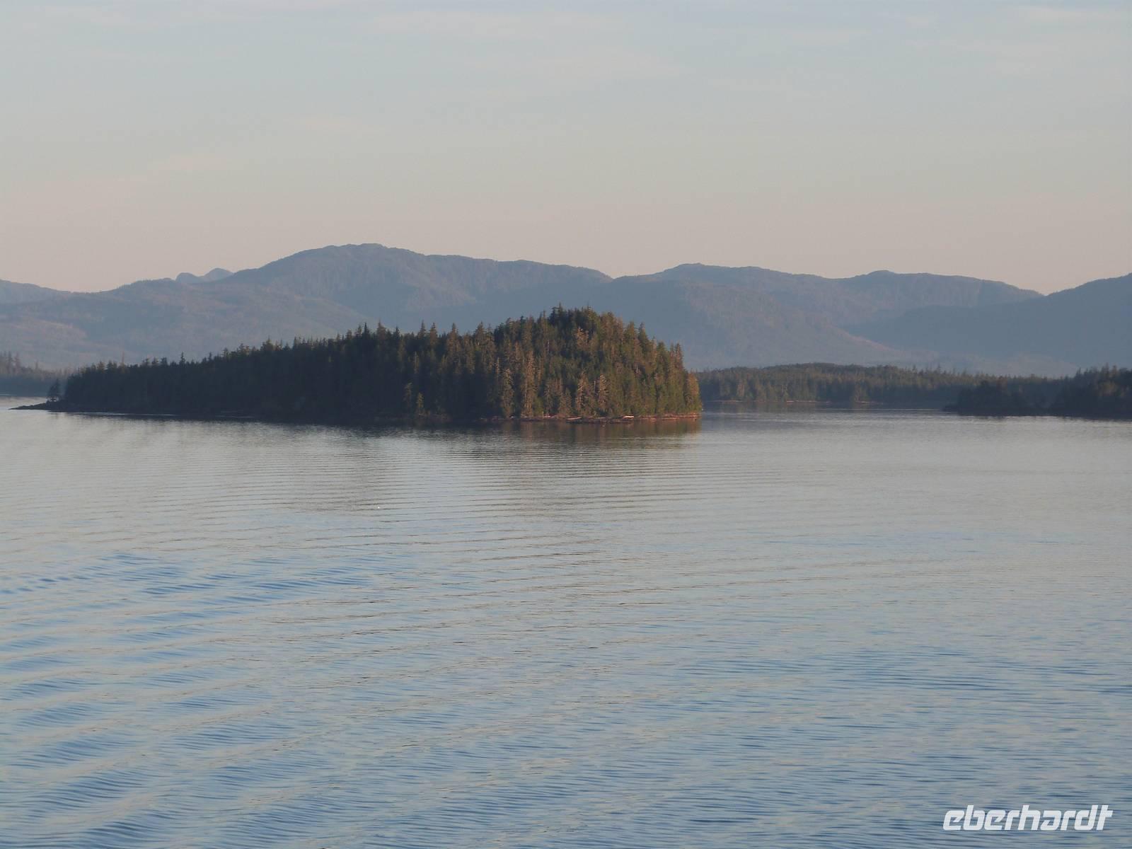 Heute fuhren wir mit dem Schiff durch die Inside Passage, der Streifen zwischen kanadischem Festland und den kleinen vor gelagerten Pazifikinseln. Ein leichter Wind wehte uns um die Nase.George Vancouver und James Cook waren die ersten Briten, die umfangreiche kartografische Arbeiten hier durchführten.