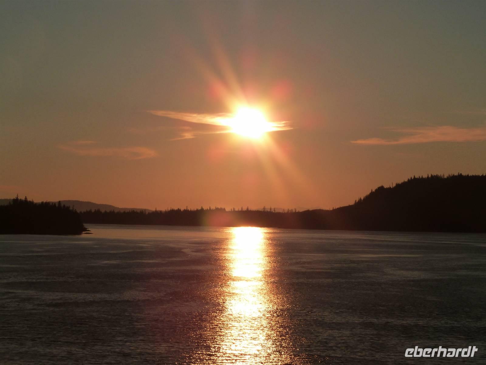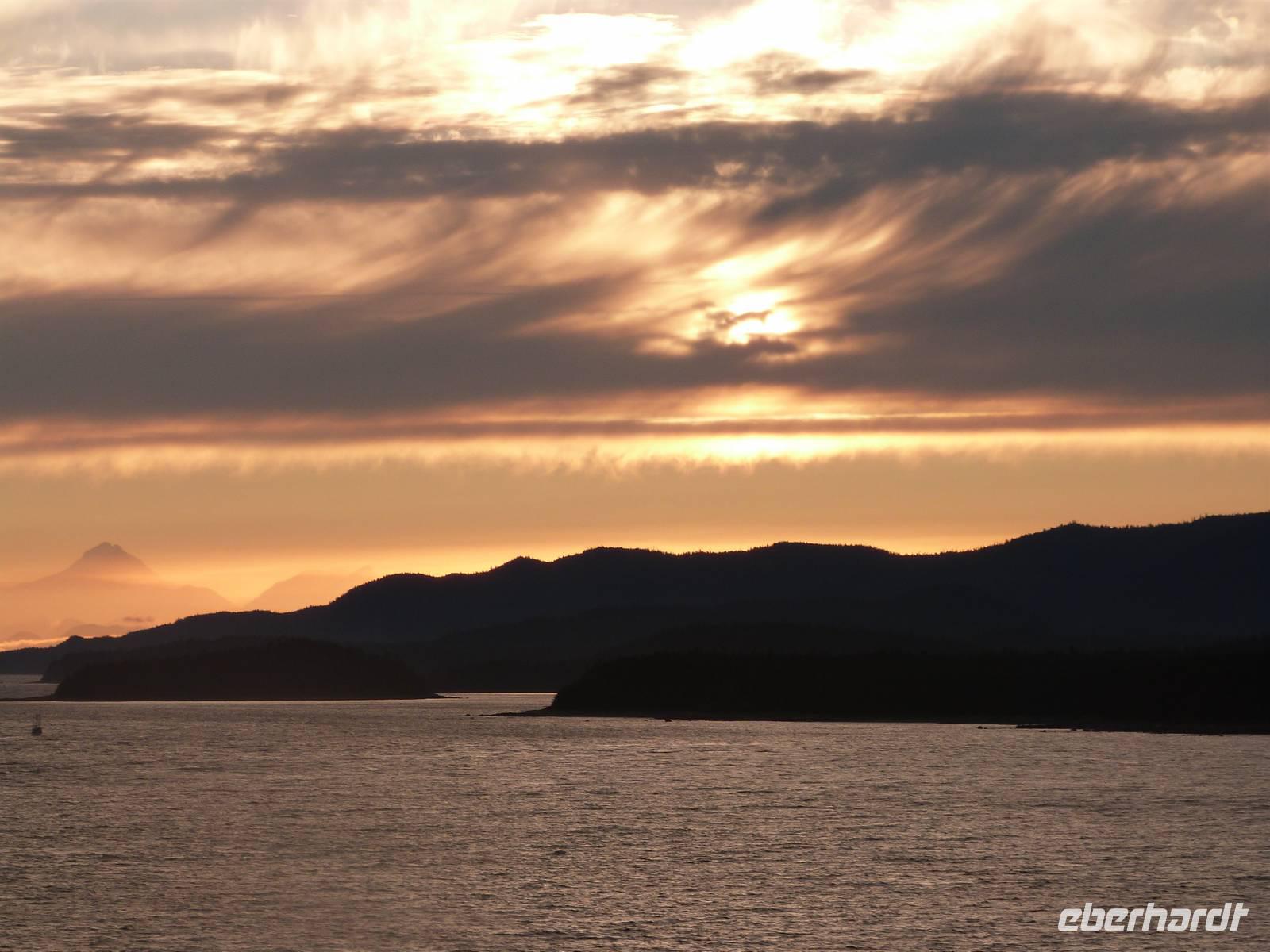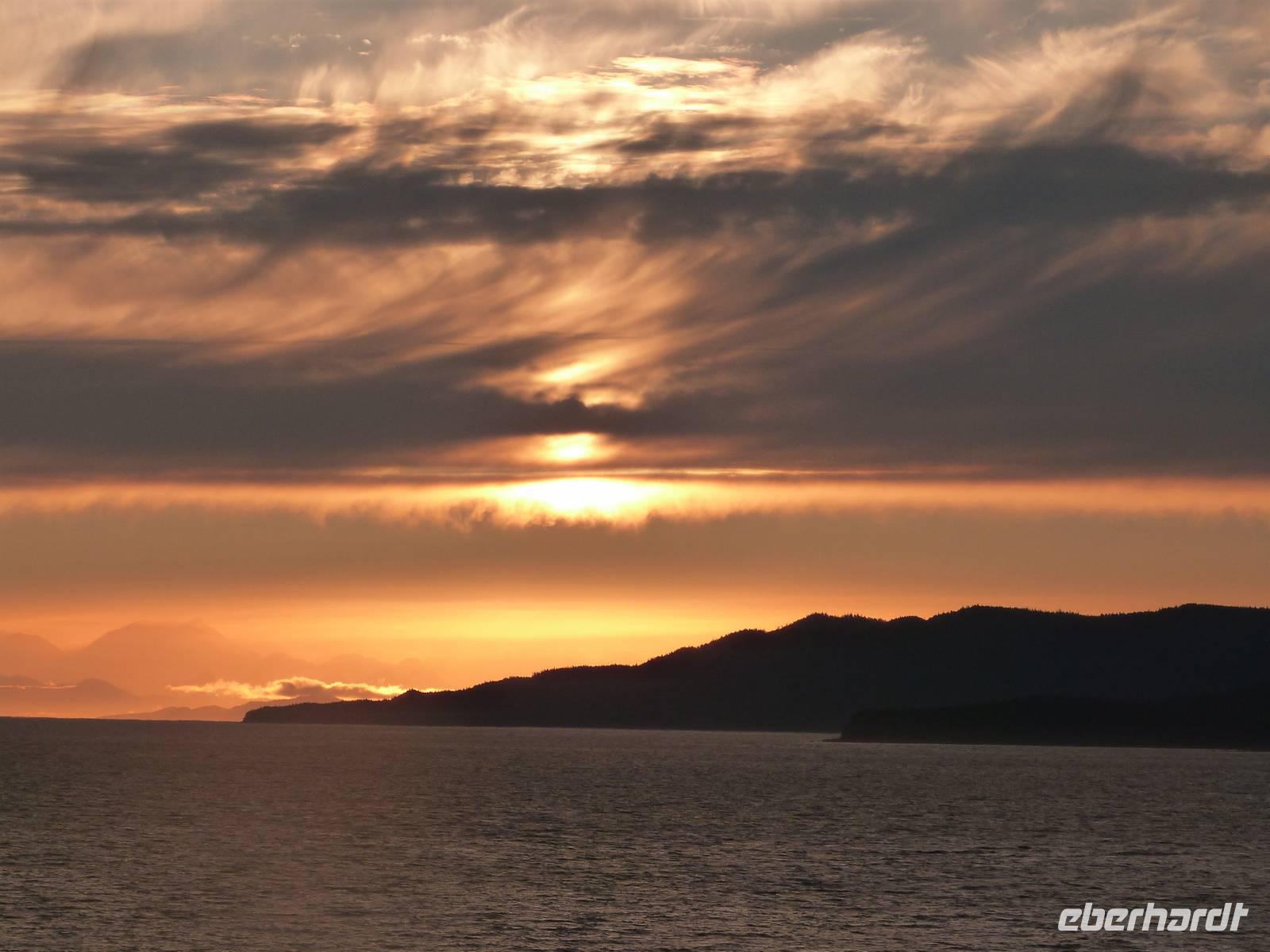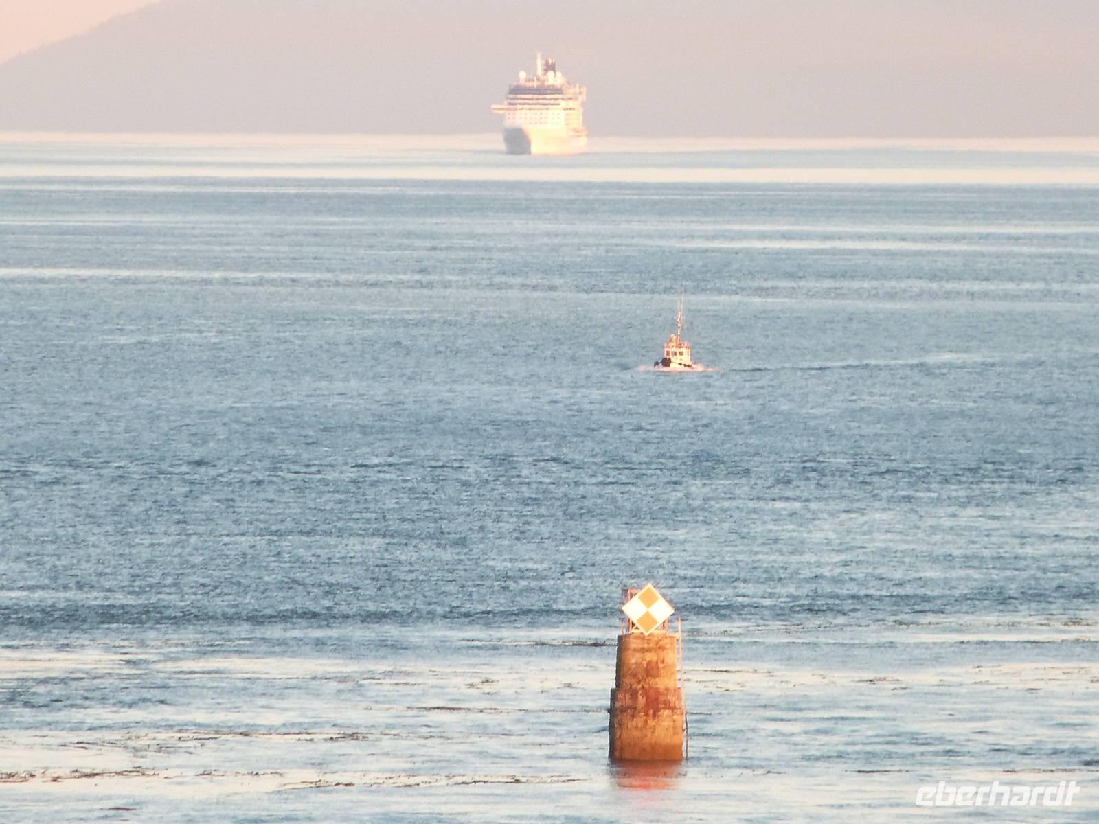Heute fuhren wir mit dem Schiff durch die Inside Passage, der Streifen zwischen kanadischem Festland und den kleinen vor gelagerten Pazifikinseln. Ein leichter Wind wehte uns um die Nase.George Vancouver und James Cook waren die ersten Briten, die umfangreiche kartografische Arbeiten hier durchführten.