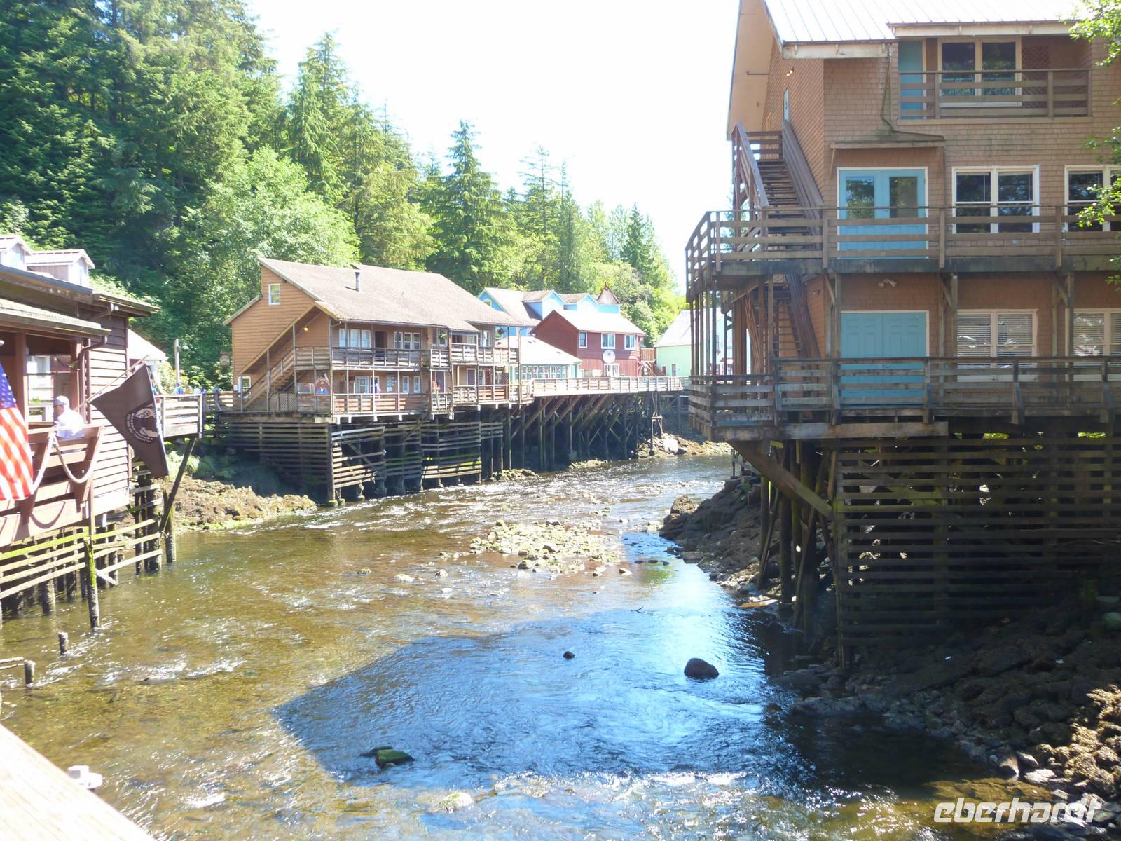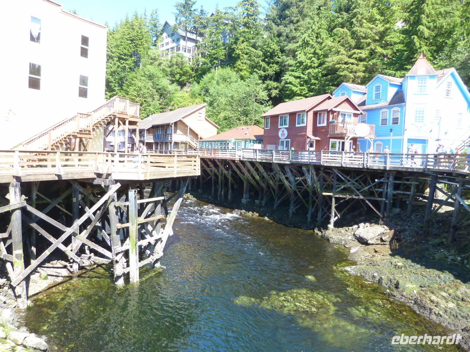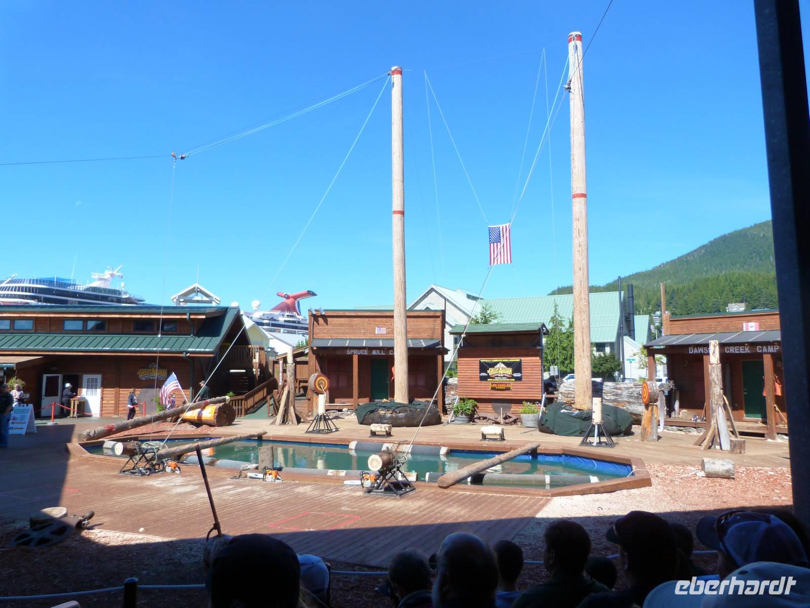 Nach dem gemütlichen Frühstück gingen wir von Bord in Ketchikan. Er ist der erste Ort, den ein Besucher sieht, der Alaska mit dem Schiff erreicht. Der florierende Fischerhafen, umrahmt von tiefgrünen Bergen lud zum Verweilen ein. Gemeinsam besuchten wir die Great Alaskan Lumberjackshow. Hier traten Holzfäller aus Kanada und Alaska gegeneinander an und bezwangen bestimmte Disziplinen im Umgang mit Holz. Diese Show fand in einer überdachten Tribüne statt. Die heutige Tribüne befindet sich an dem Platz des alten Sägewerks von 1898, welches zu der Zeit das größte Fichtenholzsägewerk der Welt war. Hier wurde Holz für den Flugzeugbau sowie Bauholz für den Goldrausch hergestellt. Anschließend gingen wir gemeinsam auf Erkundungstour durch die kleine Stadt. Die Creek Street mit kleinen Geschäften und das historische Zentrum Ketchikans lud zum Verweilen ein. Ein Spaziergang durch das kleine Städtchen war wirklich ein Muss an dem herrlichen Sonnentag. Bei unserem abendlichen Treffen zur Vorbereitung des nächsten Tages stand heute eine Besonderheit auf dem Plan,denn es gab das erste Mal Trockenfisch für die Gruppe zum probieren.