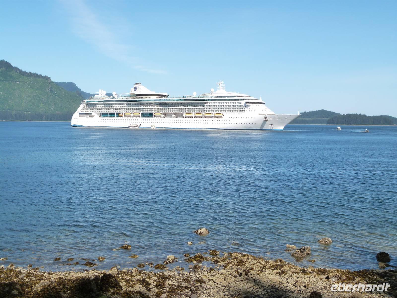 Westlich von Juneau liegt Icy Strait Point, der einzige Naturhafen Alaskas, an der Einfahrt zur Glacier Bay. Das Gebiet um die Glacier Bay wurde 1980 zum Nationalpark ernannt und zum UNESCO Welterbe erklärt. Am Vormittag unternahmen wir eine kleine Wanderung zum Dort Hoonah, wo die Tlingit Indianer wohnen. Dort schauten wir uns ein wenig um und entdeckten dabei einen Weißkopfseeadler im Baum. Am Nachmittag fuhren wir mit einer kleinen Waldbahn durch den Regenwald und an der Küste entlang und sahen den Fischern beim Fischen zu. Hier in dieser Region leben die Tlingit - ein Indianervolk Nordamerikas. Sie sprechen die Na-Dené-Sprache. Bei einer interessanten Indianer-Tanzshow wurden uns viele Weisheiten und Bräuche dieses Volkes näher gebracht. „Leinen los" und es ging weiter in den Norden Alaskas. Ein schöner Tag neigt sich dem Ende.
