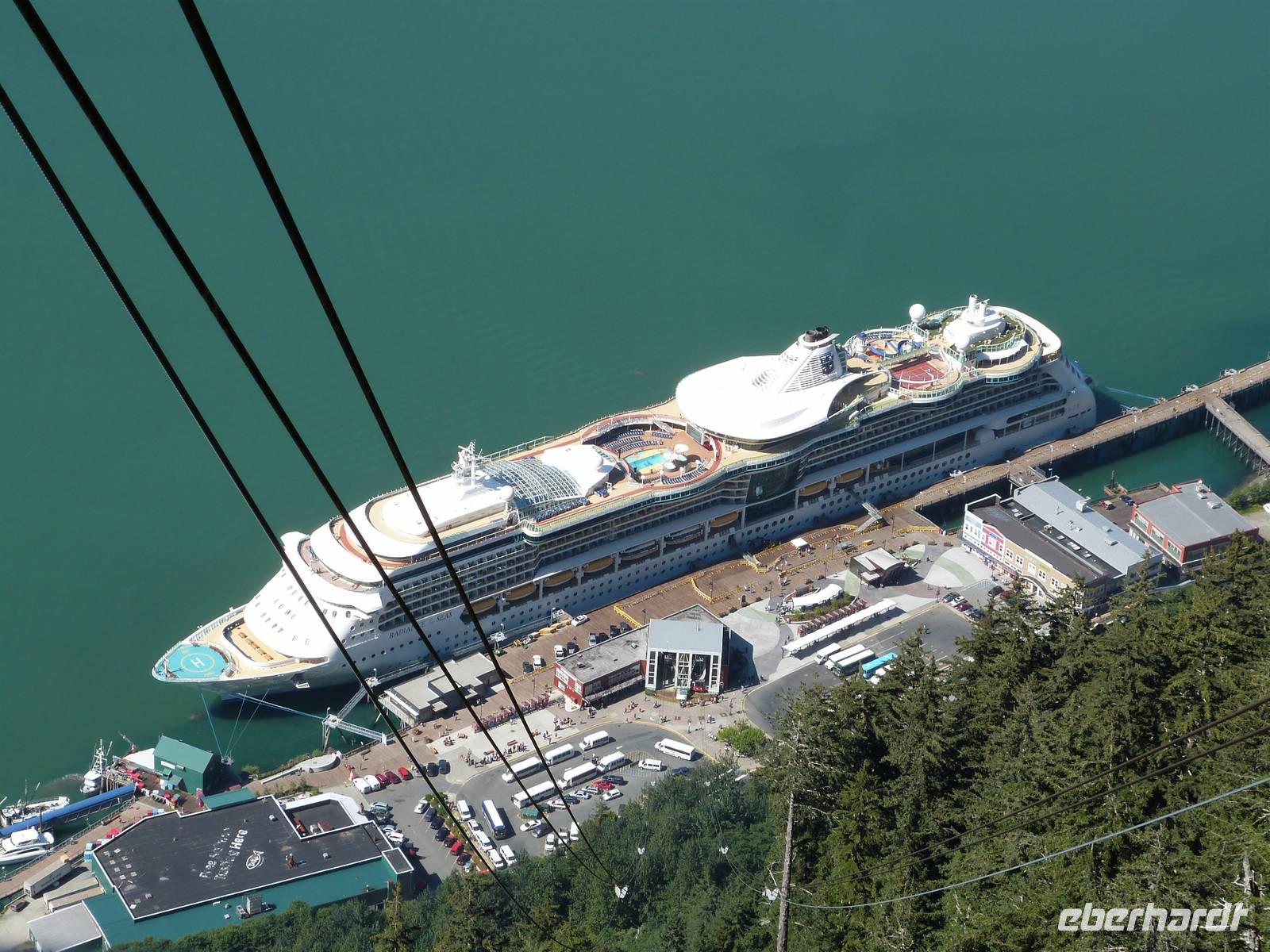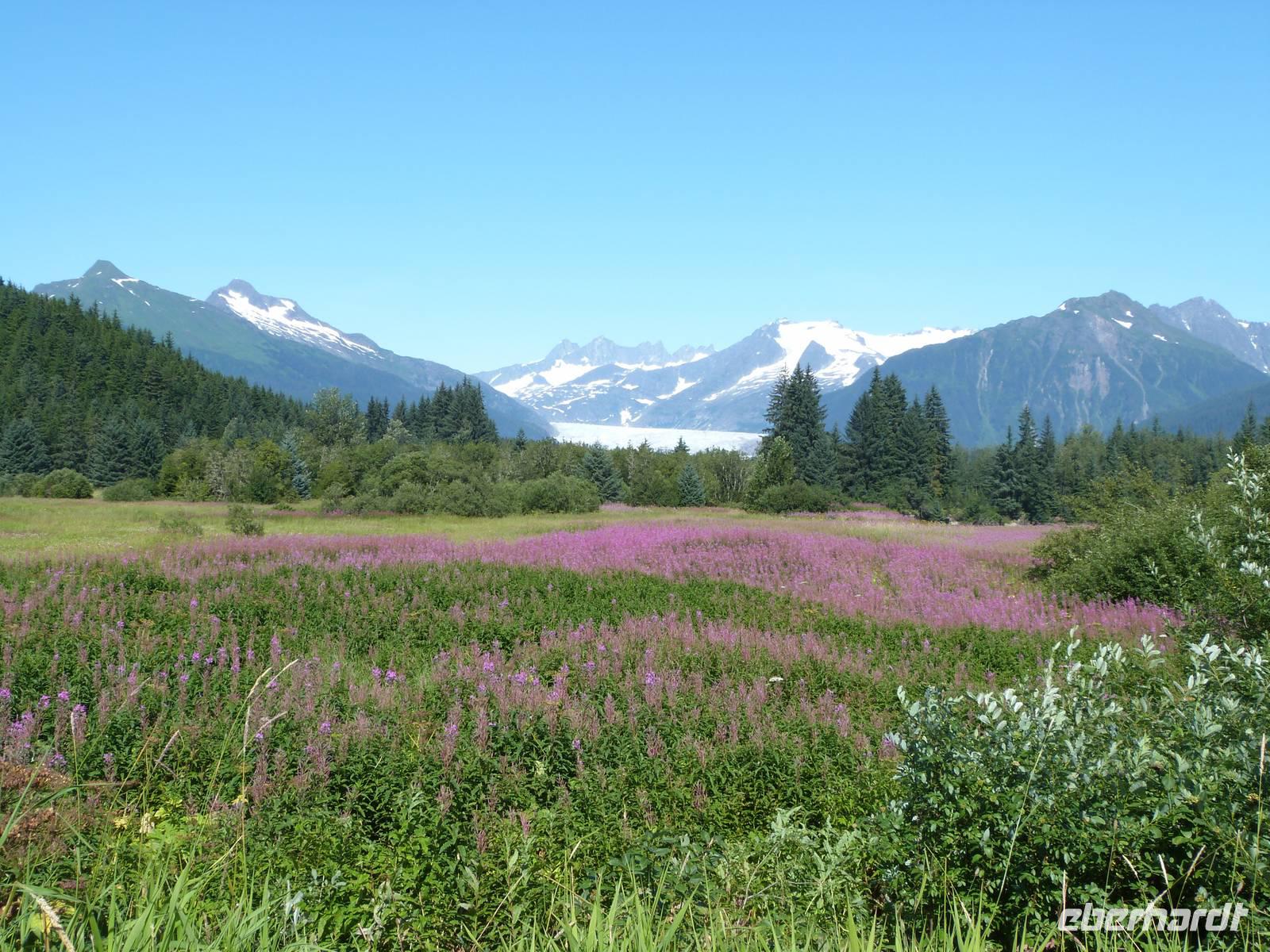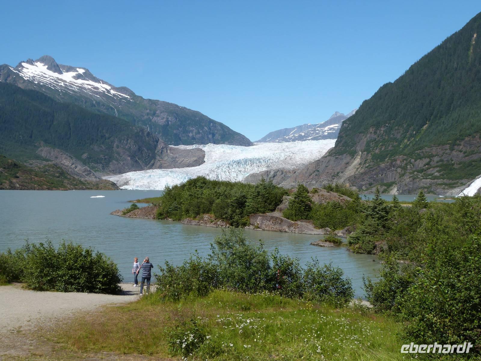 Das unterhalb des Mount Juneau und Mount Roberts liegende Juneau ist Alaskas Hauptstadt ohne Straßenanschluss. Der Goldfund von Joe Juneau und Dick Harris versetzte manchen in den Goldrausch. Exklusiv erwartete uns heute ein ganz besonderer Ausflug in die Umgebung von Juneau.Am Vormittag fuhren wir mit der Mount Roberts Tramway auf einen der Hausberge Juneaus hinauf und hatten einen herrlichen Blick über die Stadt. Die Wanderwege dort oben luden zum wandern ein, so dass wir eine kleinde Wanderung bei bestem Wetter auch machten. Am Nachmittag besuchten wir die Lachsaufzuchtstation, wo wir viel Wissenswertes über die verschiedenen Lachssorten Alaskas erfuhren. Der Königslachs (Chinook), der Rotlachs (Sockeye), der Pink-Salmon (Buckellachs) und der Silberlachs (Coho) sind die bedeutendsten Arten, die die Einwohner zum Verzehr und die Fischer zum Verkauf nutzen.