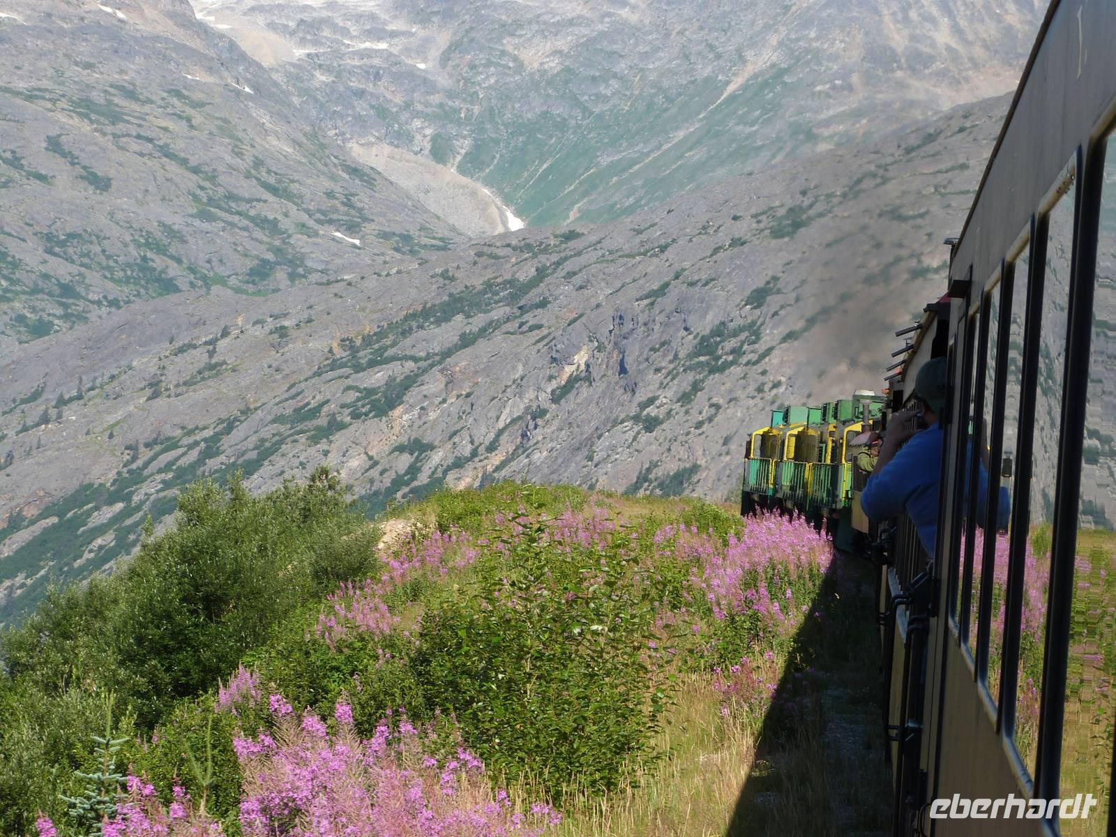 Am Morgen läuft unser Kreuzfahrtschiff „Radiance oft the Seas" in Skagway ein.Die Stadt wurde durch den Klondike Goldfund berühmt und lebt bis heute vom Goldabbau und Tourismus. Heute erlebten wir einen Ausflug für Zug-und Bahnliebhaber. Historische Eisenbahn-Romantik würde man auch sagen. Mit einer grandiosen Panoramafahrt fuhren wir von Skagway zum White-Pass hinaus und passierten damit wieder ein kleines Stück Kanadas. Diese Strecke liefen damals die Goldgräber um in das Klondike Goldgebiet zu kommen. Leider verloren viele Menschen und Tiere im 19.Jahrhundert ihr Leben bei dem steilen Anstieg in das Goldgräbergebiet. Unsere Fahrt führte uns über Brücken, durch Tunnel und tiefe Schluchten bis empor zum White-Pass. Traumhafte Landschaften zogen an uns vorbei.