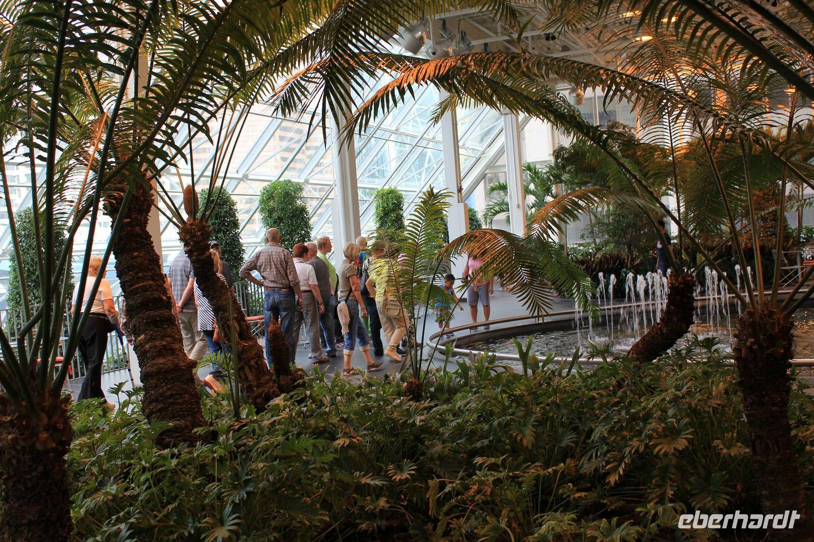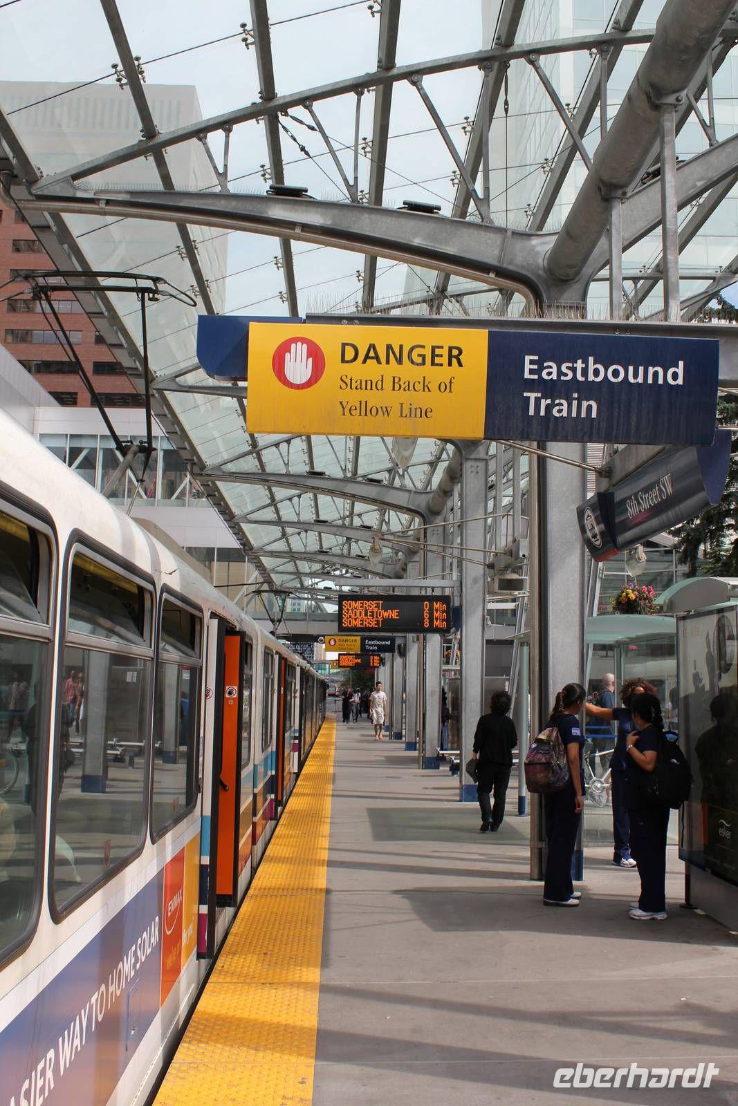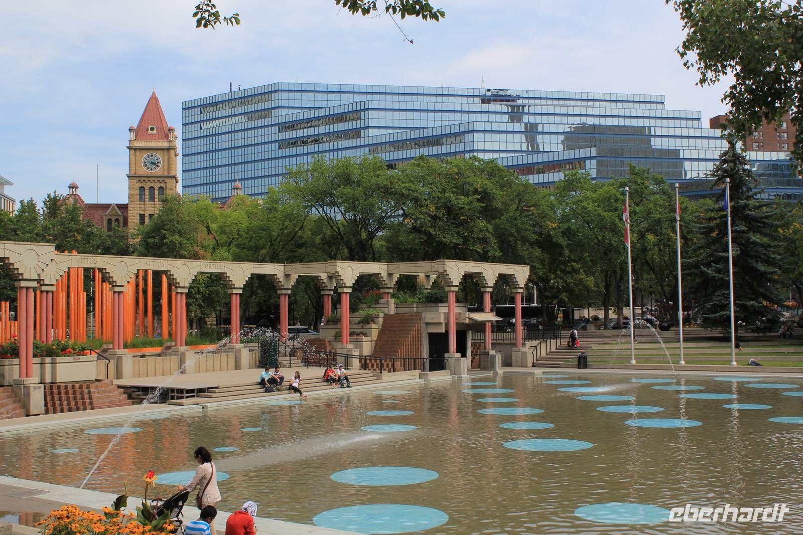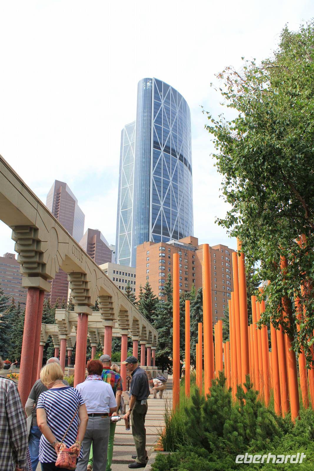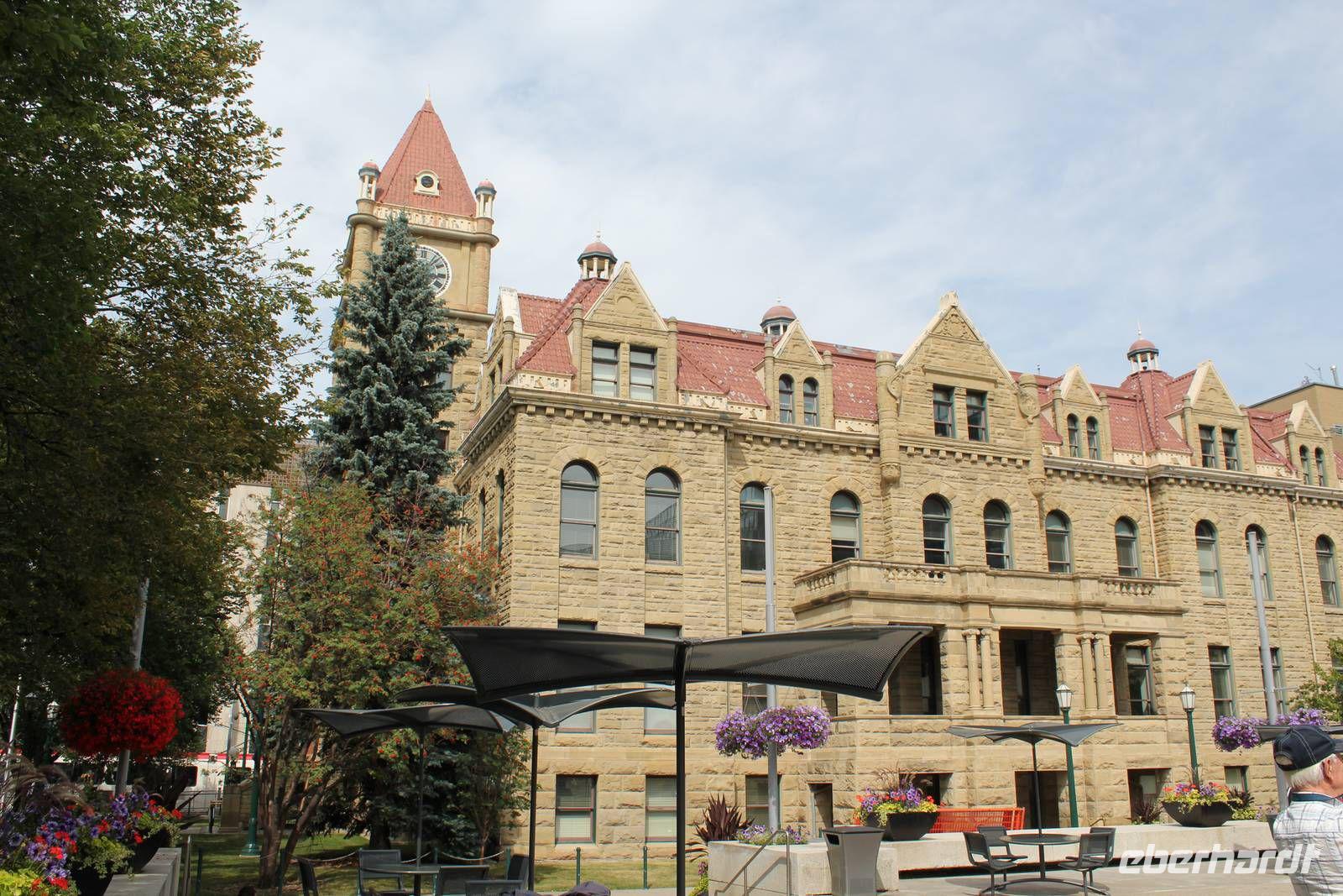 Obwohl unsere innere Uhr inzwischen sagt, dass es Schlafenszeit ist, weigern wir uns strikt gegen diese Anweisung und begeben uns stattdessen auf eine erste Erkundungstour durch die 1,07 Mio. Einwohner Stadt. Mit der Straßenbahn geht es zum wenige Haltestellen entfernten Olympic Plaza, wo sich das wunderschöne alte, aus Sandstein gebaute, sowie das moderne, neue Rathaus (1986) befinden. Auf dem extra für die Olympischen Spiele angelegten Platz, der heute das kulturelle Herz der Stadt darstellt, wurden im Winter 1988 allabendlich die Medaillen verliehen. Heutzutage finden hier im Sommer Open-Air-Veranstaltungen statt. Hoch über dem Platz ragt der 191 m hohe Calgary Tower auf - das Wahrzeichen der Stadt und damaliger Träger der olympischen Fackel. Wir spazieren gemütlich durch die Fußgängerpassage Stephen Avenue, die gesäumt ist von bunten, liebevoll angelegten Blumenarrangements, kleinen Cafés und hübschen Geschäften. Zum Abschluss unserer Spaziertour (die Augen und Glieder kämpfen konstant tapfer gegen die Müdigkeit) werfen wir noch einen Blick auf die Devonian Gardens, einer künstlichen tropischen Gartenanlage mit Teichen und Palmen in der obersten Etage eines Einkaufszentrums.
