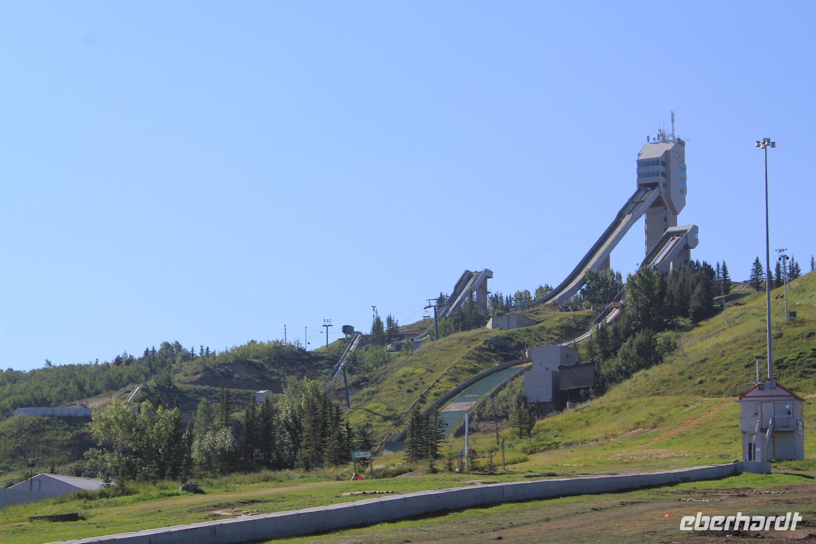 In den heutigen Tag starten wir mit einer Rundfahrt durch die „Ölhauptstadt" Kanadas - Calgary. Alberta, die 4.-größte und eine der wohlhabendsten Provinzen Kanadas, ist nicht nur die Rinderzucht- sondern auch die Ölprovinz des Landes. Vorbei geht es zuerst an der Gründungsstätte, dem Fort Calgary, wo 1875 die erste Polizeistation der „Mounties" den Grundstein Calgarys legte. Das wir uns in der „Stadt der Cowboys" befinden, sehen wir deutlich beim Passieren des größten Rodeo-Geländes des Landes, wo jährlich im Juli die „Stampete" stattfindet, ein riesiges Volksspektakel, bei dem Rodeo im Zentrum des Trubels steht! Unser nächstes Ziel ist der gewaltige Calgary Tower, von dessen Aussichtsplattform wir nicht nur einen fantastischen Blick auf die ganze Stadt werfen können, sondern sich auch das höchste Gebäude Albertas, das „Bow Building", herrlich einfangen lässt. Auf der gläsernen Plattform, die erst 2005 angebaut wurde, blickt man fast 190 m in die Tiefe! Bei dem tollen Wetter sehen wir in der Ferne sogar die angedeuteten Gipfel der Rocky Mountains - und genau da wollen wir nun endlich hin! Doch bevor es soweit ist, besuchen wir noch den etwas außerhalb gelegenen „COP" - den Canada Olympic Park. Hier befinden sich die Sprungschanzen, und die Bobbahn der Spiele von 1988 und auch die Fahnen aller Teilnehmerländer wehen im warmen Wind (nur die DDR-Flagge fehlt, wir wollen diese aber umgehend per Post hier her schicken).