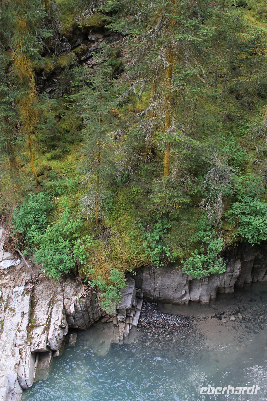Am Nachmittag wollen wir einen Spaziergang entlang der Johnson Schlucht unternehmen. Der türkisfarbene Fluss schlängelt sich durch die senkrecht abfallenden Felswände und moosbewachsene Ebenen zieren die umliegende Landschaft. Als krönender Abschluss dieses erlebnisreichen Tages erblicken wir auf unserem Rückweg tatsächlich unseren 1. kleinen Schwarzbären, der sich zwar desinteressiert hinten einigen Büschen versteckt, aber uns dennoch mit seiner Erscheinung unsere Nasen an der Busfensterscheibe platt drücken lässt.