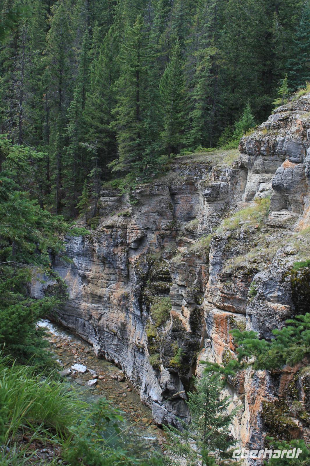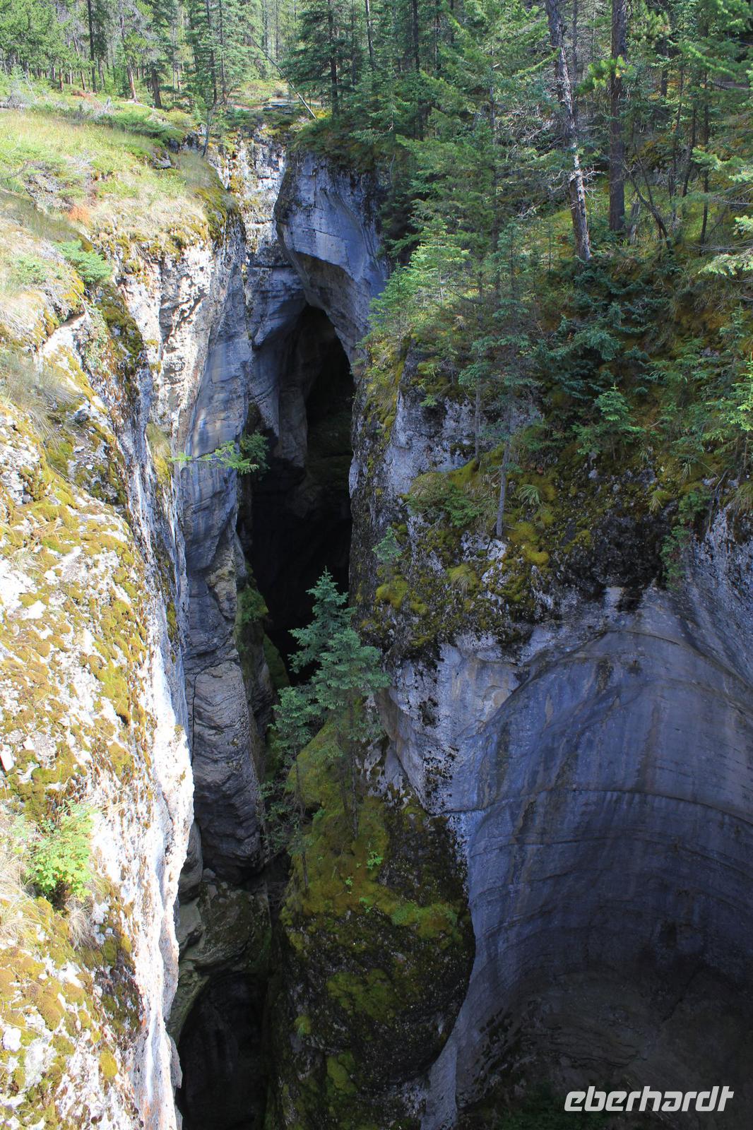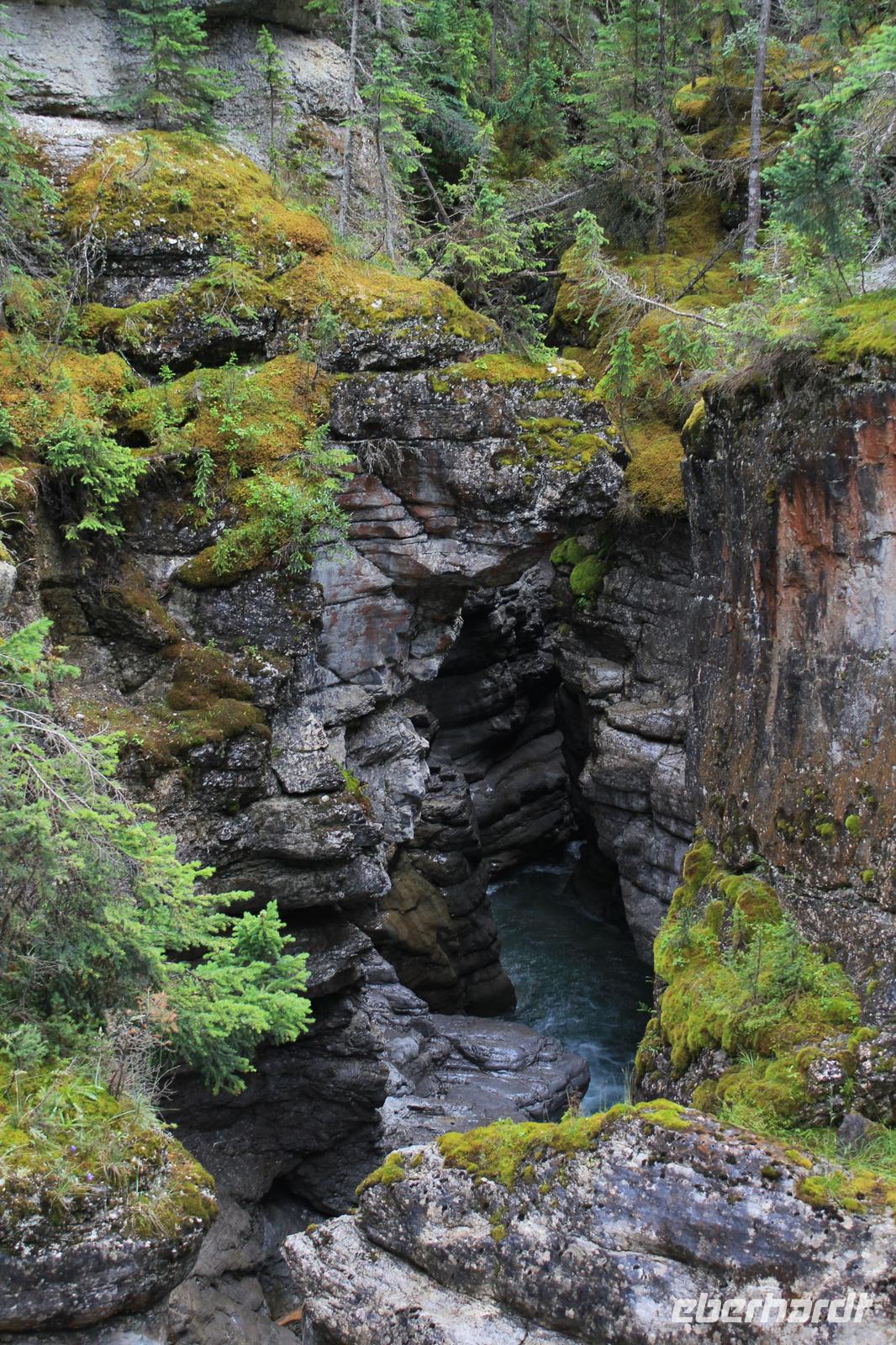 Gegen 14:15 Uhr brechen wir wieder auf und nach ein wenig „unnützem Wissen" über Kanada, erreichen wir wenig später die Maligne Schlucht. Hier wollen wir nur einen kurzen Spaziergang unternehmen, was uns (fast) ganz und gar regenfrei gelingt. Mehrere Brücken überspannen die sich stellenweise zu einer schmalen Klamm verengende Schlucht. Nasse Tropfen von oben treiben uns dann aber doch zurück in den Bus. In Jasper unternehmen wir noch einen gemütlichen Stadtbummel und sehen sogar den Personenzug „Canadian", der sich mit seinen silbernen Panoramawaggons herrlich in die Berglandschaft einfügt.