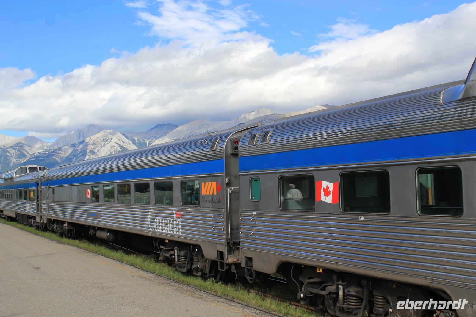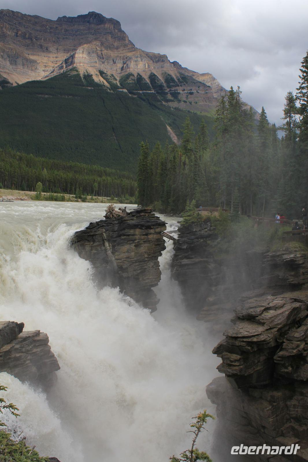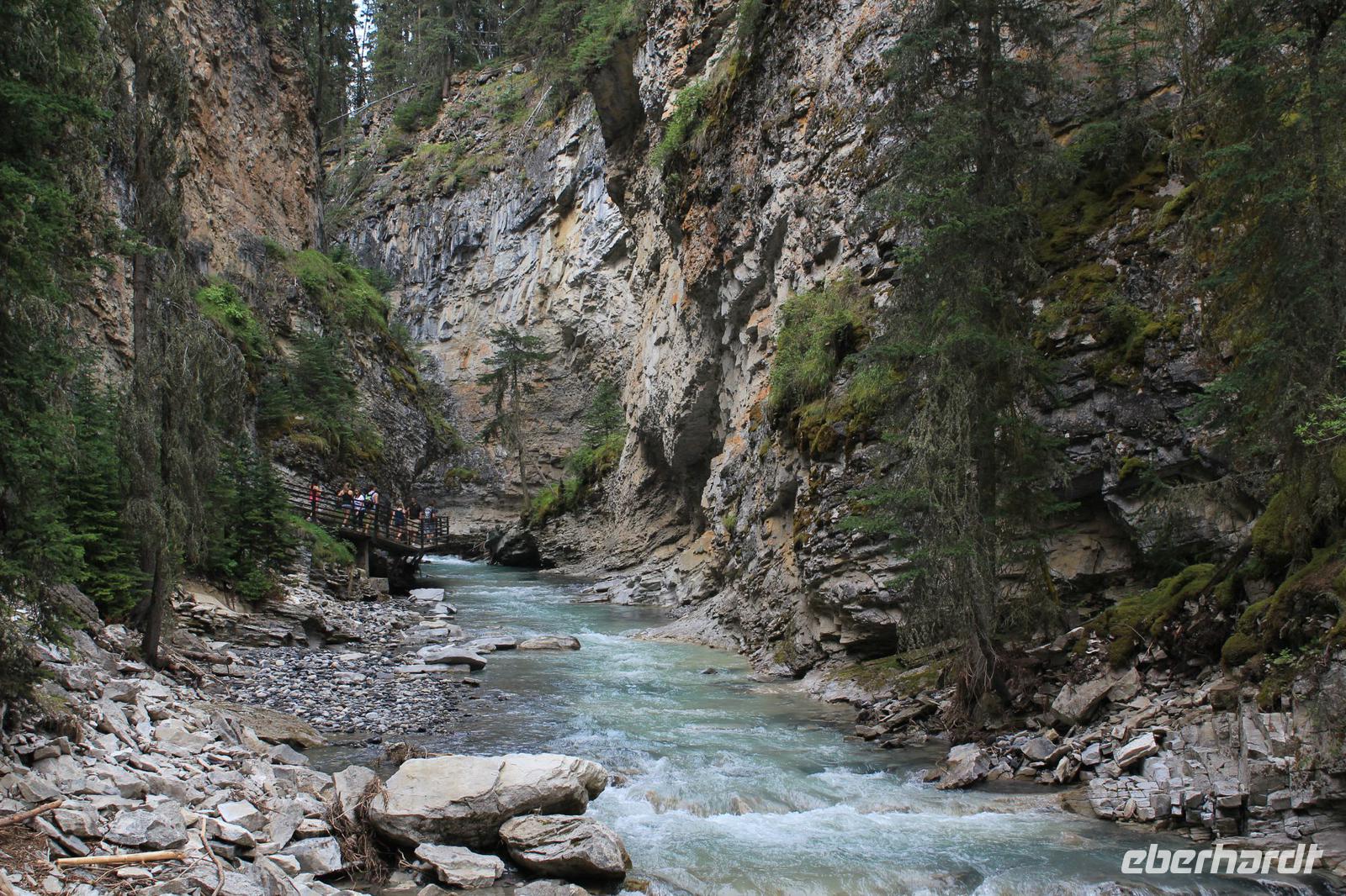Gegen 14:15 Uhr brechen wir wieder auf und nach ein wenig „unnützem Wissen" über Kanada, erreichen wir wenig später die Maligne Schlucht. Hier wollen wir nur einen kurzen Spaziergang unternehmen, was uns (fast) ganz und gar regenfrei gelingt. Mehrere Brücken überspannen die sich stellenweise zu einer schmalen Klamm verengende Schlucht. Nasse Tropfen von oben treiben uns dann aber doch zurück in den Bus. In Jasper unternehmen wir noch einen gemütlichen Stadtbummel und sehen sogar den Personenzug „Canadian", der sich mit seinen silbernen Panoramawaggons herrlich in die Berglandschaft einfügt.