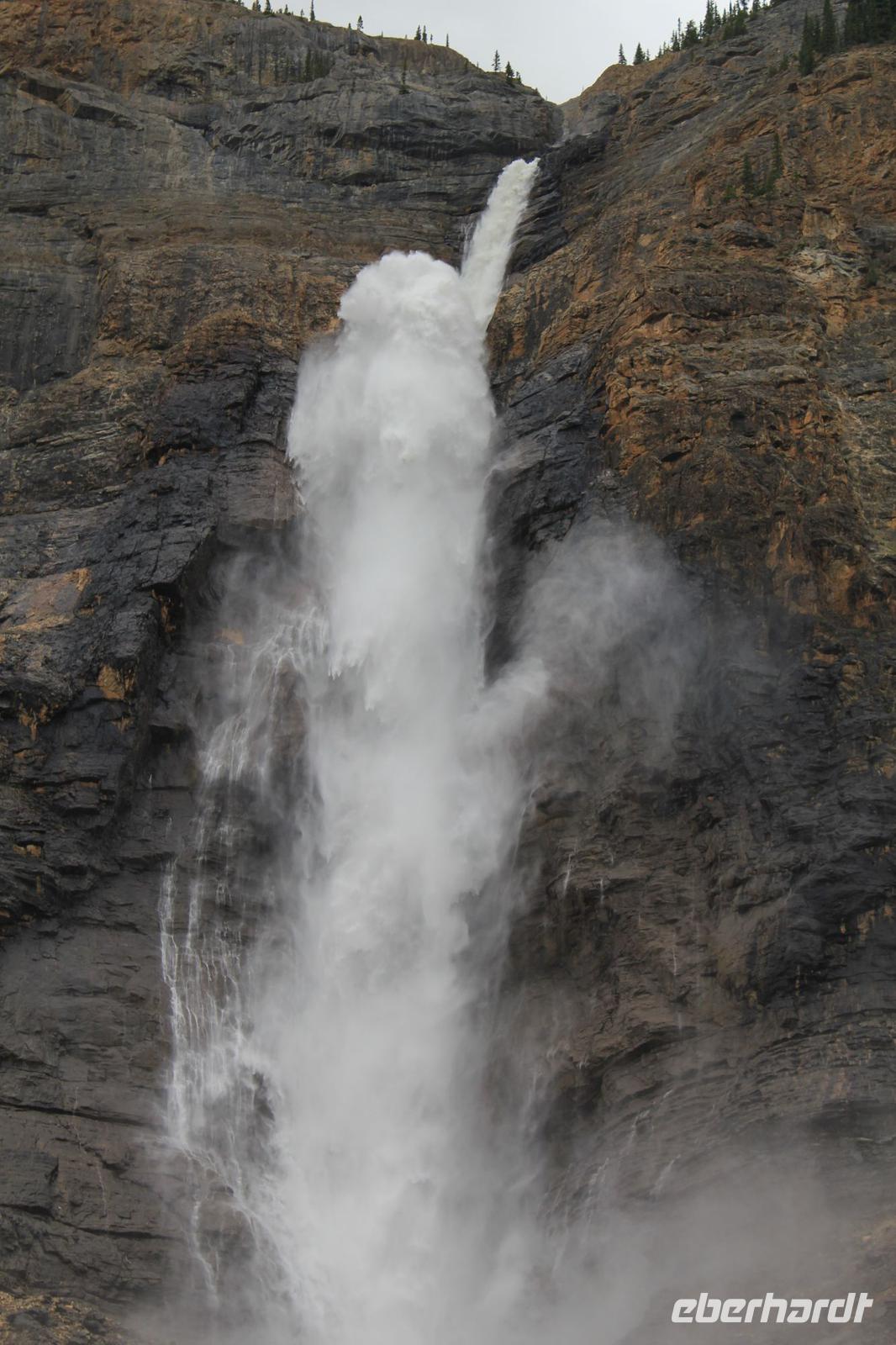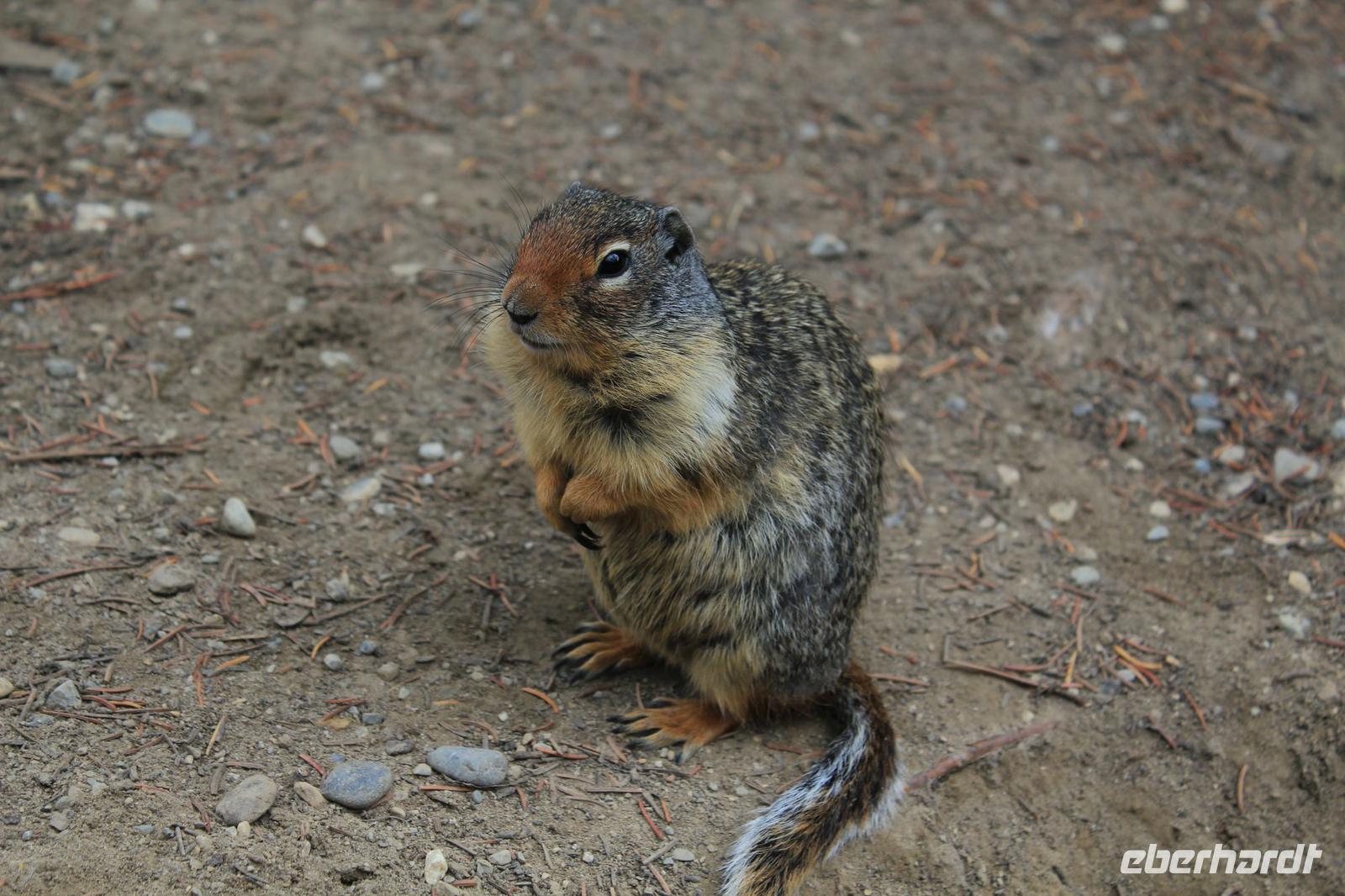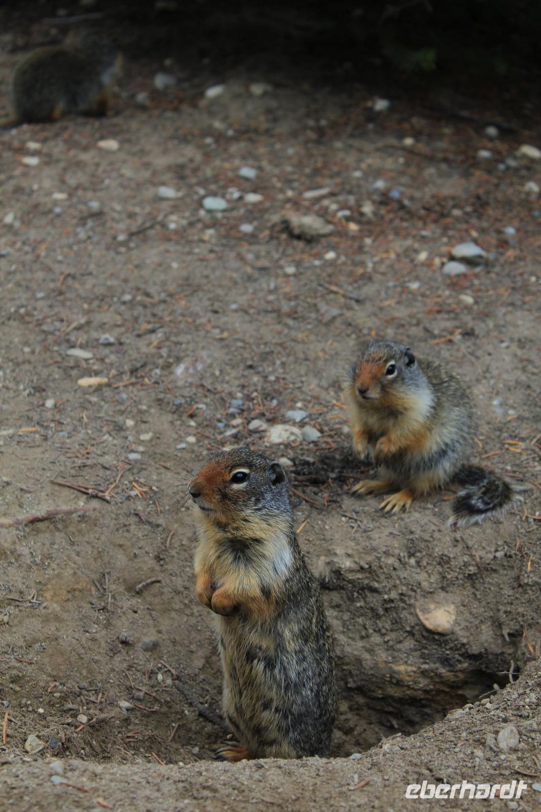 Weiter geht es zur Natürlichen Brücke, die der tosende Kicking Horse Fluss aus einer Felsbarriere förmlich ausgefräst hat. Ein beeindruckendes Fleckchen Natur! Nun wollen wir uns einem kleinen Extra-Programmpunkt widmen und so chauffiert uns Gerard gekonnt, teilweise rückwärts, eine enge Bergstraße hinauf. Unser Ziel sind die imposanten Takakkaw Falls, die mit ihren fast 300 m Höhe zu den höchsten Wasserfällen Nordamerikas gehören. Gewaltige Wassermassen stürzen hier laut tosend in die Tiefe und lassen uns staunen über die Mächtigkeit der Natur, die uns hier geboten wird! Noch dazu, beglücken uns entzückende kleine Streifenhörnchen, die neugierig aus Ihrem Erdloch schauen und für unsere Fotos förmlich zu posieren scheinen!