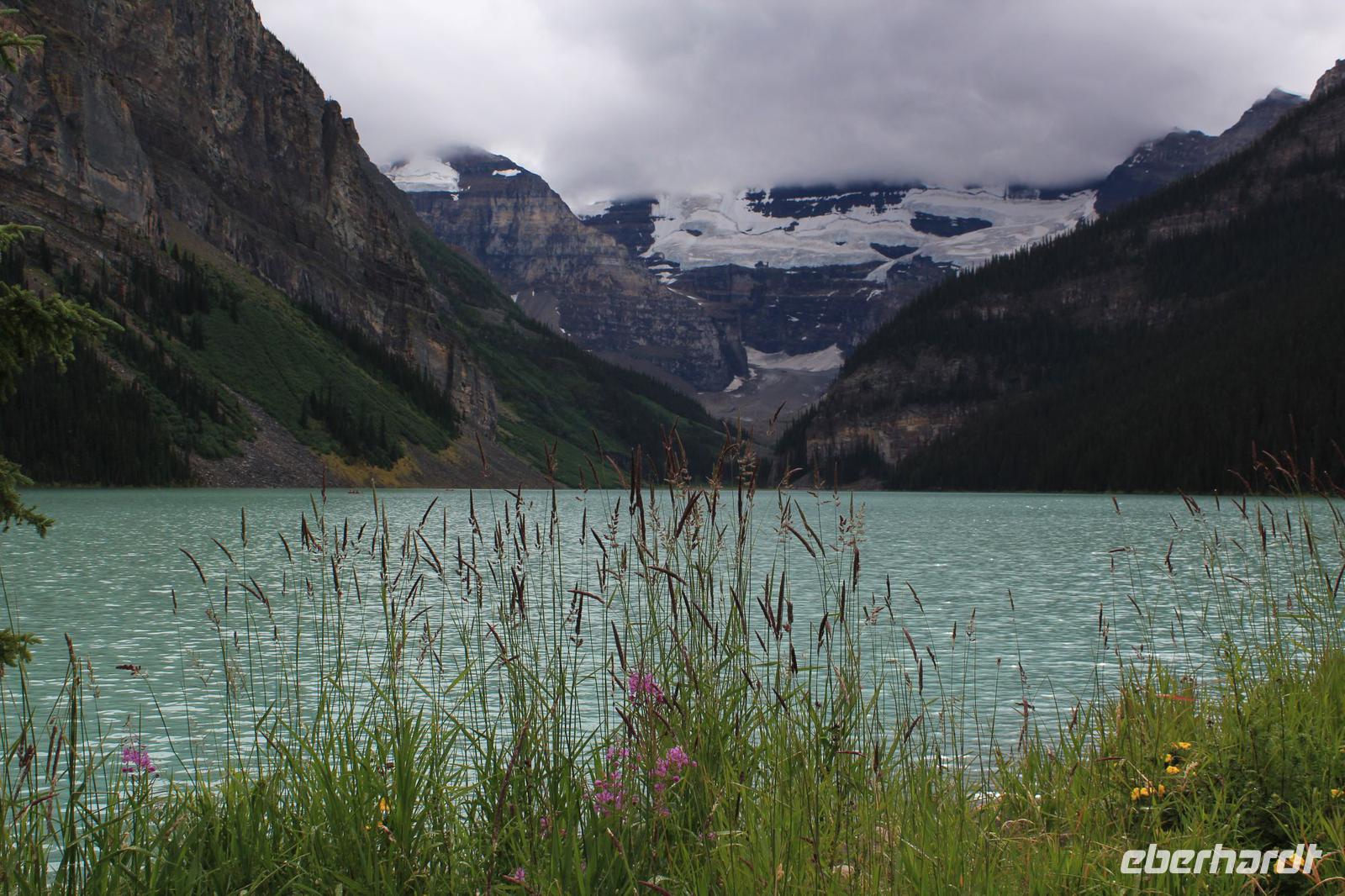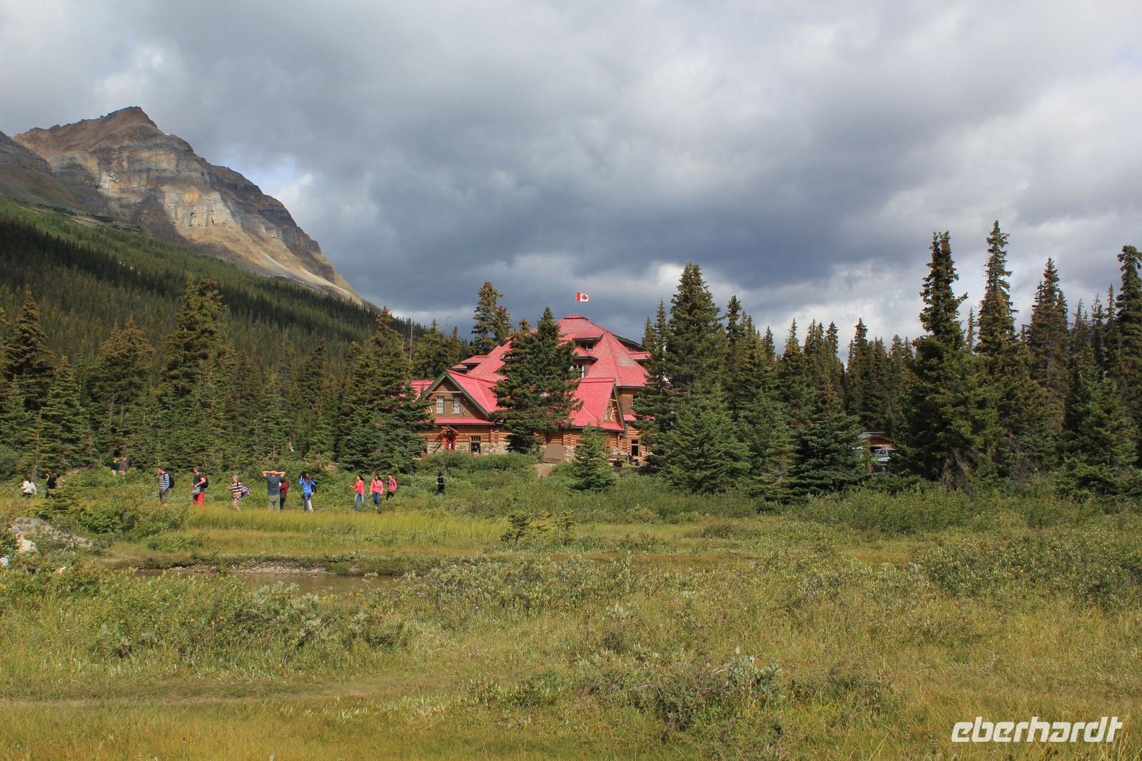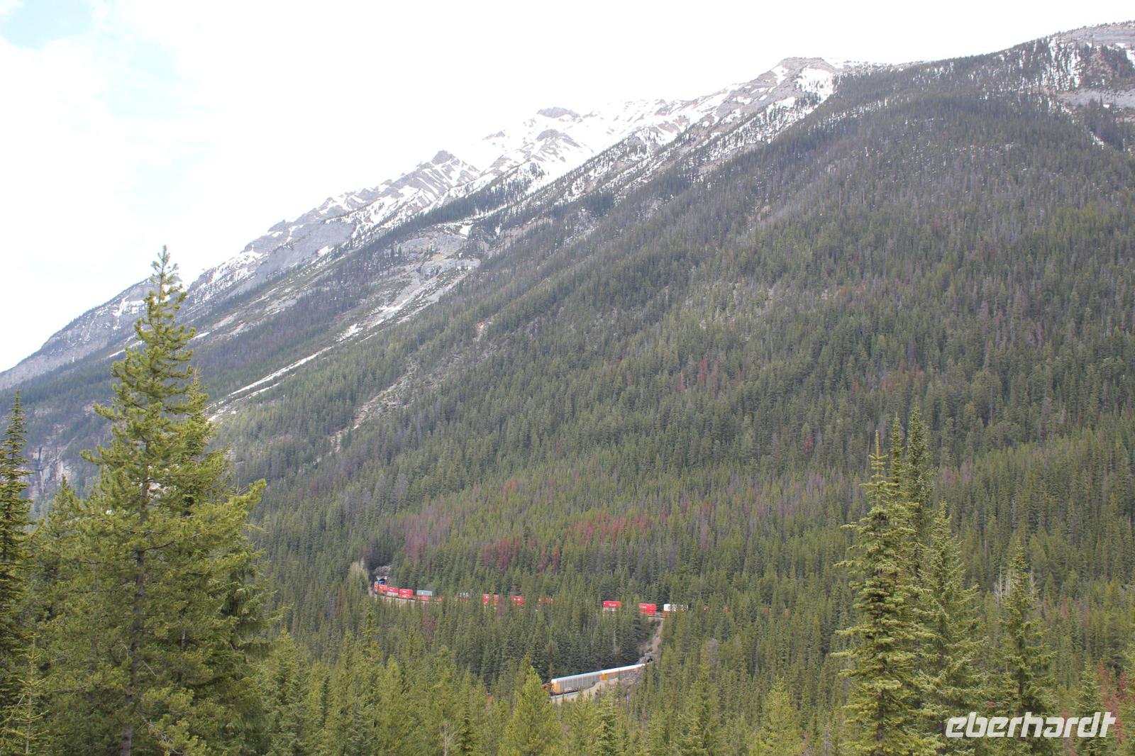 Nach einem kurzen Fotostopp am gewaltigen Castle Mountain, der wir eine riesige Burg über dem Nadelwald thront, erreichen wir wenig später über den Kicking Horse Pass den (unteren) Spiraltunnel im Yoho-Nationalpark. Dieser ist der vierte im Bunde der großen Naturschutzgebiete der kanadischen Rockies. Jetzt muss nur noch ein Güterzug kommen, der sich vollbeladen mit seinen hunderten bunten Wagons den Pass hinaufquält und für eine Zeit lang aus beiden Enden des Berges hinaus schaut. Doch trotz aller Geduld, es will einfach kein Zug kommen! Auch bei einem 2. und sogar 3. Versuch sollte uns dieser Anblick heute leider verwehrt bleiben. Egal, weitere Höhepunkte warten auf uns! Unser nächstes Ziel ist der malerische, türkis-schimmernde Bergsee Emerald Lake, der umringt wird von den 3.000 m hohen Bergen der President Range. Rote Kanus treiben wie Spielzeugboote auf dem Wasser. Nachdem zuerst einige Regentropfen den See wie einen blubbernden Kochtopf wirken lassen, kommt kurze Zeit später die Sonne raus und der See erstrahlt in seiner ganzen farbigen Pracht!