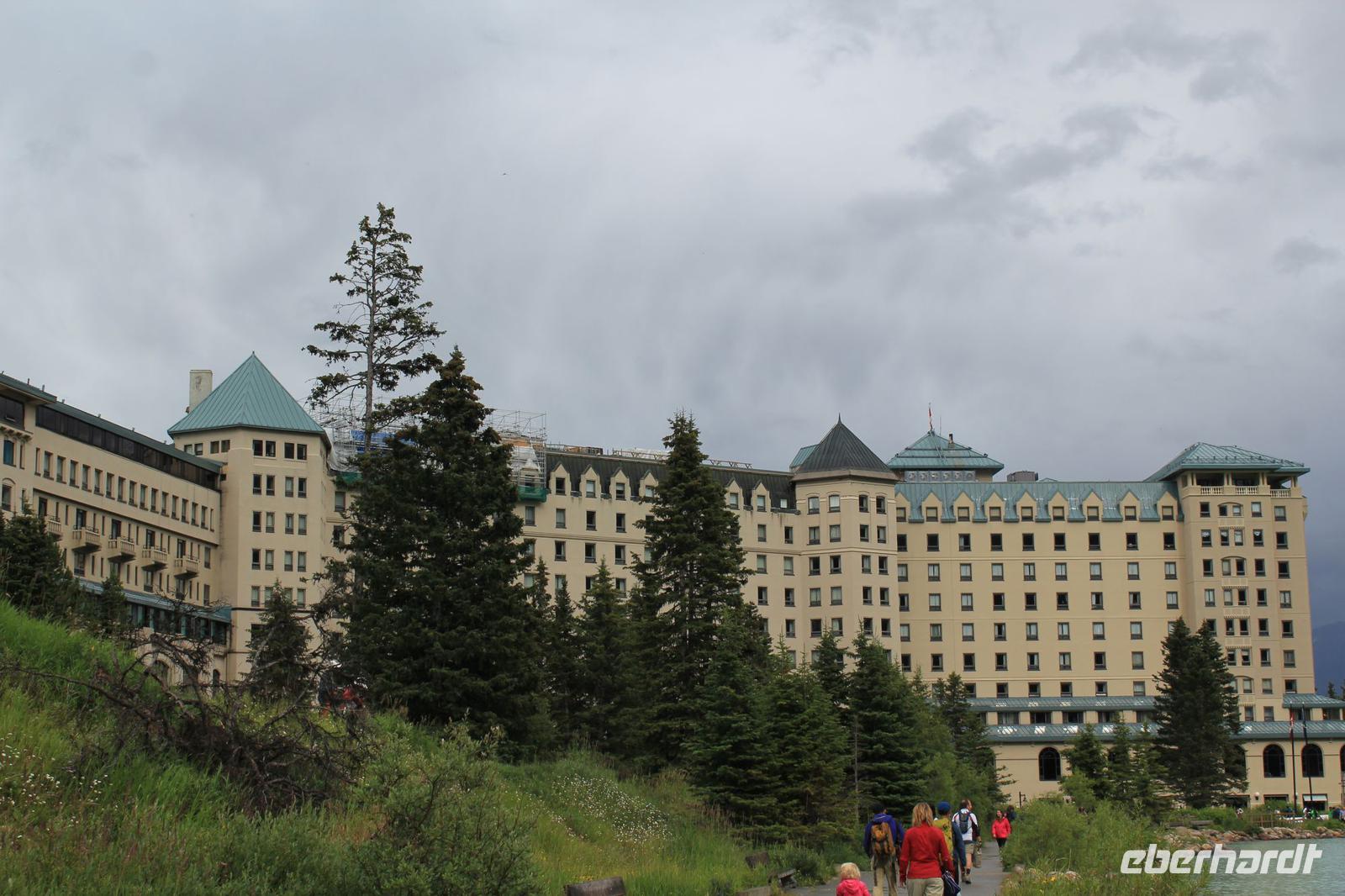 Zurück im Banff-Nationalpark widmen wir unseren letzten Stopp der meistbesuchten Natursehenswürdigkeit des Parks - dem Lake Louise, der 1.731 m über dem Meeresspiegel liegt. Von den Stoney-Indianern wurde der idyllische See einst „See der kleinen Fische" genannt und erhielt später seinen Namen nach der Tochter der englischen Königin Victoria. Gespeist wird der ca. 2 km lange und 70 m tiefe Moränenstausee vom fast bis zum See hinunter reichenden Victoria Gletscher. Blickfang ist hier natürlich das von der Eisenbahngesellschaft Canadian Pacific Railway, errichtete Fairmont Hotel Chateau Lake Louise, dass seit 1890 als schlossähnliches Grandhotel am Ufer des Sees thront. Ein lustiges Gruppenfoto, einen Kaffee und einen Spaziergang am Seeufer später, treten wir gegen 17:20 Uhr schließlich die Rückfahrt nach Canmore an. Nach so vielen Erlebnissen haben wir uns unser Abendessen redlich verdient und so speisen wir heute französisch im Restaurant „Chez Francois".
