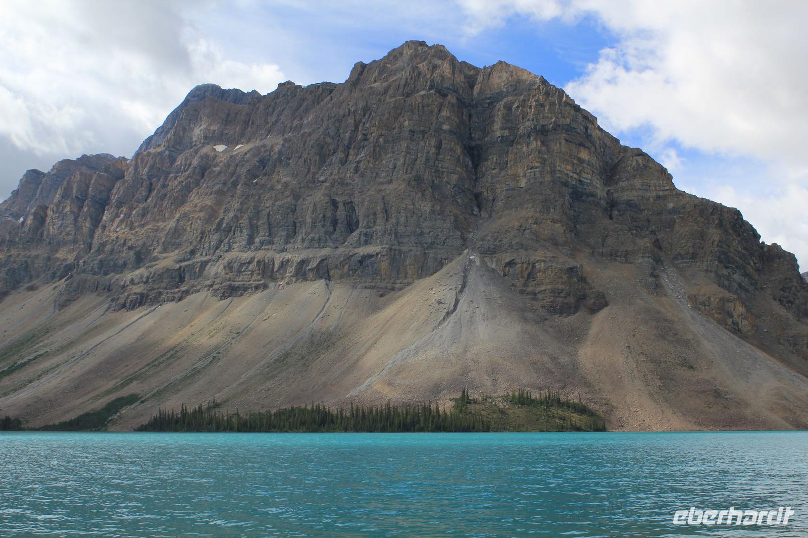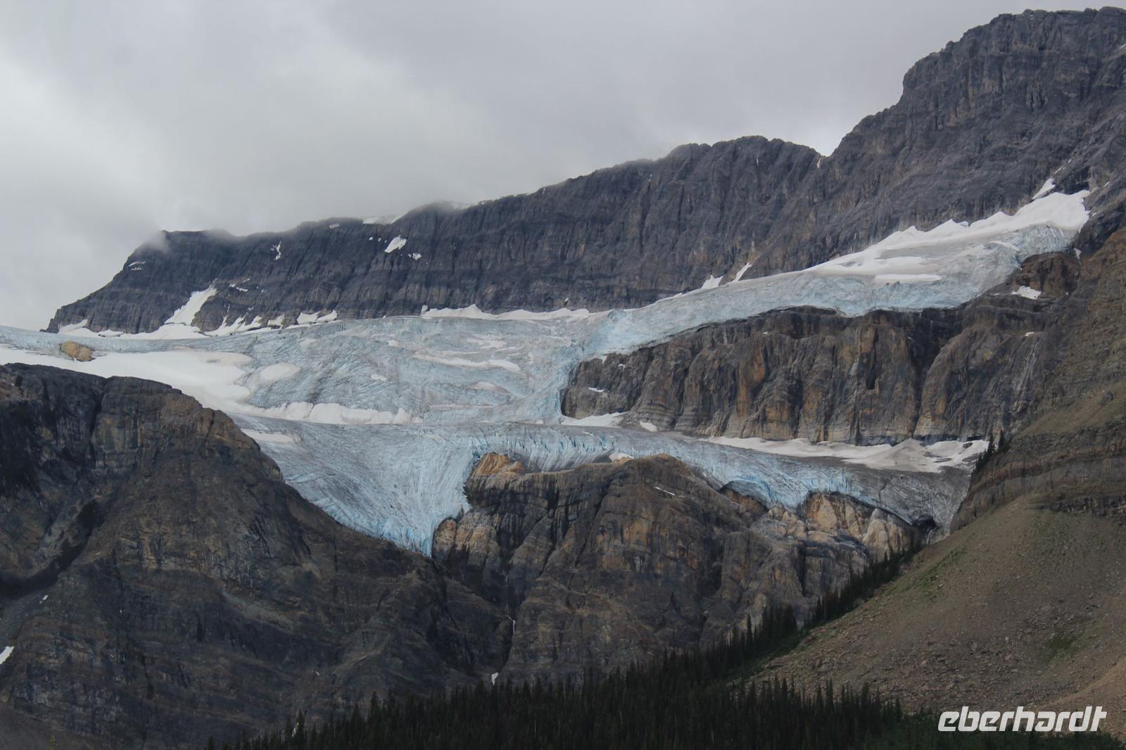Es dauert nicht lang, da erblicken wir einen hängenden Gletscher nach dem anderen in den Bergsenken und unsere Fotoapparate laufen heiß! Den besonders hübschen Krähenfußgletscher nehmen wir bei einem Fotostopp näher in Augenschein. Wenig später unternehmen wir einen kleinen Spaziergang am wunderschön hellblauen Bow Lake. Der gleichnamige Gletscher im Hintergrund wird vom Wapta-Eisfeld gespeist.