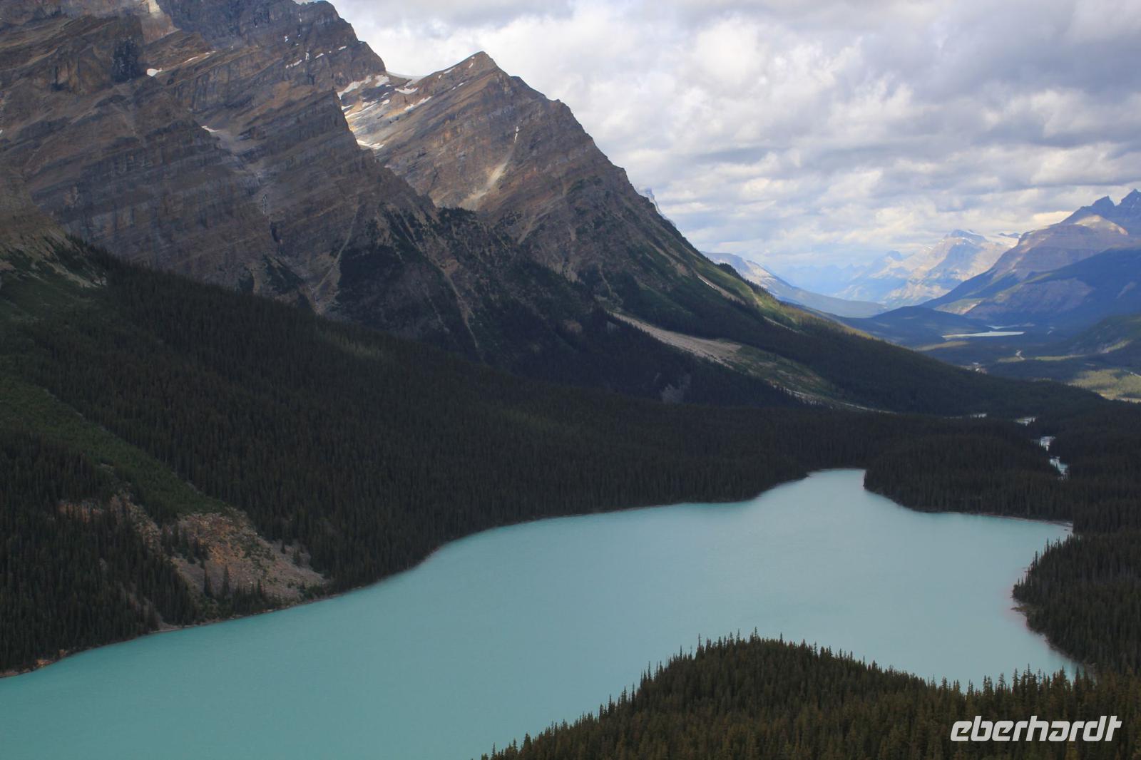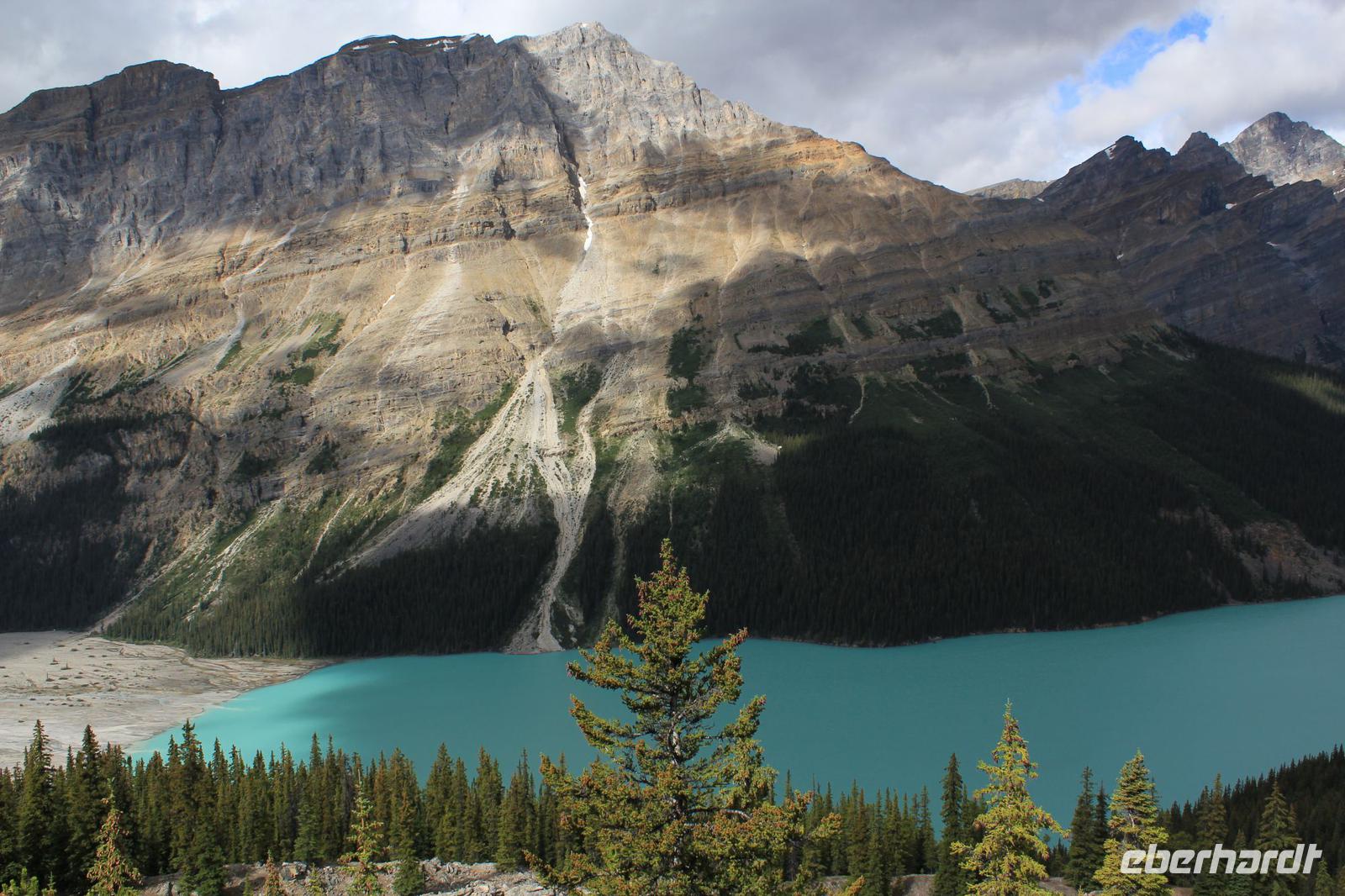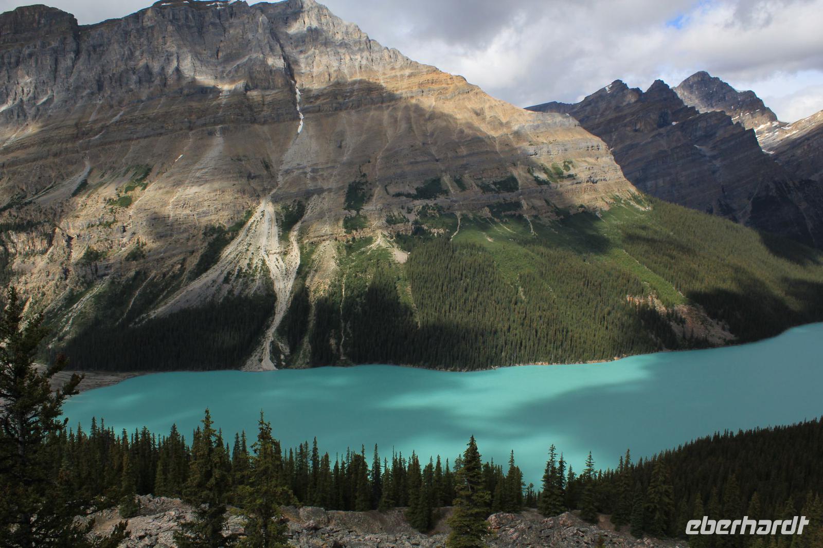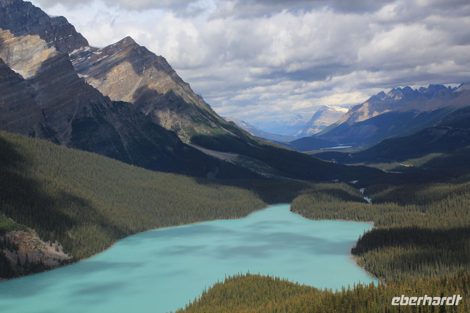 Bei unserem nächsten Stopp fühlen wir uns nun wirklich wie Teil einer Postkarte: am sagenhaft schönen Peyto Lake, trauen wir bei dieser Farbintensität kaum unseren Augen! Malerisch, von dichten Wäldern umrahmt, leuchtet der langgestreckte, von einer Endmoräne angestaute See in sattem Türkis. Noch dazu haben wir in einer Höhe von 2.135 m den höchsten Punkt unserer Reise (mit dem Bus) erreicht - den Bow Pass. Das Wechselspiel von Sonne und Wolken wirft ein eindrucksvolles Fleckenmuster auf den See und wir haben vollends das Gefühl, Kanada wirklich so zu erleben, wie wir es uns immer vorgestellt haben! Traumhaft! Im Hintergrund deutet sich das Mistaya Tal an, was wir wenig später durchfahren. Vorbei geht es nun an zahlreichen Gletschern und die Panoramastraße macht ihrem Namen wirklich alle Ehre.