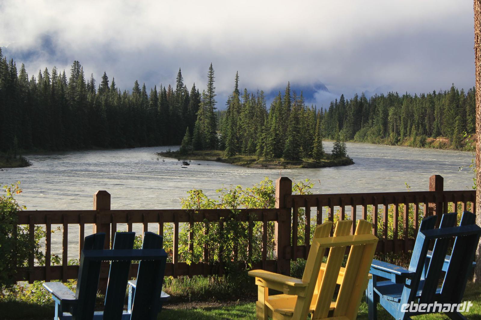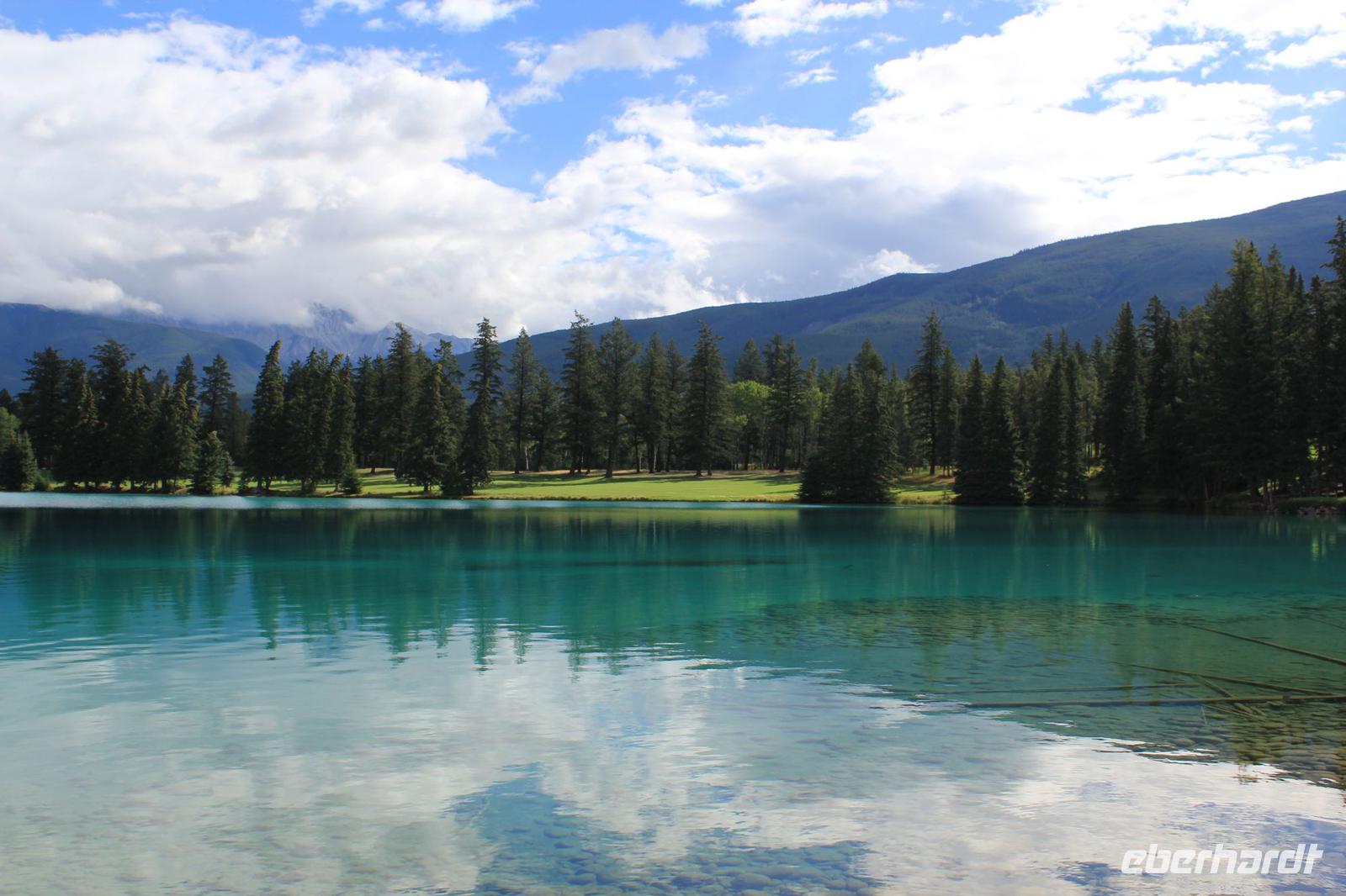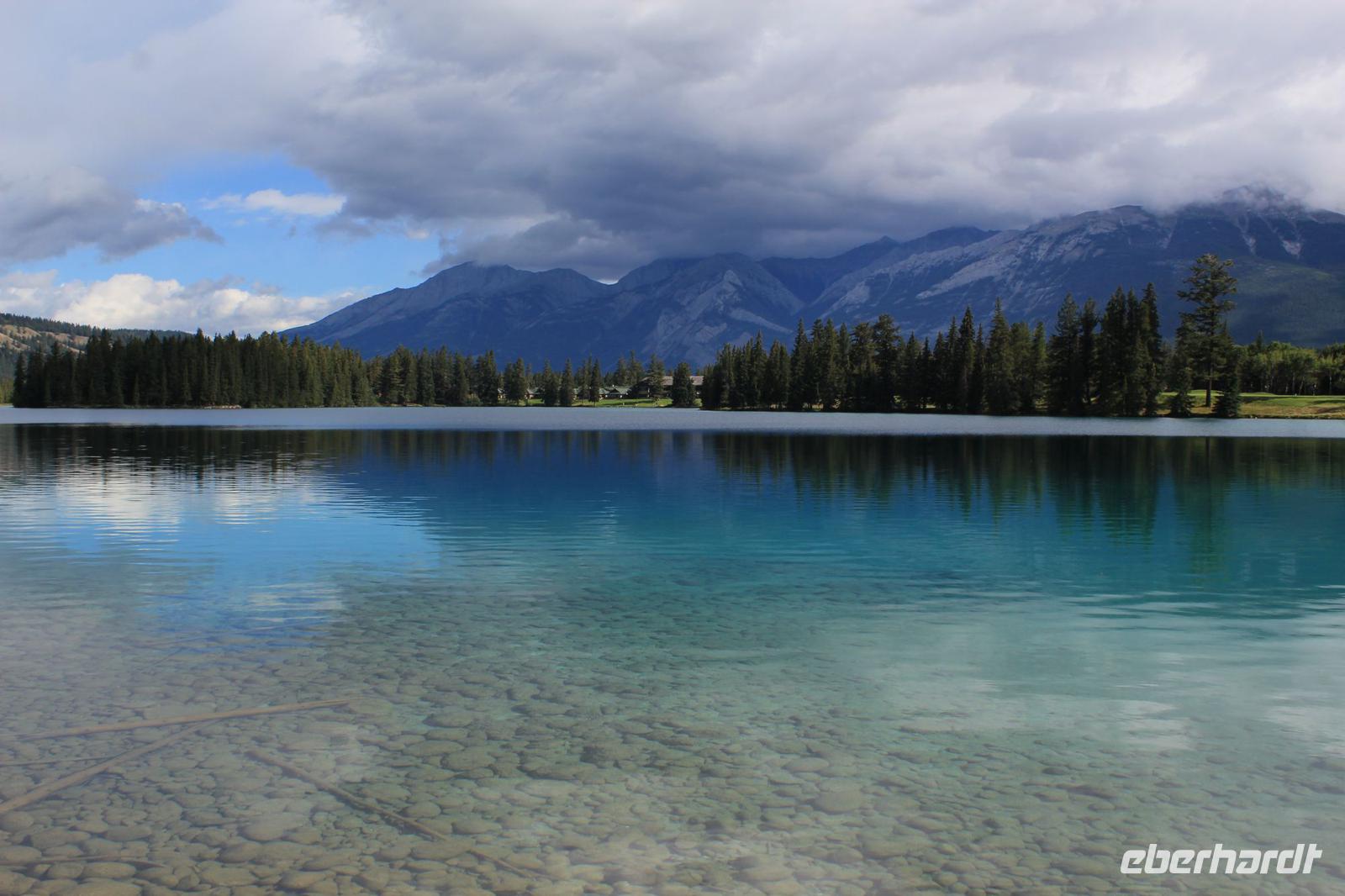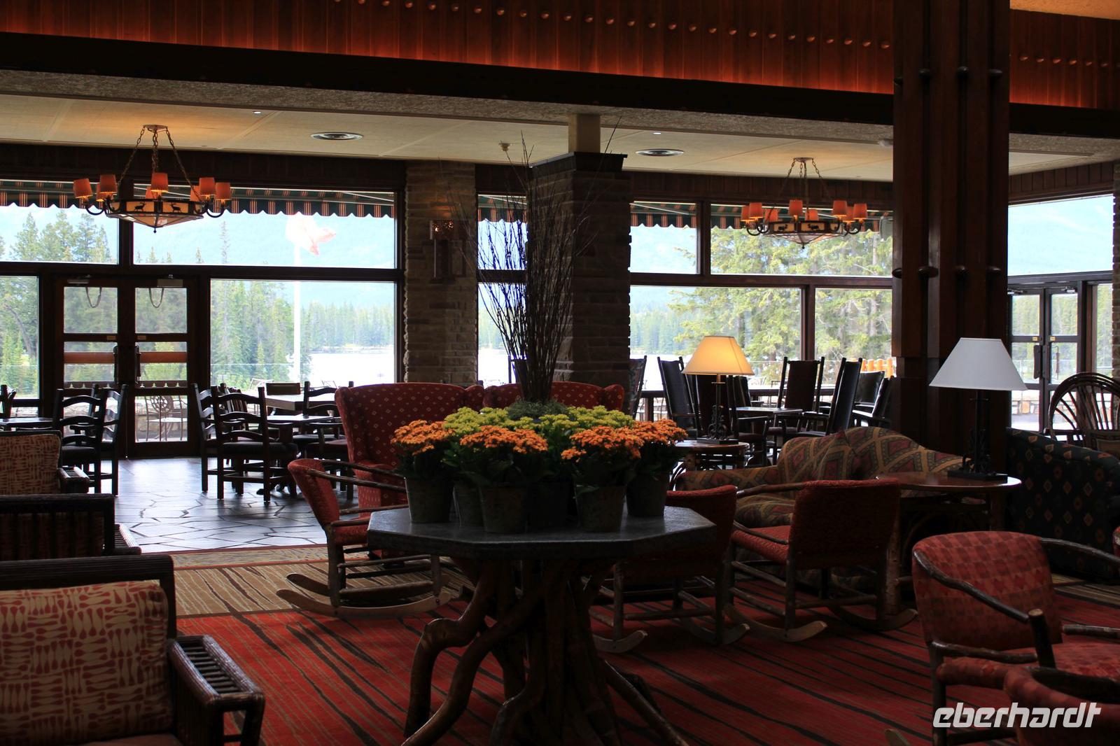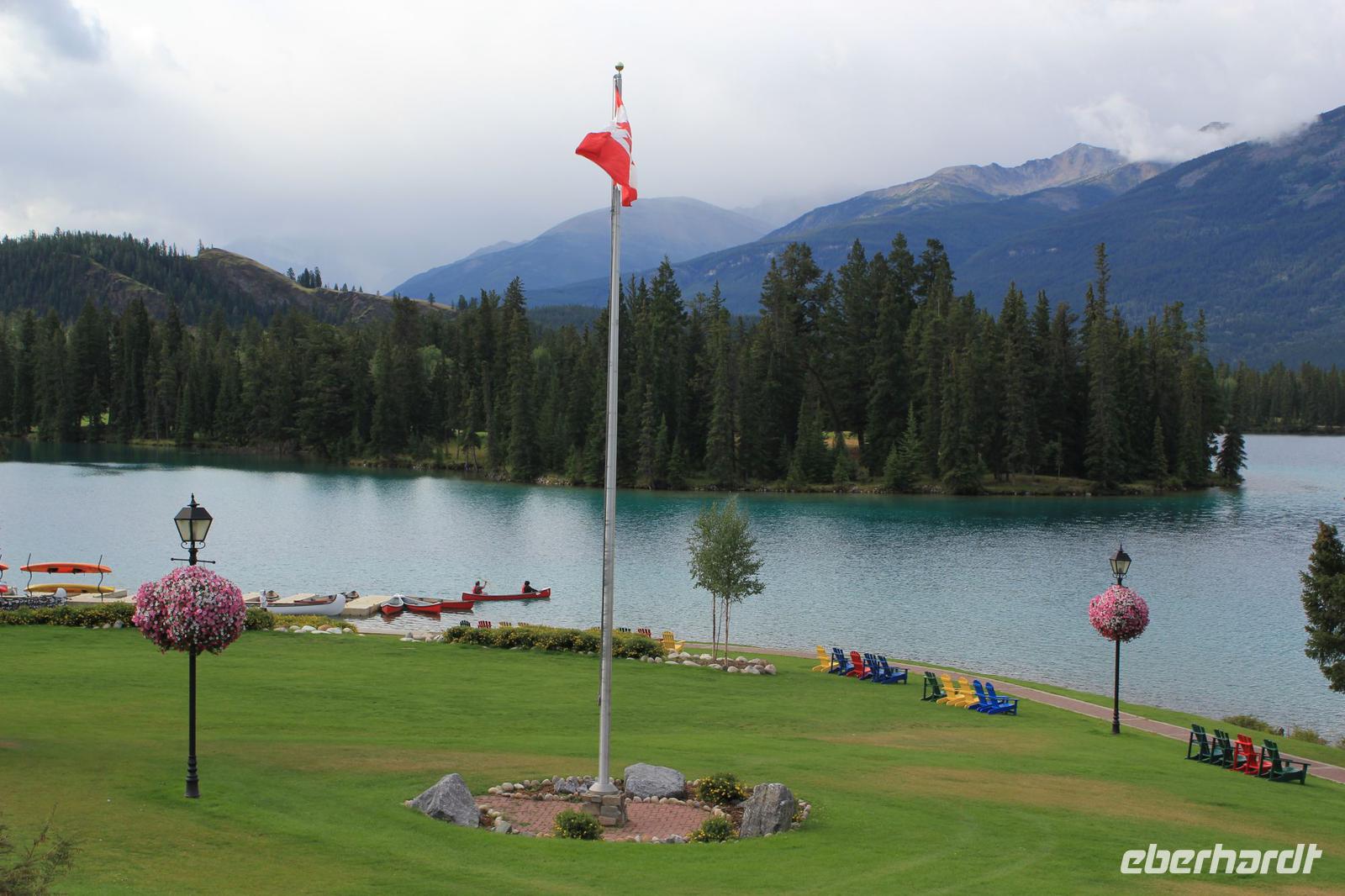 Wir fahren zur Fairmont Jasper Park Lodge, die sich direkt am wildromantischen See Lac Beauvert befindet. In den Zedernholzblockhütten übernachtete bereits das englische Königshaus! Die gemütlich-schicke Hotellobby ist ausgestattet mit hölzernen Schaukelstühlen, Kamin und riesigen Fensterfronten, die einen herrlichen Blick auf den See bieten. Bei einem ausgiebigen Spaziergang rund um den See erleben wir die Spiegelung der umliegenden Berge und die wunderschöne blau-grüne Farbe des Sees tut sein Übriges. Ab und zu blinzelt sogar die Sonne hervor!