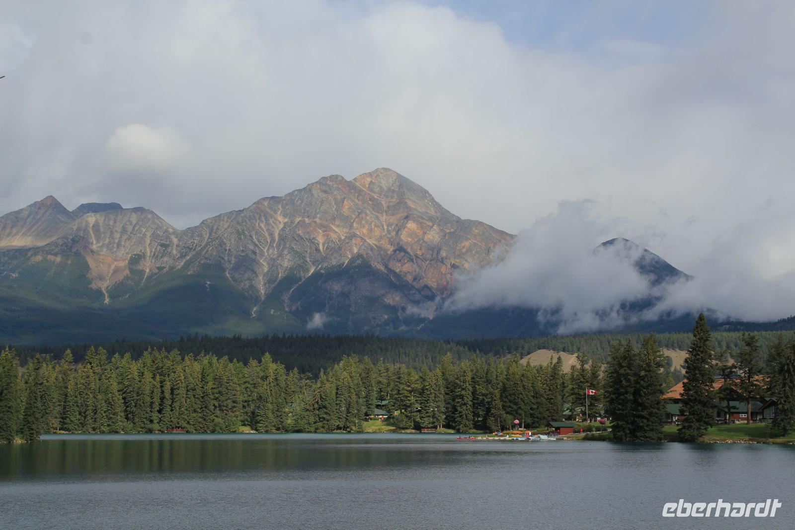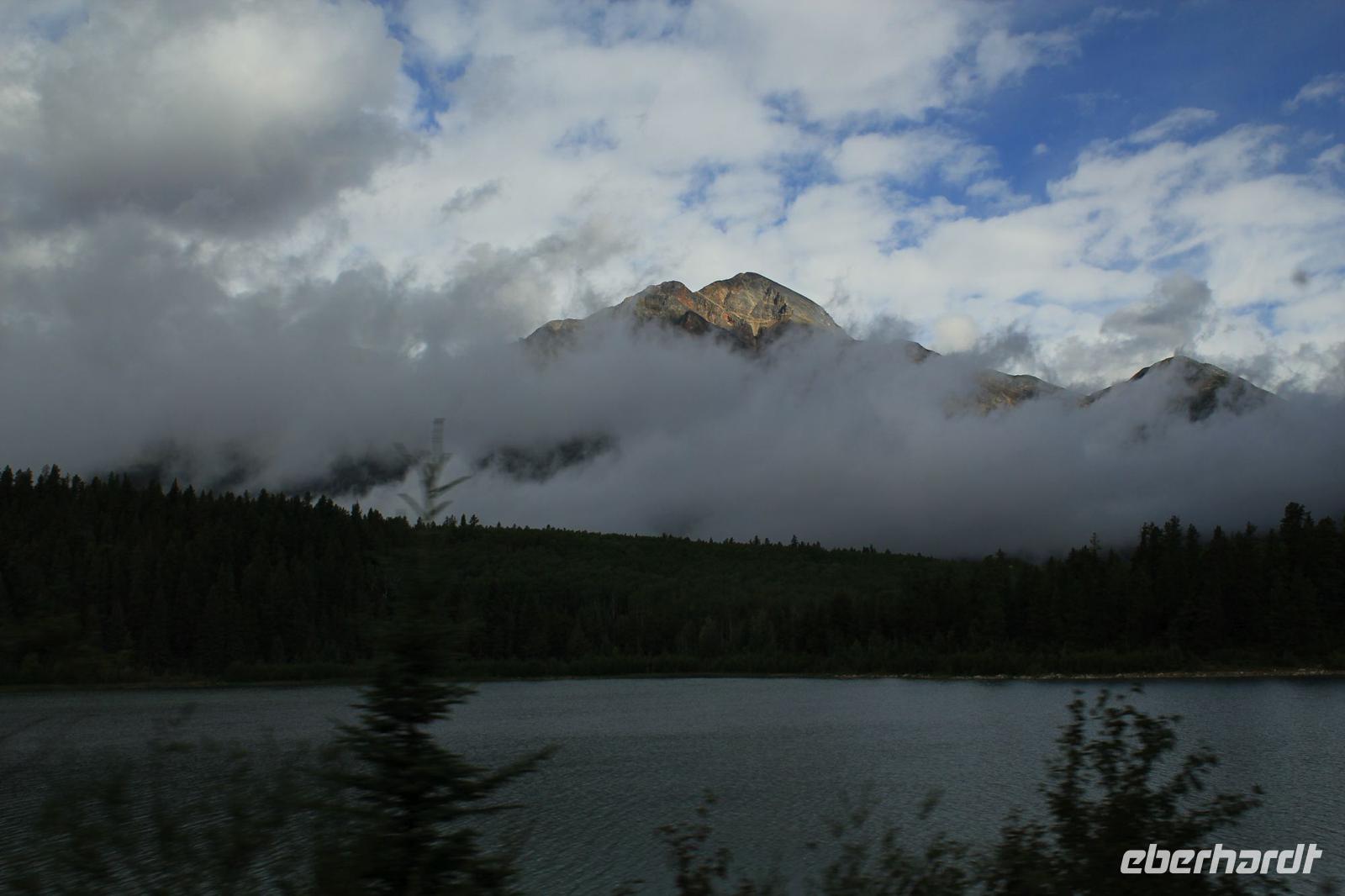 Am heutigen Morgen werden wir teilweise vom sanften Geschrei der kanadischen Gänse, teils durch Elisas "zärtliches" Wachklopfen geweckt. Beim reichhaltigen Frühstück stärken wir uns für den Tagesausflug und wollen diesen mit einem Stopp am Hausberg Jaspers, dem Pyramid Lake, beginnen. Am Patricia Lake vorbei geht es über eine enge Bergstraße zum am Fuße des 2.768 m hohen, rötlich schimmernden Pyramid Mountain gelegenen See. Von einer kleinen idyllischen Insel aus wollen wir die Spiegelung des Berges im glatten See erblicken, aber...NEIN, der Berg versteckt sich hinter einer dichten Wolkenwand! Doch nicht verzagen, nur wenig später sollten wir den beeindruckenden Berg besser sichten können.