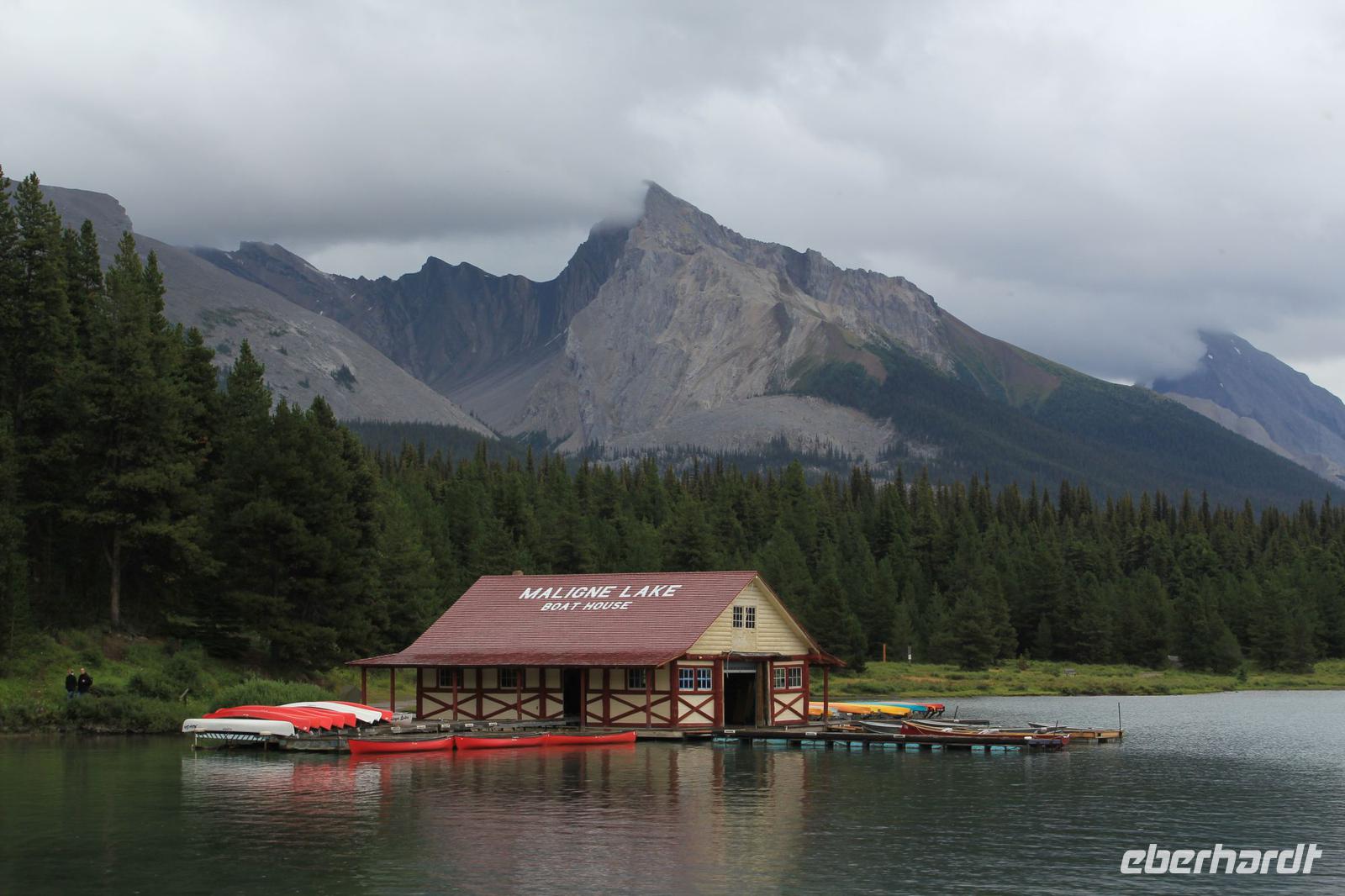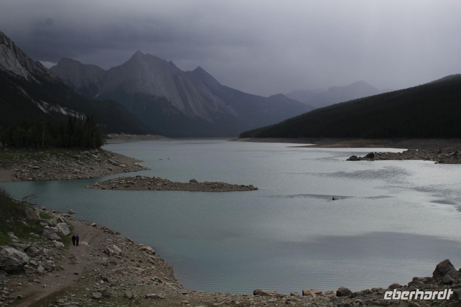 Auf unserem Weg zum zweitgrößten Gletschersee der Welt, dem Maligne Lake, begleitet uns der reisende gleichnamige Fluss, bis hin zu Medicine Lake (Medizinsee). Dieser Ausläufer des Maligne Flusses füllt und entleert sich über große Schlucklöcher auf seinem Grund, so schwankt der Wasserspiegel ständig. Wir fahren weiter und DA! Plötzlich, ein kleiner Schwarzbär am Straßenrand, der eilig die Böschung hinunter verschwindet, doch wir haben ihn erwischt! So viel Glück haben wir, angekommen am Maligne Lake leider nicht, denn es regnet beständig. Der in 1.673 m Höhe liegende See füllt ein bezauberndes Hochtal aus. Auch der weißleuchtende Maligne Gletscher ist gut im Hintergrund zu erkennen. Mit Blick auf den 22 km langen und nur 1 km breiten See genießen wir unsere Mittagspause und manch einer unternimmt auch einen kleinen Spaziergang am See entlang.