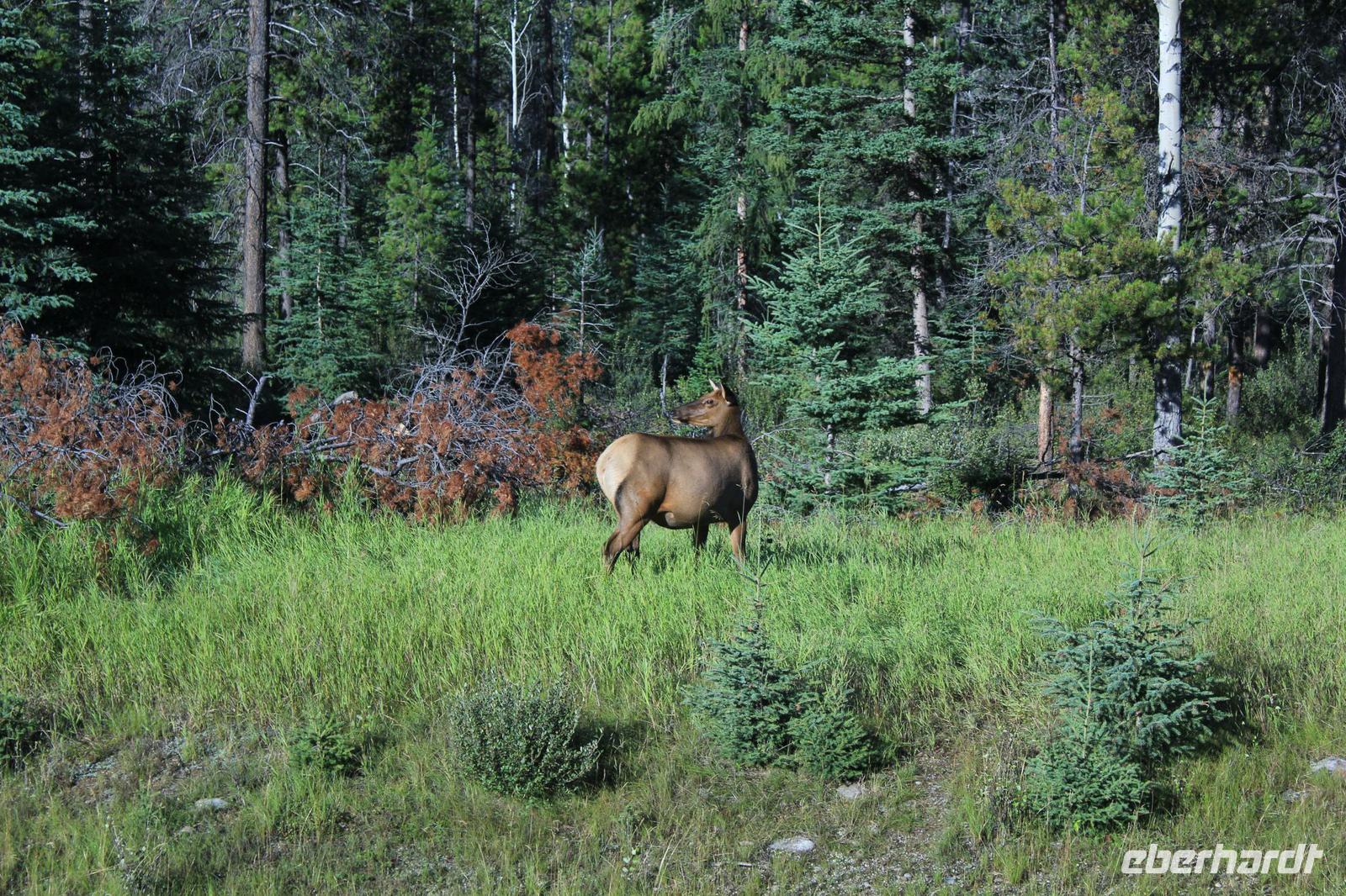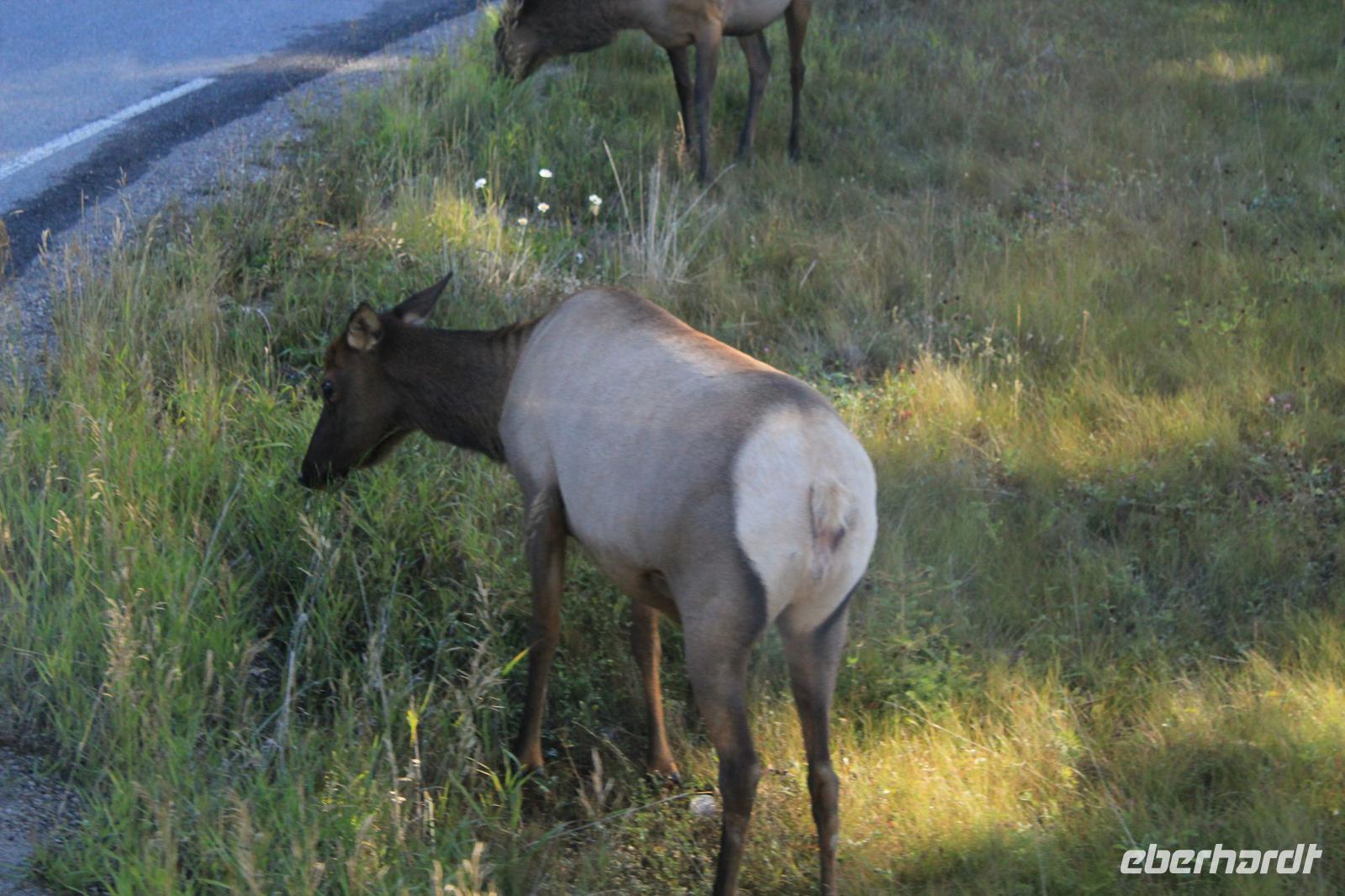 Kurz nach unserer heutigen Abfahrt erleben wir gleich die erste Überraschung: am Straßenrand grasen gemütlich ein paar Wapiti-Hirschkühe, die vom goldenen Morgenlicht fantastisch in Szene gesetzt werden!