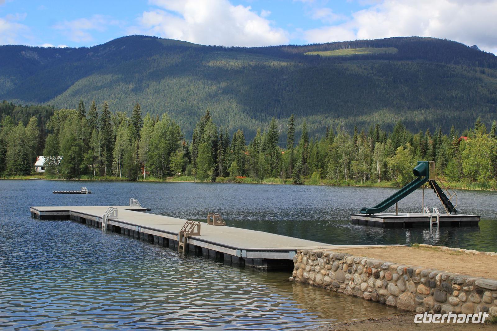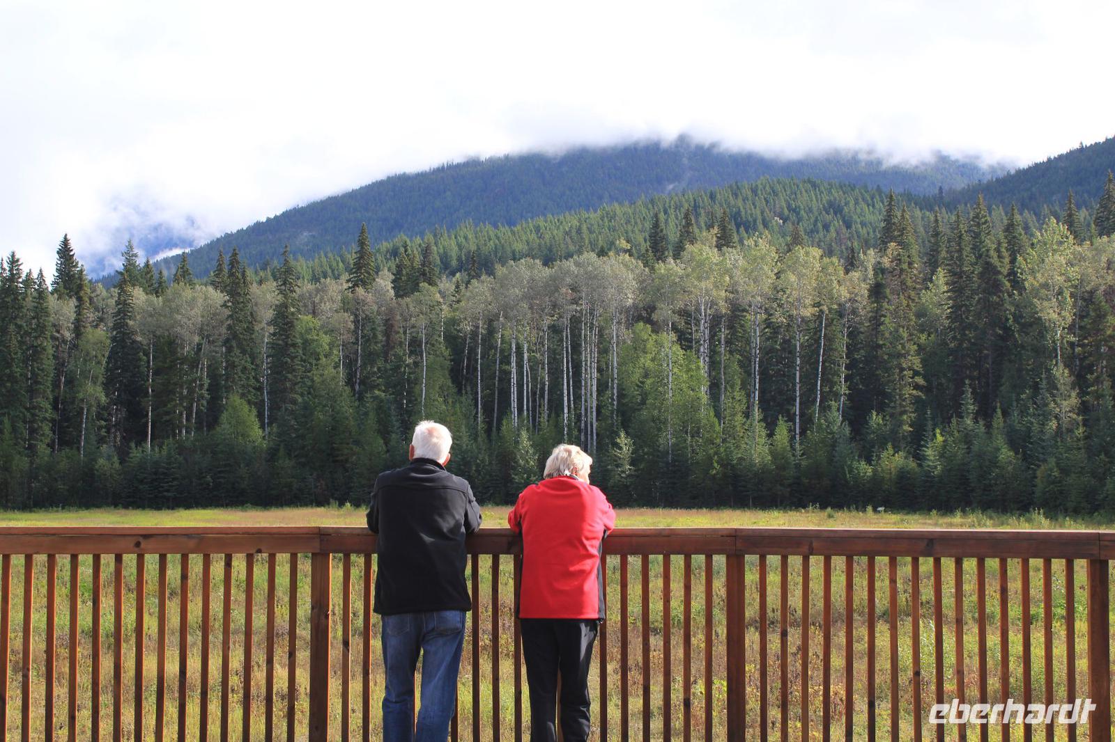 Jetzt liegt ein bisschen Fahrt durch British Columbia vor uns. Seit 1871 erst, 4 Jahre nach der Gründung des Landes in Form von 4 Kronkolonien an der Ostküste, zählt die dünn besiedelte Provinz zu Kanada, die nicht nur das Lachs-, sondern auch das Holzzentrum des Landes darstellt. Tatsächlich werden 51% des Weichholzes weltweit in Kanada gewonnen und British Columbia hat den größten Anteil daran! Das können wir uns bei unserer Fahrt durch die dichten, stattgrünen Wälder wirklich gut vorstellen! Nun wird es auch Zeit sich von den Rocky Mountains zu verabschieden. Ein letzter Blick, ein letztes staunendes Lächeln und zack, „Ende, Schluss, aus, vorbei" - wie Victor sagen würde. Folgend begleiten uns die Monarchy Mountains. Im kleinen Städtchen Blue River wollen wir heute unsere Mittagspause mal auf eine etwas andere Art und Weise verbringen: bei einem Picknick am See, abseits der Touristenscharen, genießen wir Sandwiches und Obst umringt von herrlicher Natur.