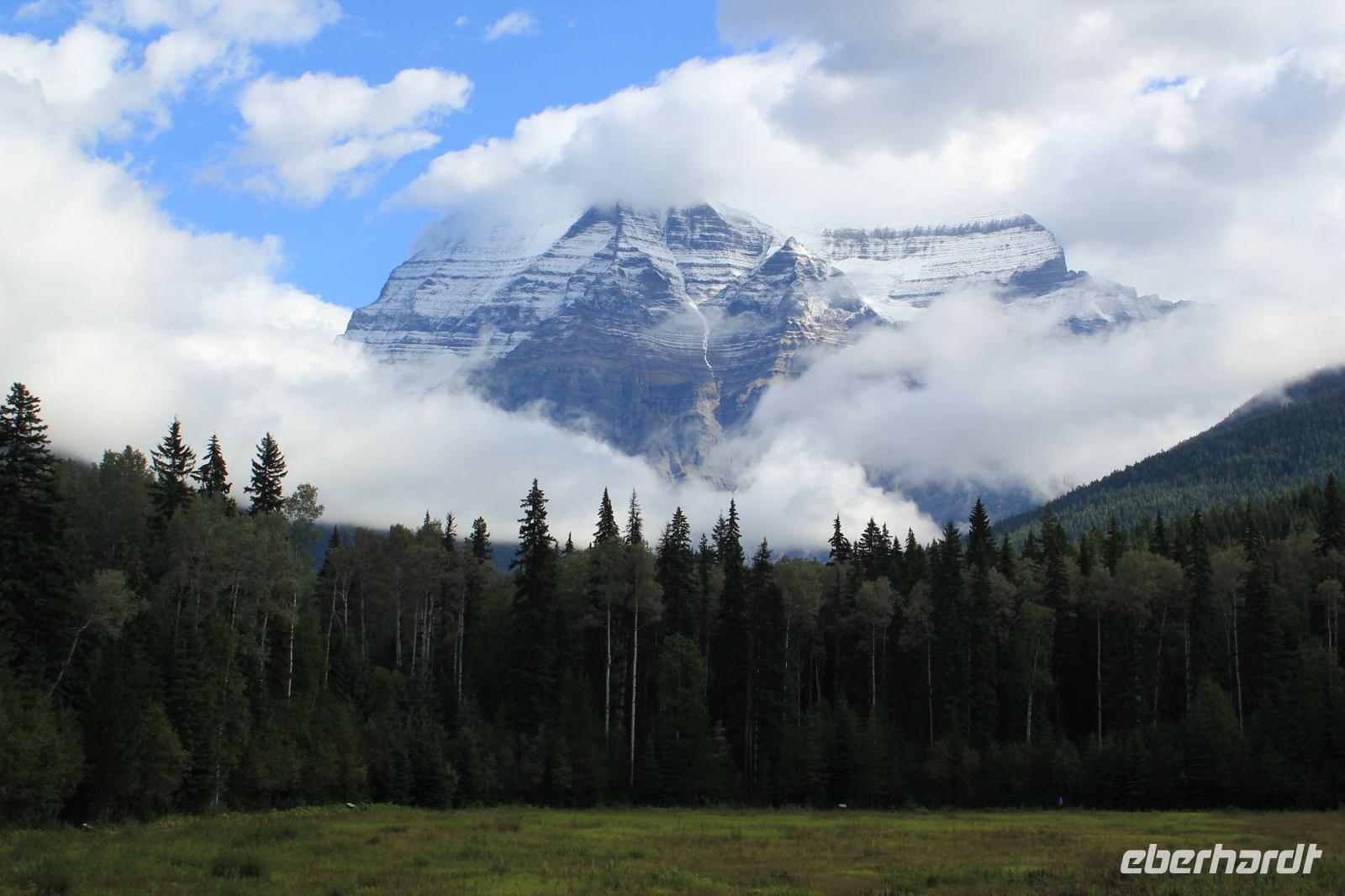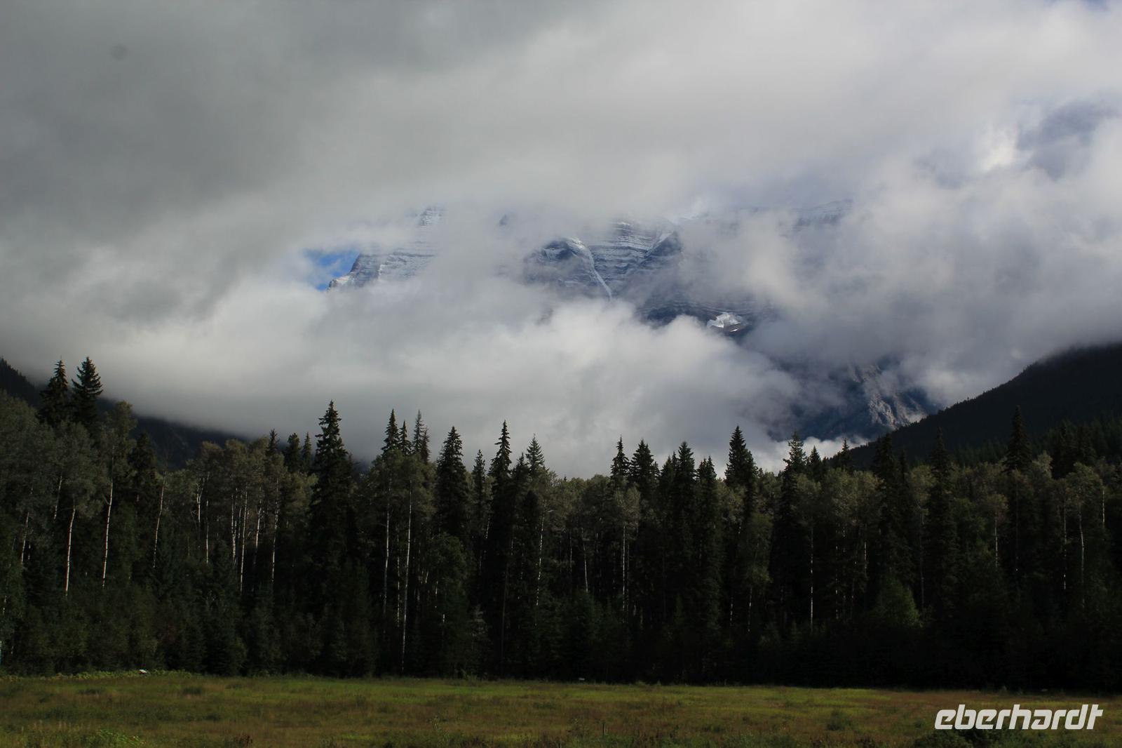 Gegen 09:20 Uhr erreichen wir nun das gewaltige Bergmassiv des 3.954 m hohen Mount Robson. Doch wie Sie sehen, sehen Sie nix! Der Berg deutet seine Existenz nicht einmal an und versteckt sich scheu hinter einer dicken Wolkenwand. Nur ganz zögerlich bequemt er sich dazu, die eine oder andere Stelle von sich zu zeigen, aber schließlich nach ca. 1 Stunde wird unsere Geduld, unsere Bitten und das Gutzureden doch belohnt und der Mount Robson schält sich fast komplett aus seinem Wolkenkleid! Ein prächtiger Kerl, dessen Spitze (die wir leider nicht ganz sehen können) steil in den Himmel ragt und alle umliegenden Berge in den Schatten stellt!