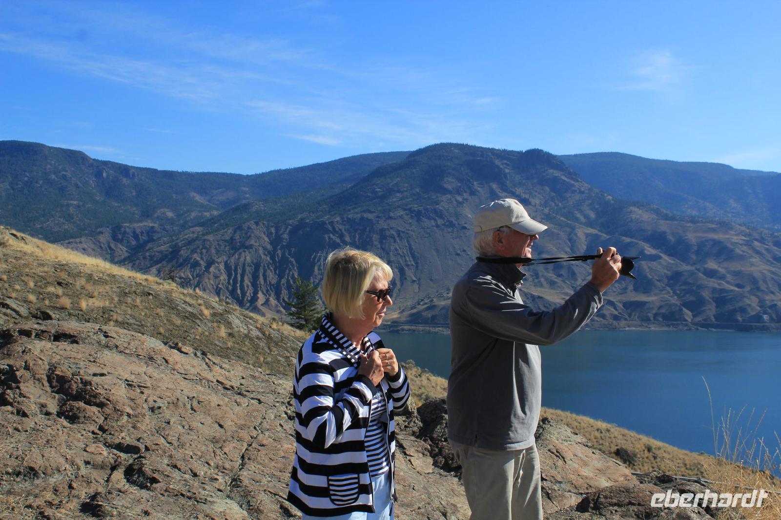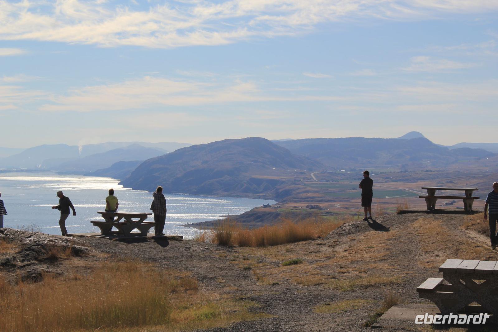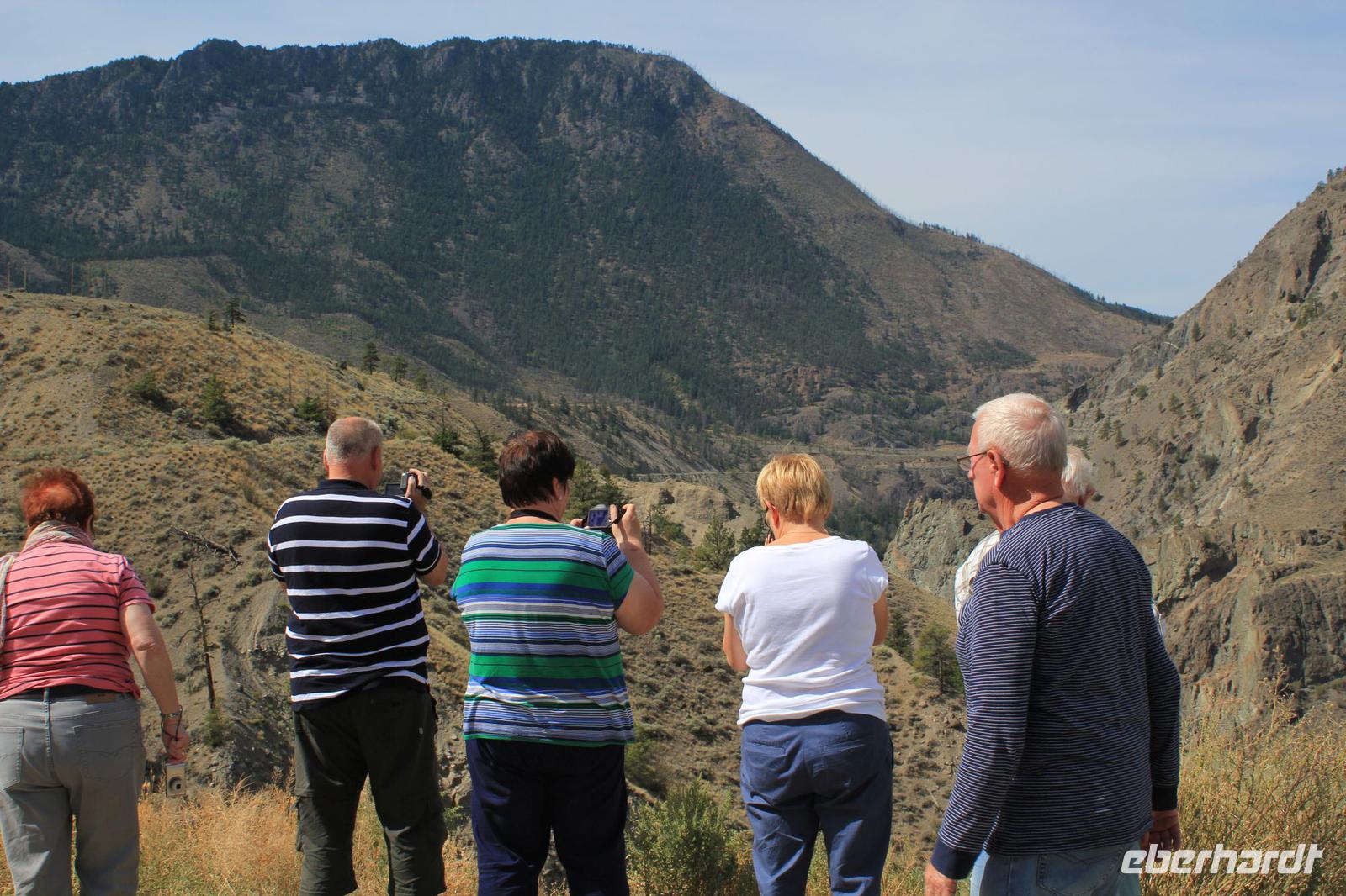 Unser nächster Stopp ist der Wells Grey Provincial Park in der Nähe von Clearwater. Hier besuchen wir den 60 m hohen, in eine tiefe Schlucht stürzenden, Spahats Wasserfall, der uns wieder mal die gewaltige Kraft des Wassers vor Augen führt. Nicht mehr weit ist es nun nach Kamploops. Unterwegs lauschen wir Victor, der uns einige interessante Landesdaten zu Kanada näher bringt. Die Landschaft ändert sich nun deutlich: kräftige Nadelwälder und sattes Grün werden abgelöst von trockener, gelber Hügellandschaft, gespickt mit Gelbkiefern und Sagebrush, einer Salbeiart. Beim Durchfahren der Gegend um Barriere sehen wir die Schattenseite einer einst waldigen Landschaft. Seit einem schweren Brand im Jahr 2005 bestimmen kilometerweit rußgeschwärzte, abgebrannte Bäume die umliegenden Hügel.