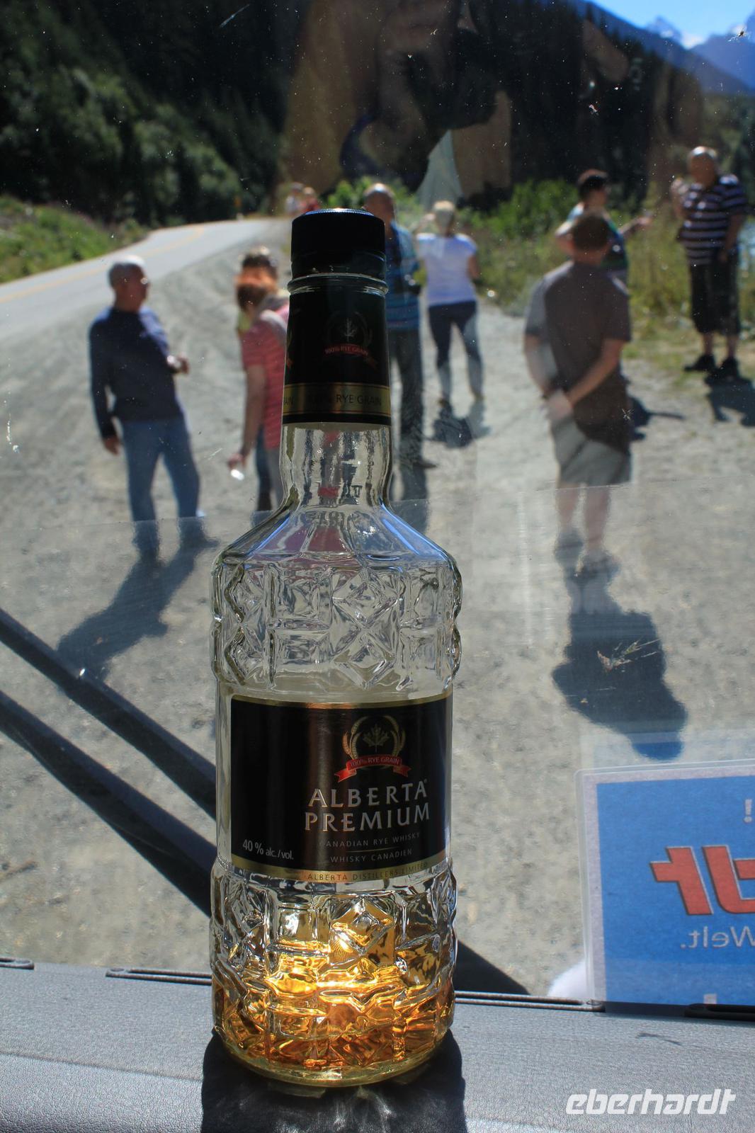 Unsere Mittagspause verbringen wir im Städtchen Lillooet. Hier lassen wir nun die karge Landschaft wieder hinter uns, denn wir durchqueren nun die Küstenberge auf unserem Weg nach Whistler. Diese Bergkette ist vulkanischen Ursprungs und nur eine einzige Straße führt über den Kamm. Schon sind wir wieder umgeben von dichten Wäldern und Schneegipfeln - wir hatten es schon vermisst! Von Elisa erfahren wir unterwegs interessantes über den West-Kanadier und seine Eigenheiten und genießen die vorbei ziehende Landschaft. Die Duffy Lake Road windet sich durch die steile Hochgebirgslandschaft nach oben und unser nächster Stopp soll am wunderschön grünen Duffy Lake stattfinden. Hier wartet bei herrlichstem Sonnenschein und traumhafter Kulisse eine Überraschung auf uns. Victor und Elisa servieren uns echten kanadischen „Alberta Premium" Whiskey - eisgekühlt! Bei diesem Ausblick lässt es sich gut anstoßen auf unsere tolle Reise - Cheers!